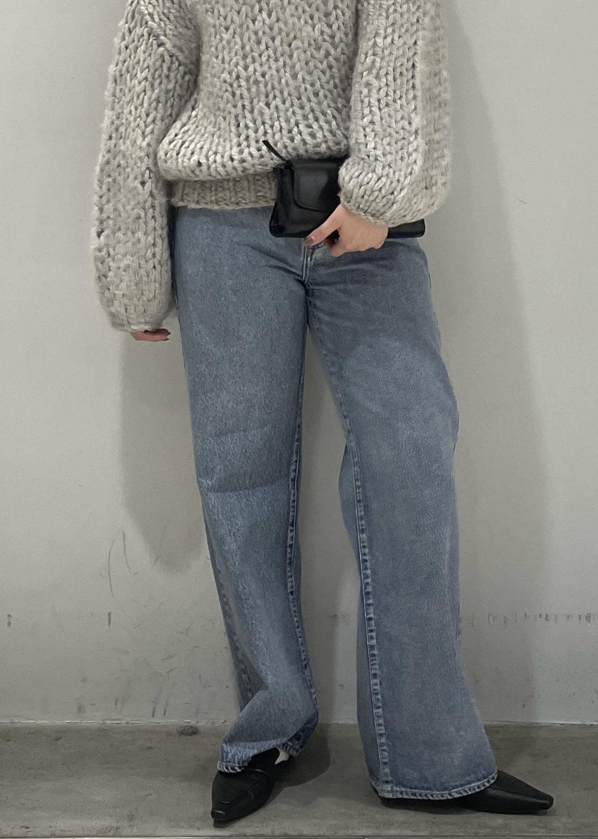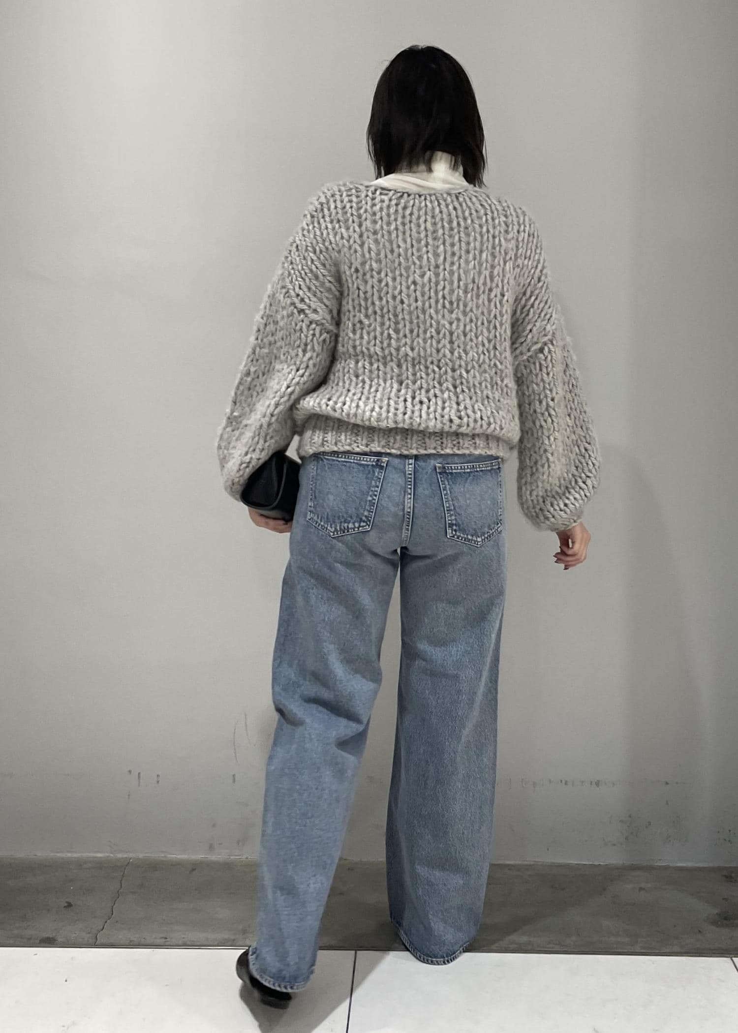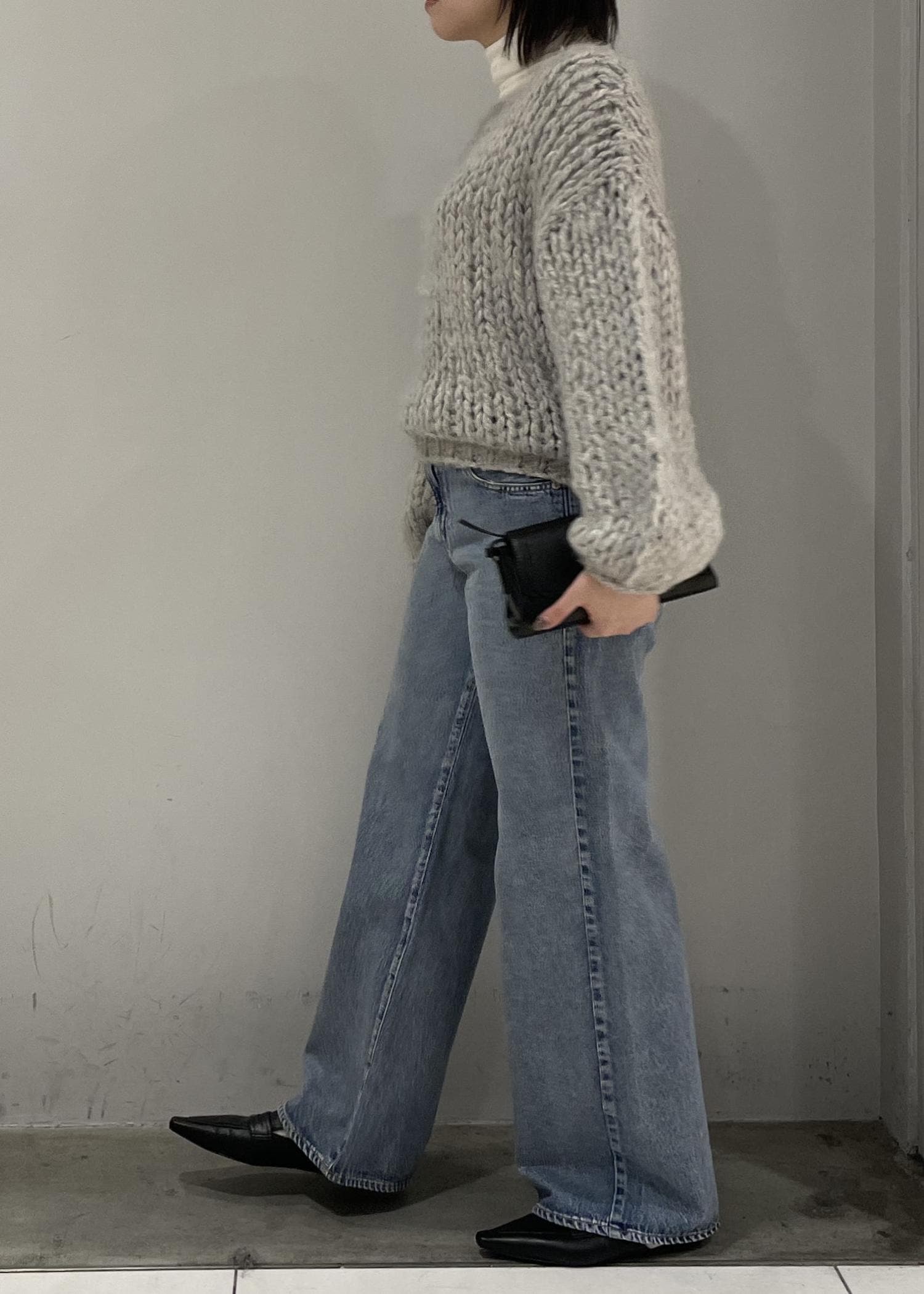 こちらのニットは首がざっくり空いているので、中に薄手のタートルネックを仕込みました!タートルネックには程よく透け感のあるものをチョイスして抜け感を出せるように意識しました◎