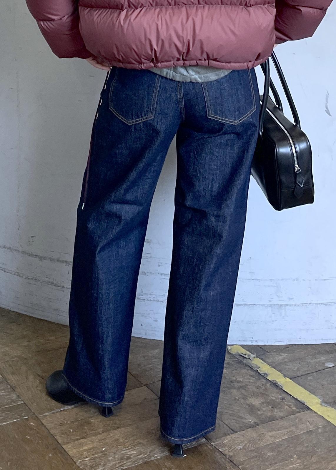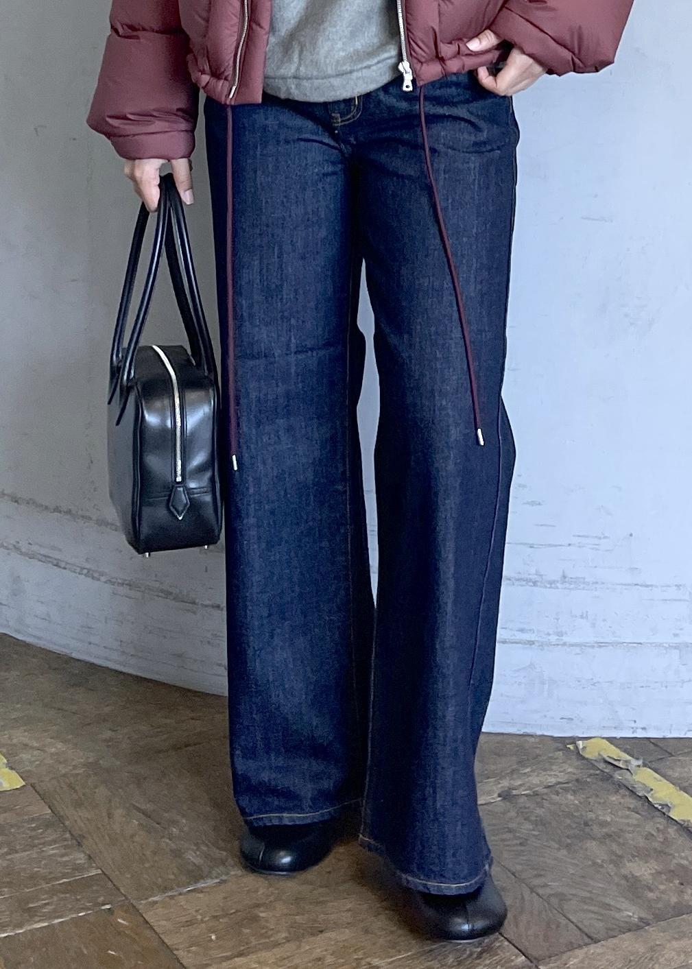 ボトムには濃紺のデニムを合わせて、上半身のボリュームをすっきり見せるように。縦にストンと落ちるシルエットのおかげで、ラフなのにスタイル良く見えるのがポイントです。