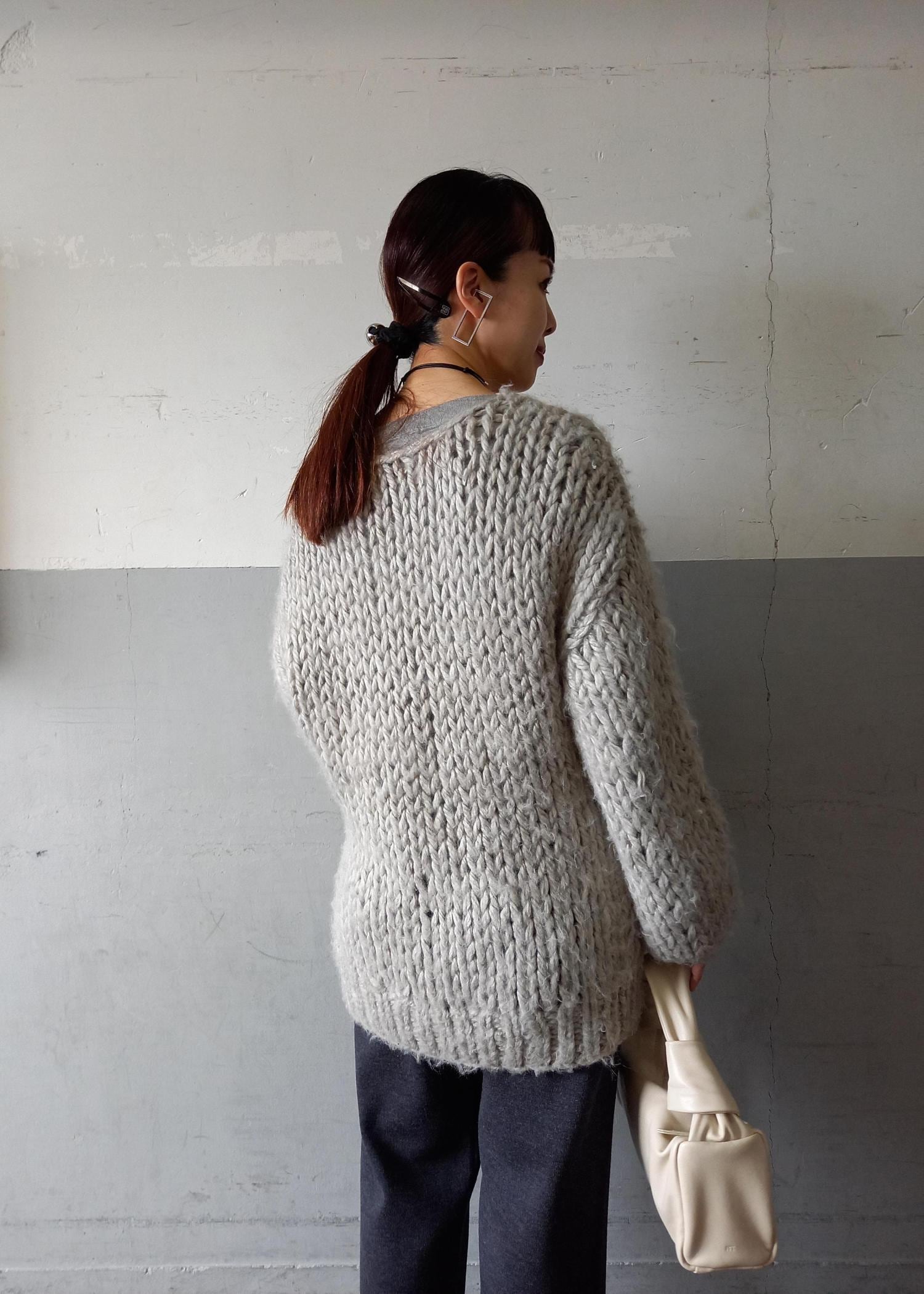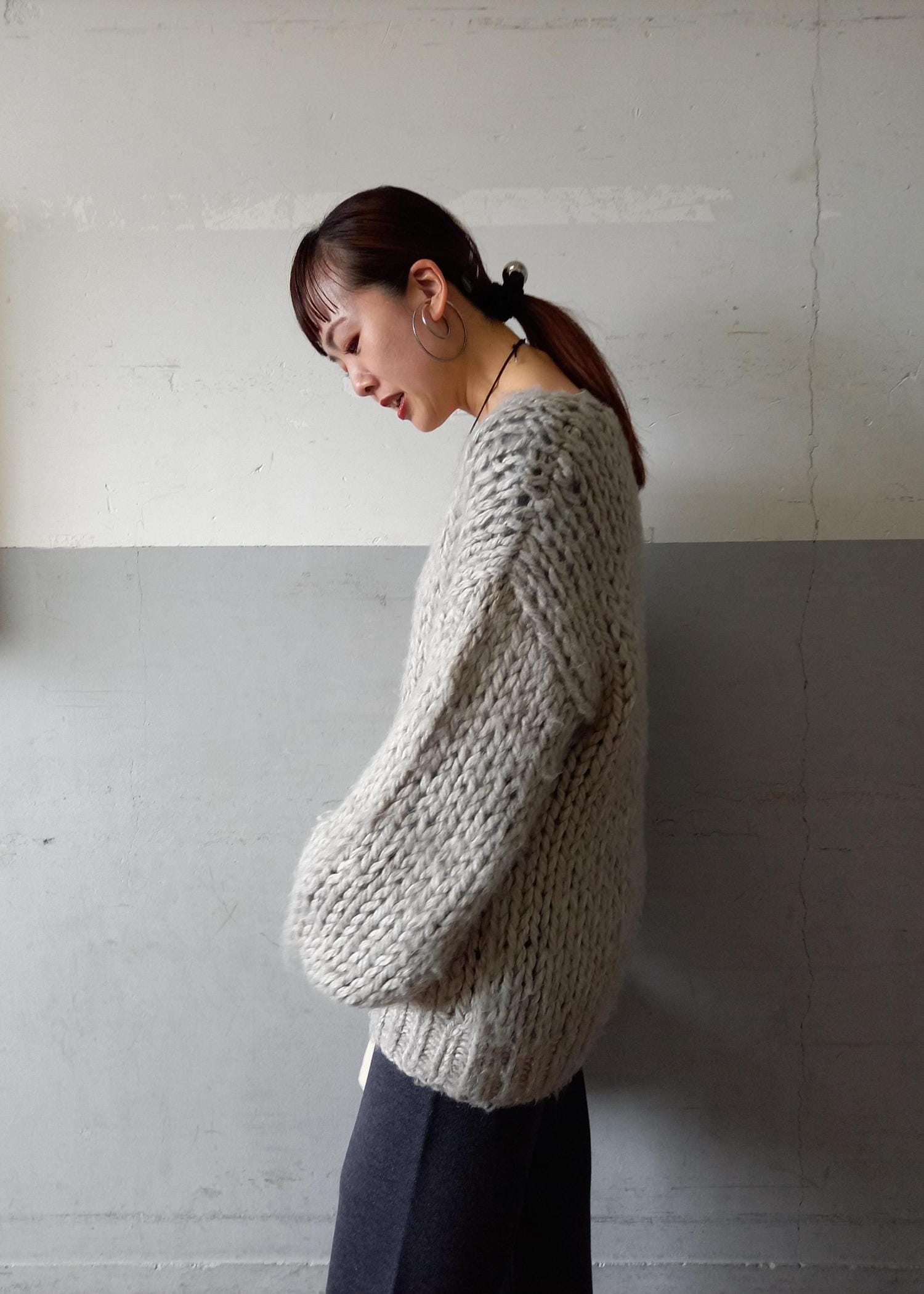 ローゲージのざっくりとした編み地がすごく可愛いです♡肉厚でボリュームありそうですが、首もとの程よい抜け感もあり、女性らしいゆるっとした雰囲気でお召しいただけます◎ざっくり編みですがとっても暖かいですよ☺️