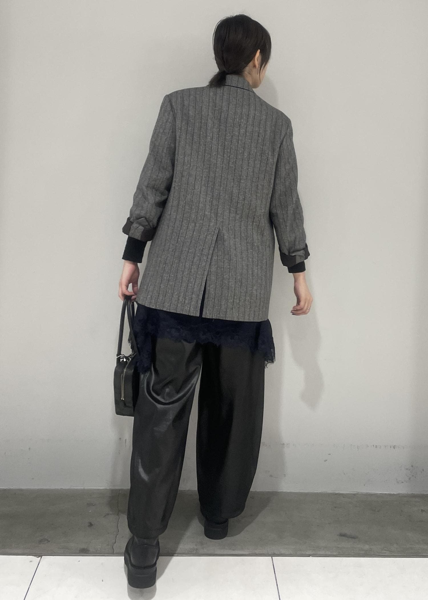 ストライプジャケットとレザー調のボトムスの合わせは、クールでかっこいい印象に仕上げてくれます!