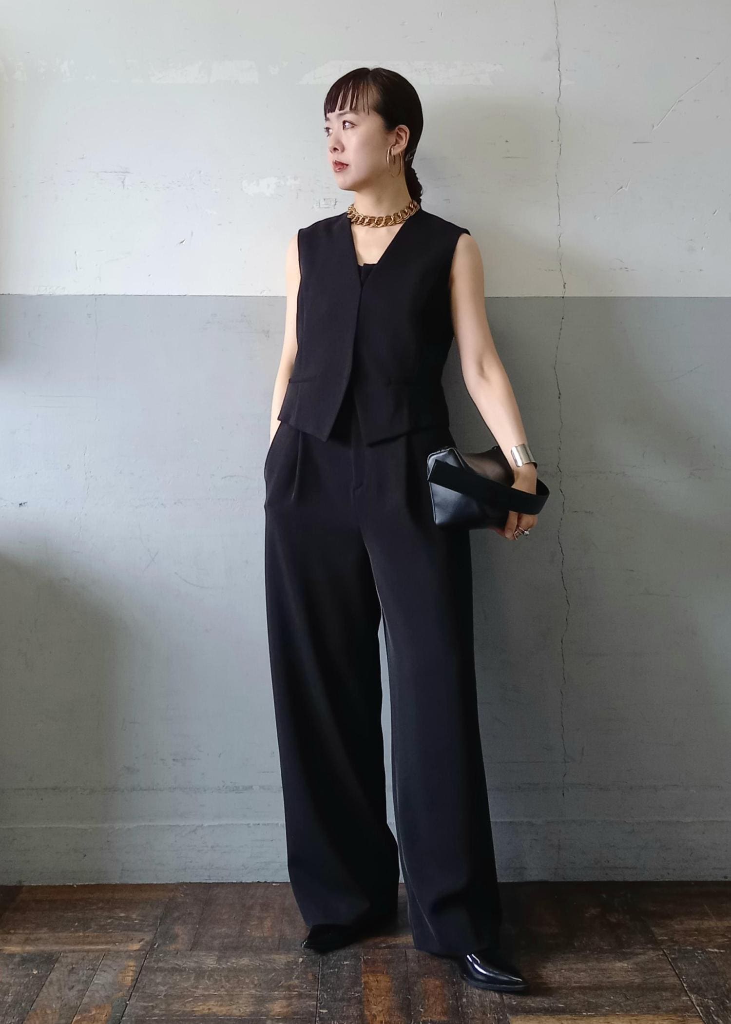 シンプルながら立体感のあるレイヤードで、こなれた雰囲気を楽しめるコーディネートです。