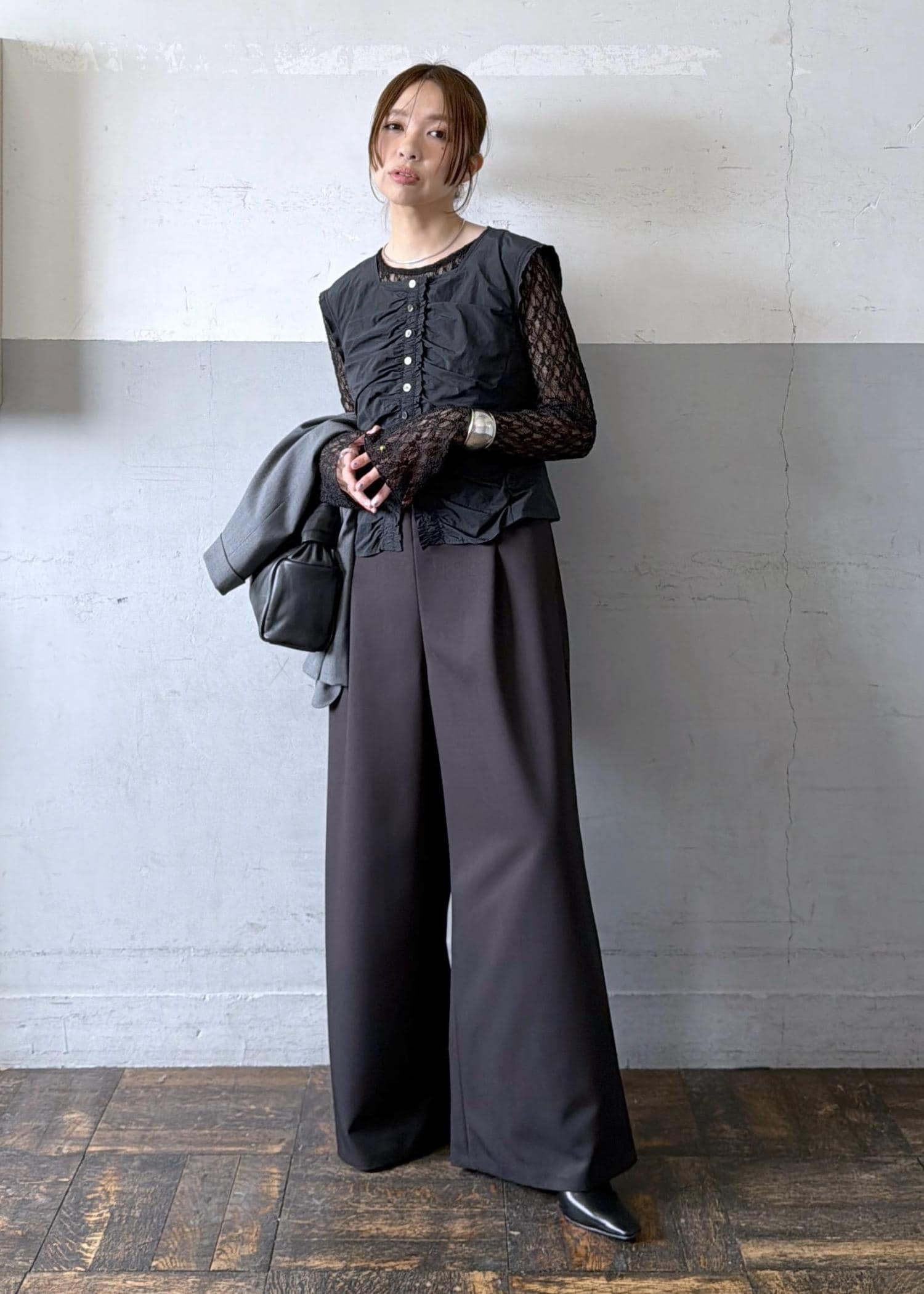 アウターのインナーには、ふわっと軽いカーディガンを重ねて奥行きをプラスしています。
