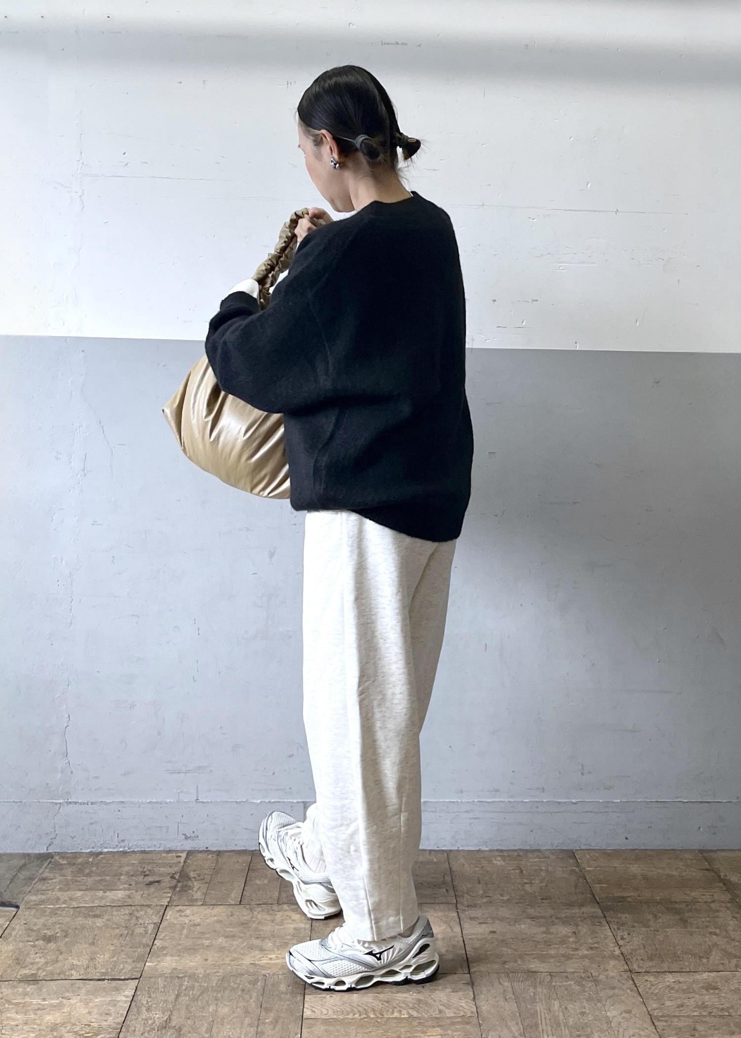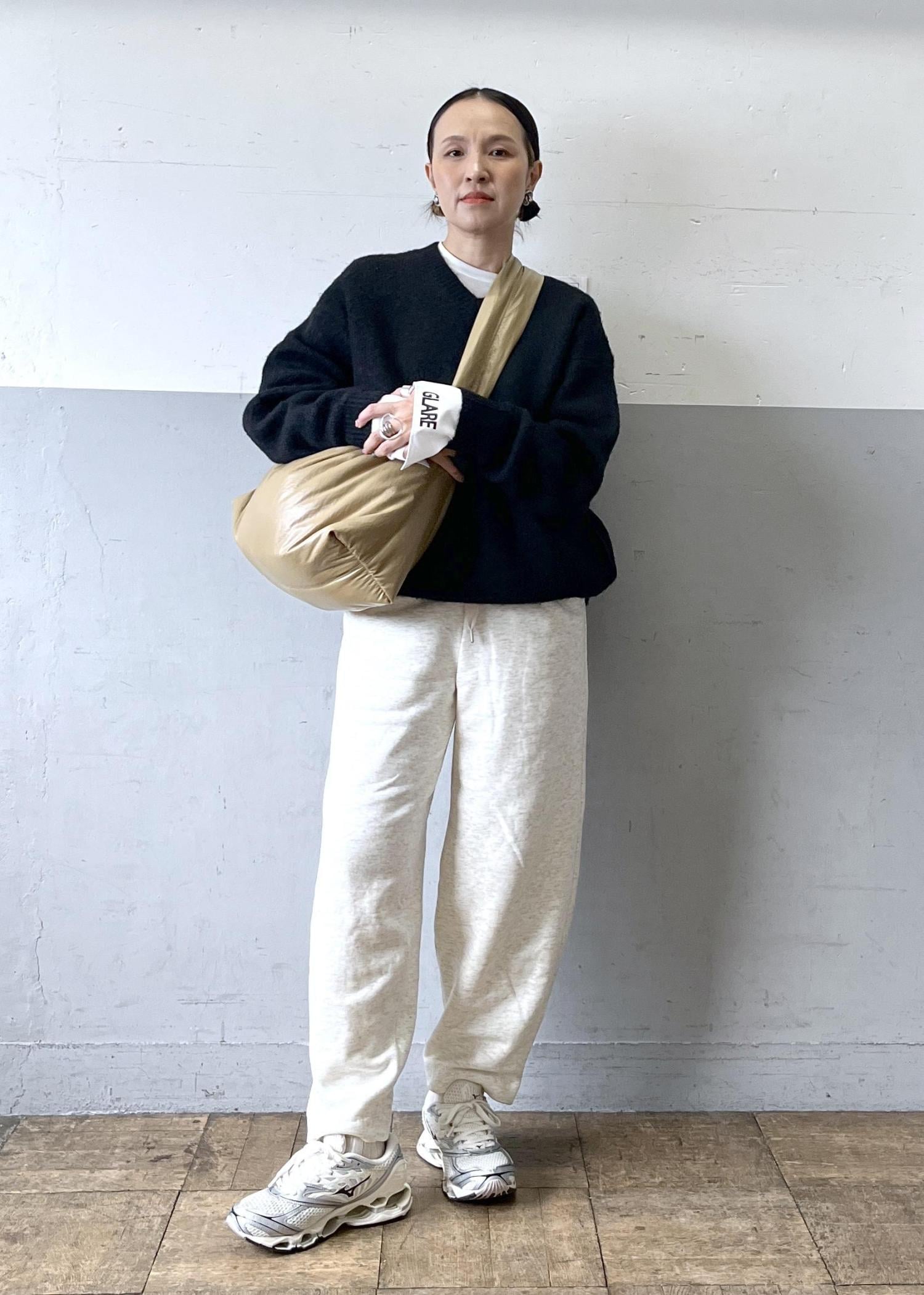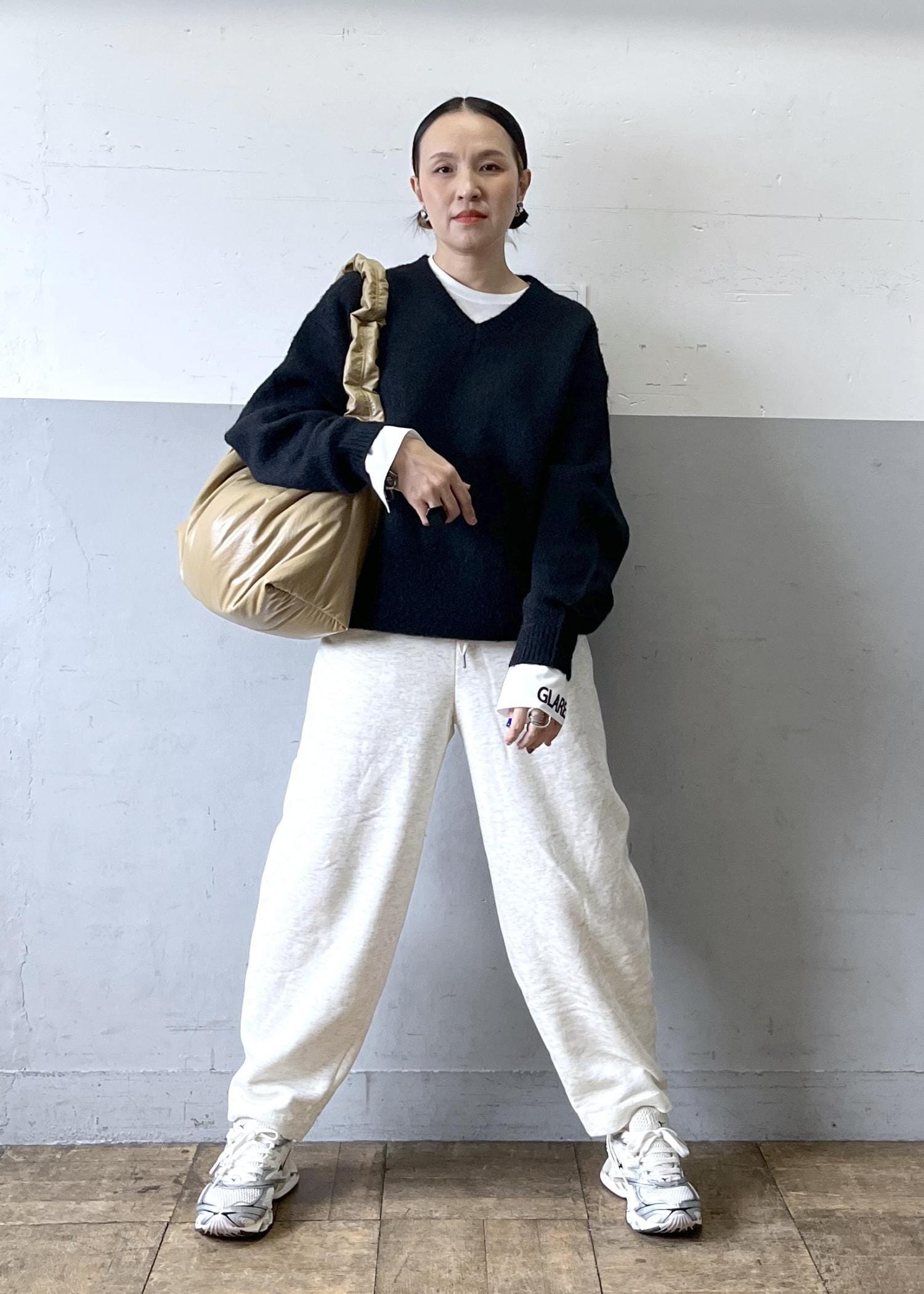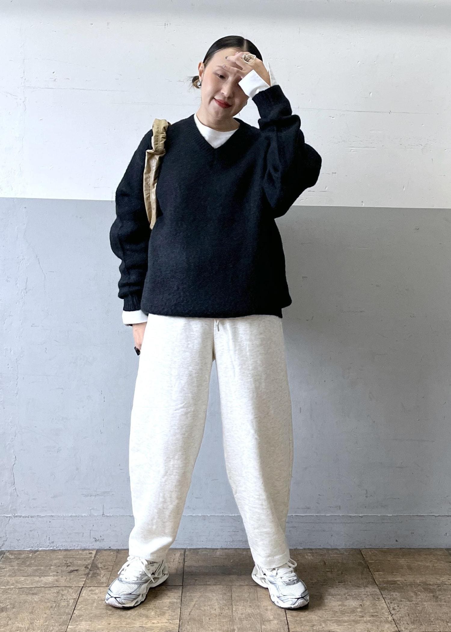 程よいボリュームのVネックニットに、ホワイトのスウェットパンツを合わせて