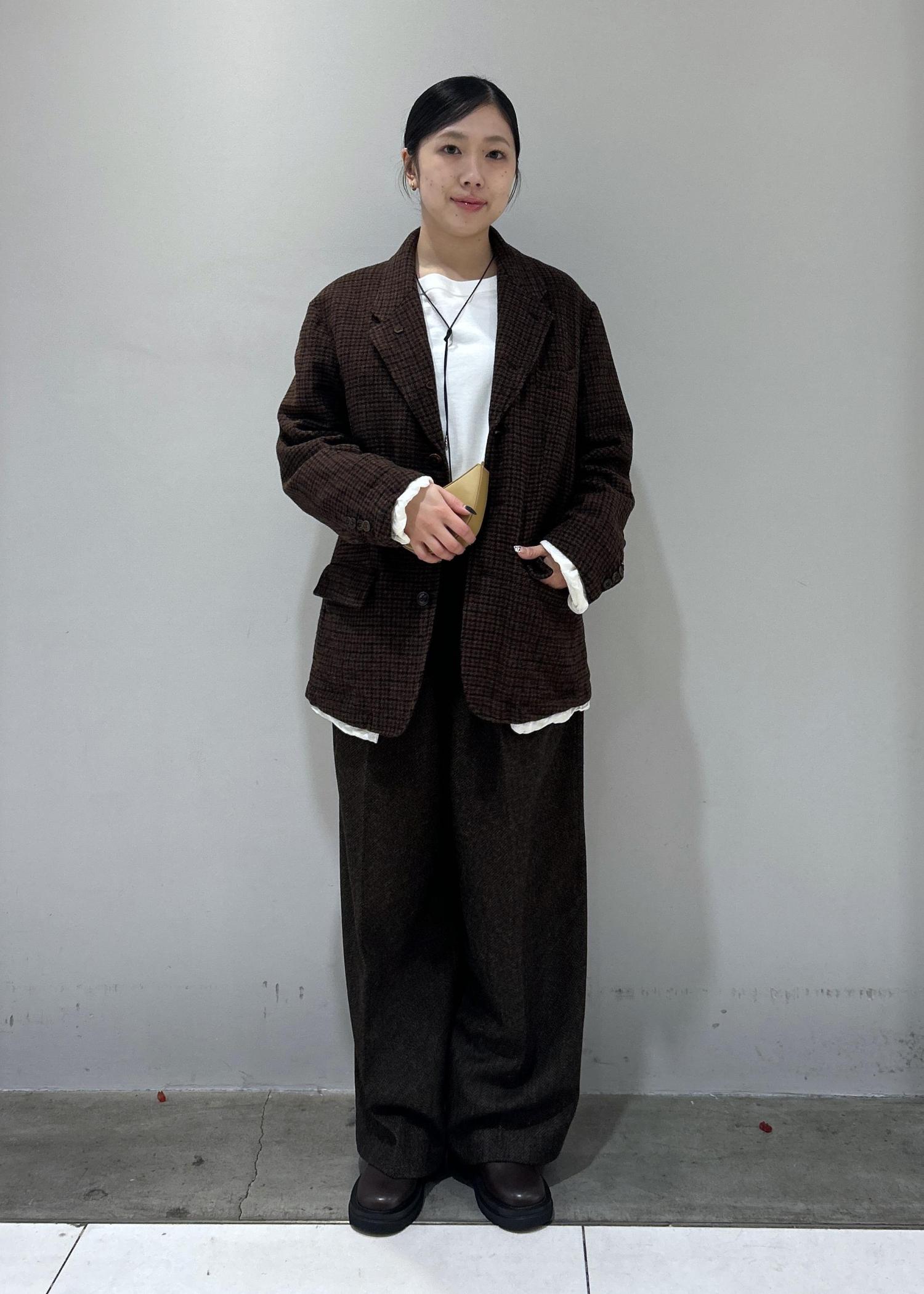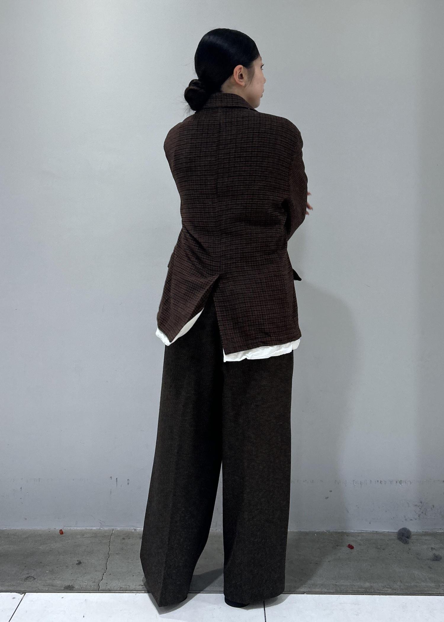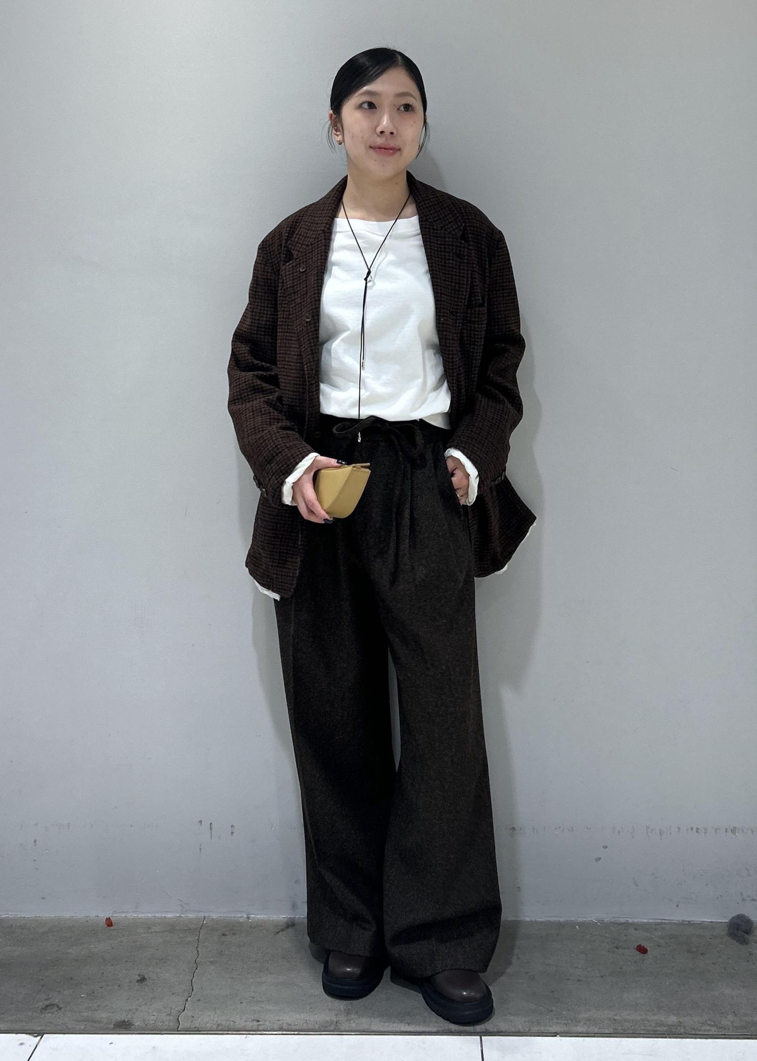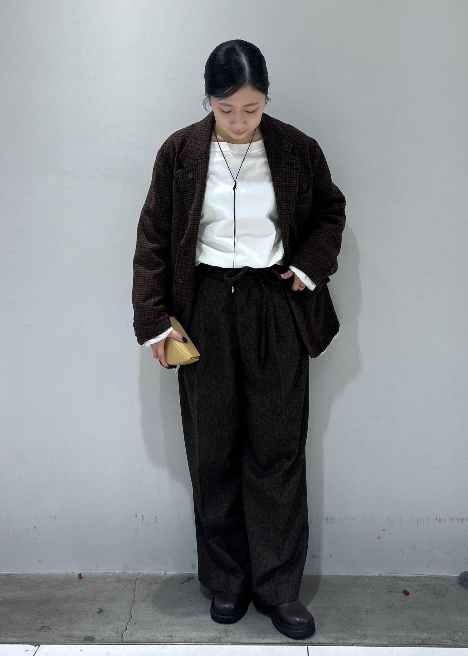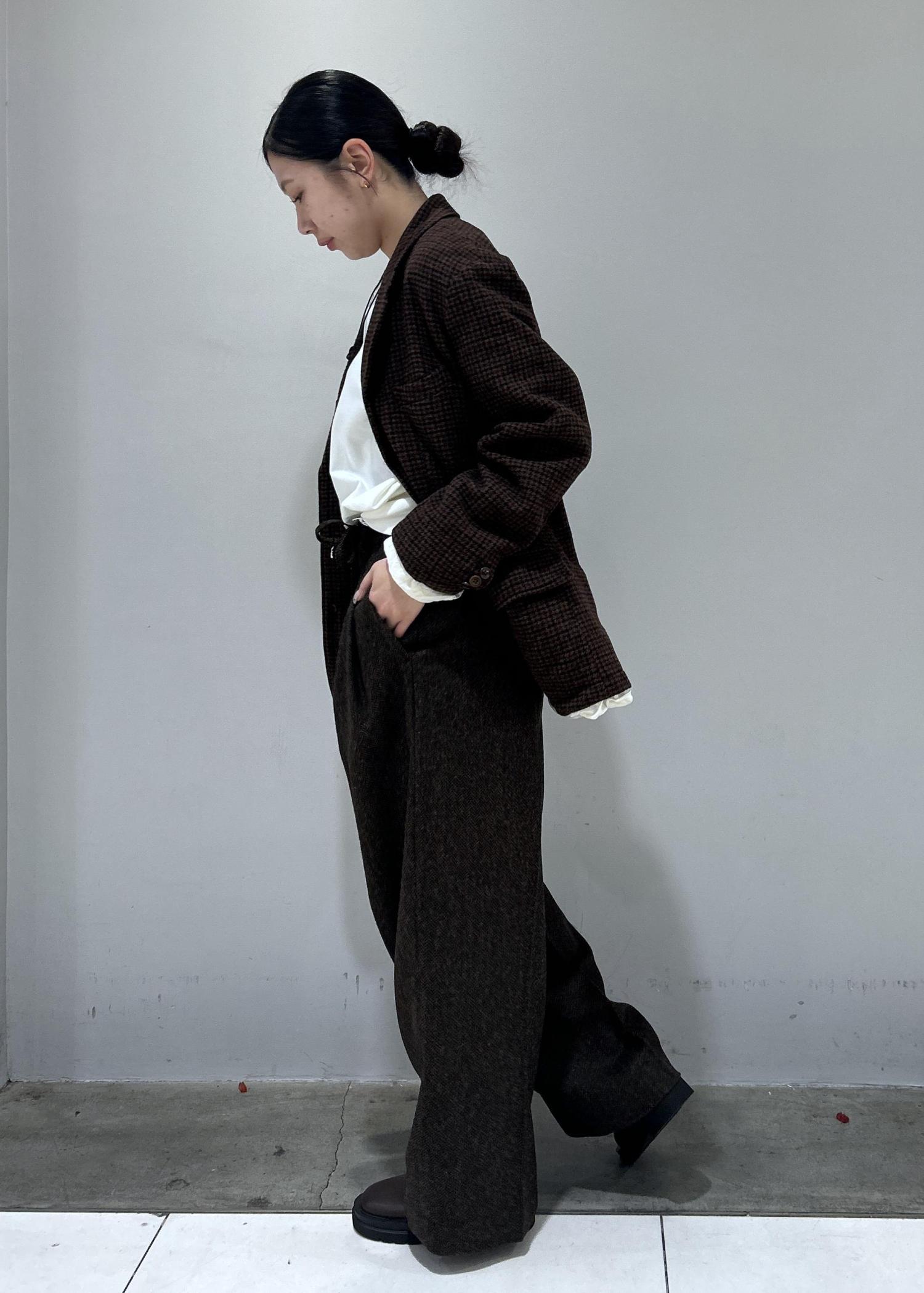 EMOELLE【EMOELLE】へリンボーンワイドパンツダークブラウン系 / 38¥39,600レビュー凹凸のあるウールパンツで、膝の辺りまで裏地が付いておりチクチク感も気にせず着ていただけます。