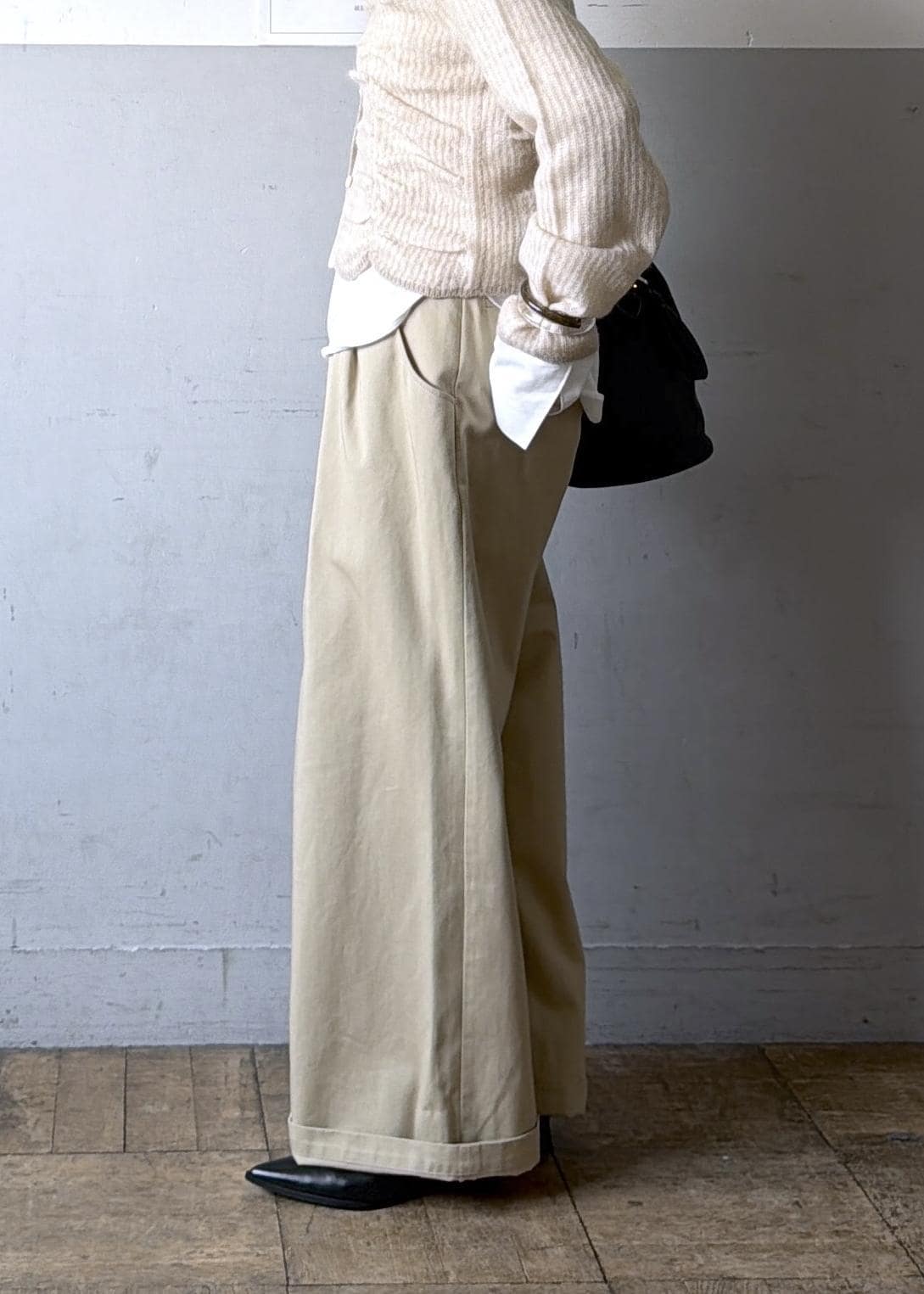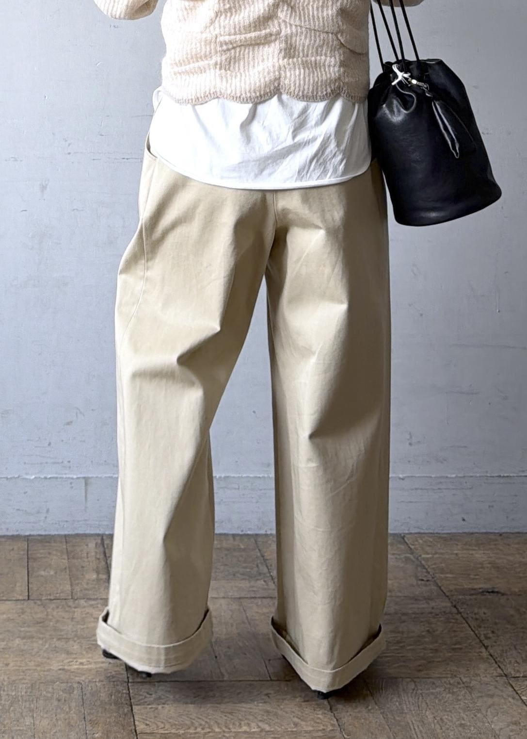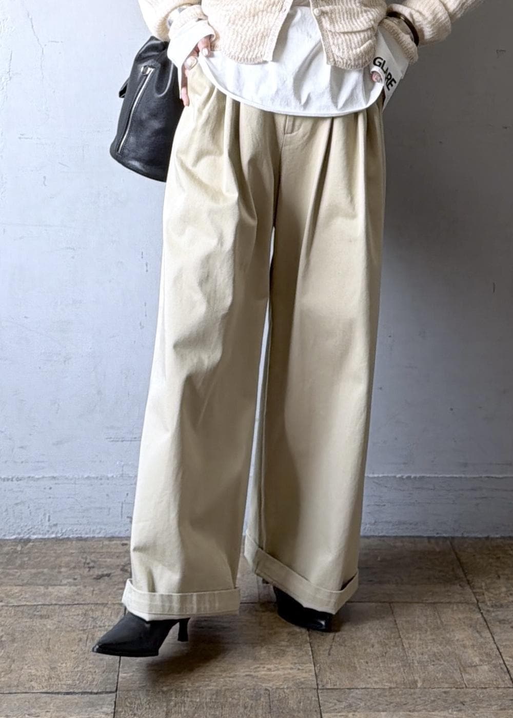 ADAM ET ROPÉ FEMME3タックワイドチノパンツベージュ / 36¥22,000レビューワイドシルエットなのでヒップ・腰・腿のカバーができますが、ウエストはジャストで履けるので着膨れにくいです。