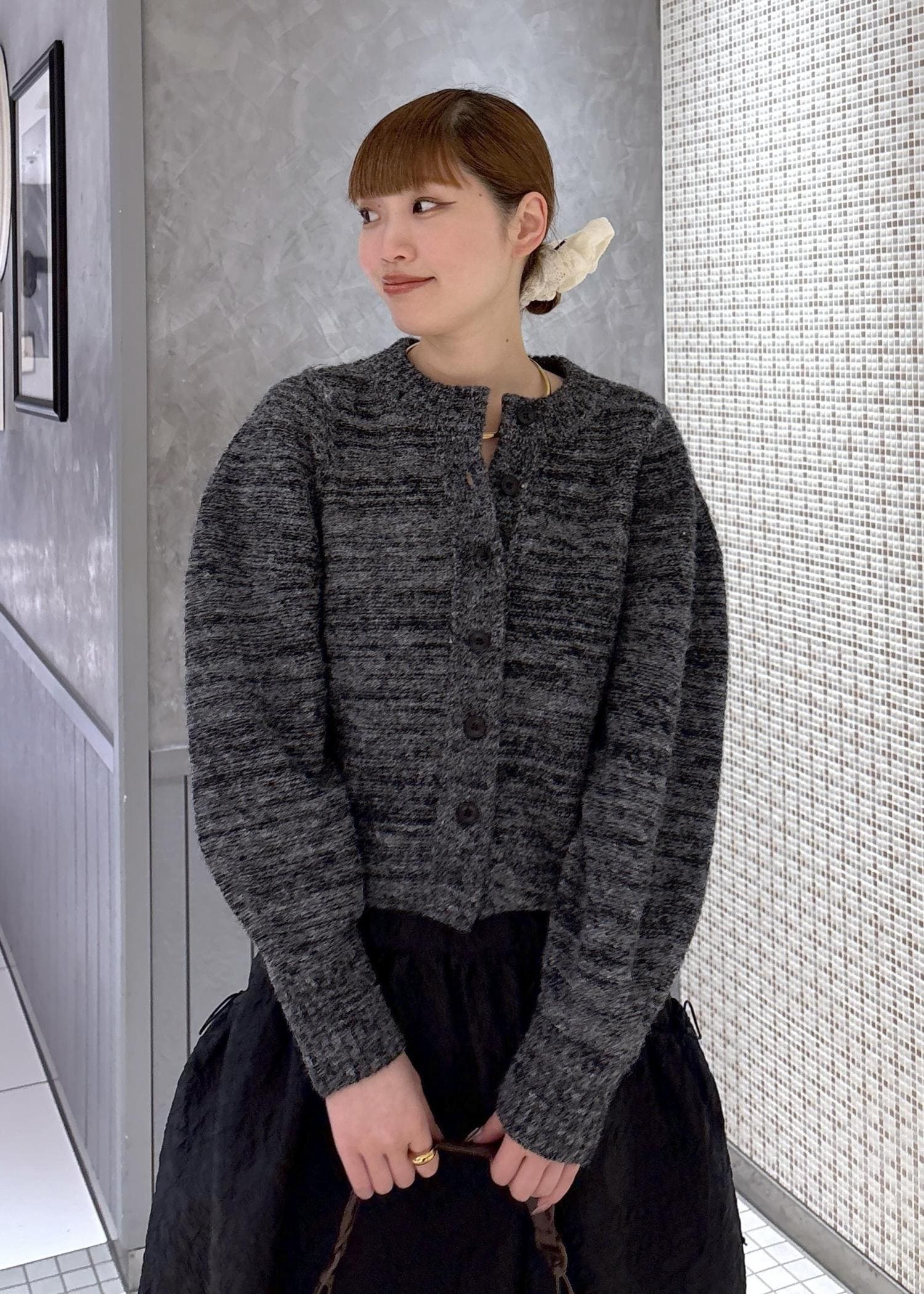 コンパクトで軽く袖感の丸さが女性らしいカーディガンです。ただその甘すぎず着れるのがポイントです。