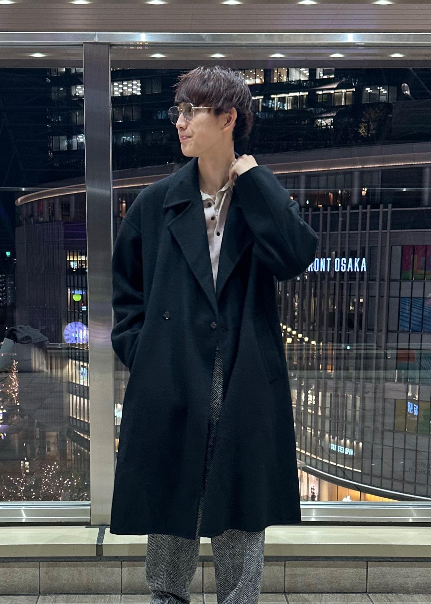 黒のロングコートを主役にピンクのニットポロ、グレーのヘリンボーンパンツを合わせた、ピンクの差し色コーデです。メリノウールを使用したコートは暖かく、軽やかで快適です。ニットもカシミヤ100%で肌触り最高です。機能面もオシャレ面も両方兼ね備えたコーデに仕上げました。冬はもちろん、配色としては春に特に映える色合いなので、そちらも是非参考にしてみてください。