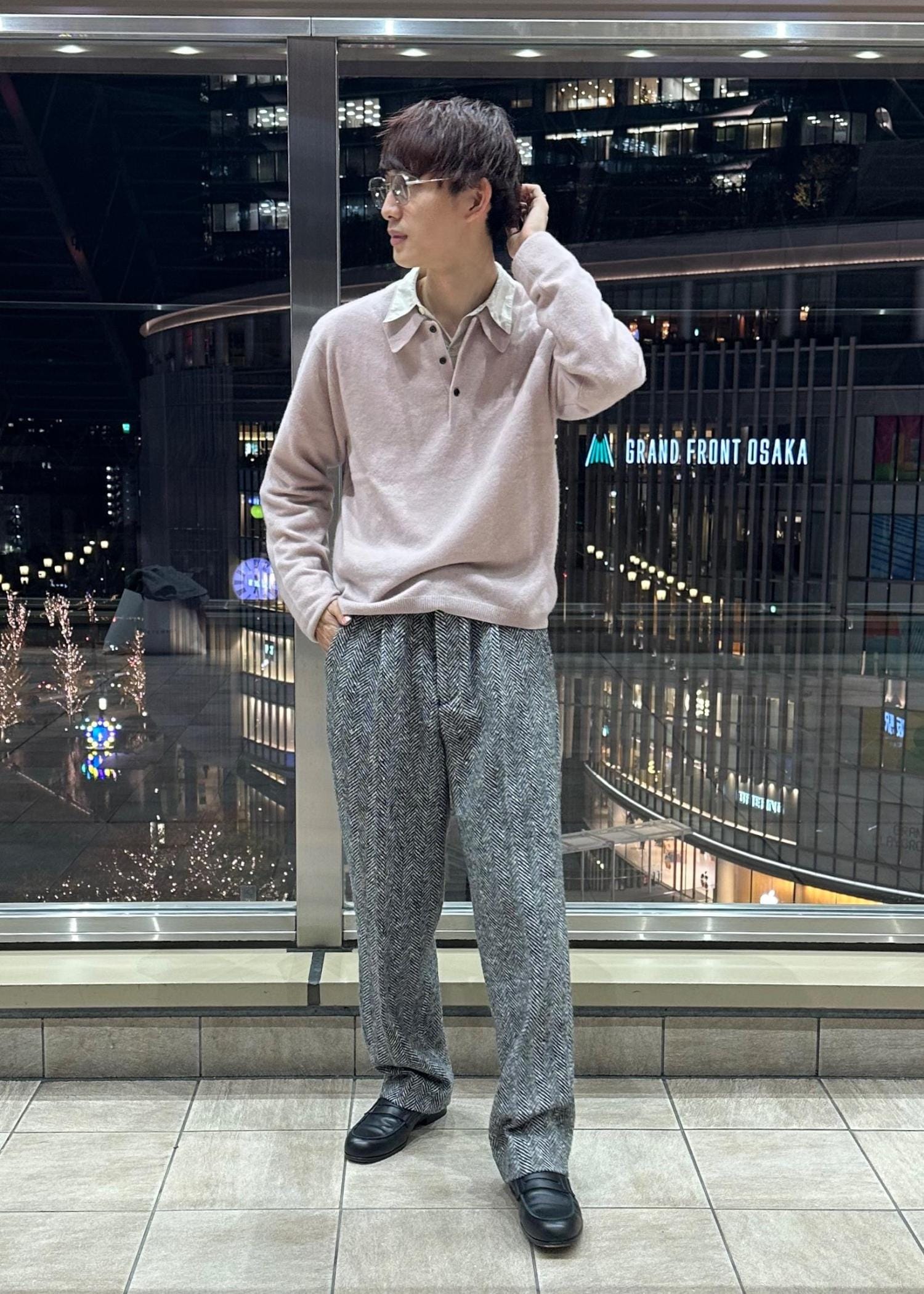ヘリンボーン柄のスラックス。やや長めの丈感、テーパードシルエットで下にきれいに落ちるラインです。上品でクラシカルな雰囲気ながらもカジュアルなスタイリングやスニーカーなどとも相性良く、合わせやすいです。