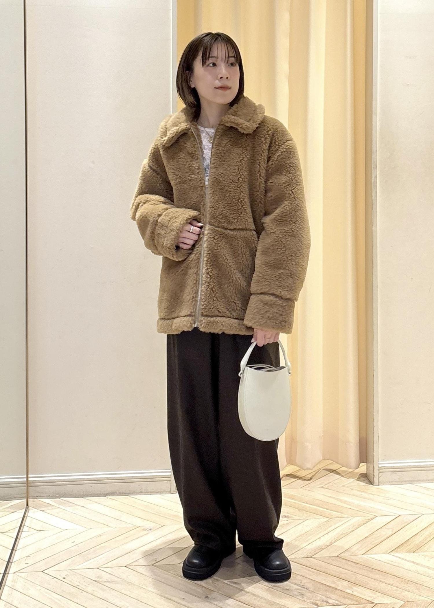 ボアのブルゾンは襟が少し大きめなので小顔効果もあり、程よくゆったりと着れるので少し分厚めなニットを着ても着やすいです◎