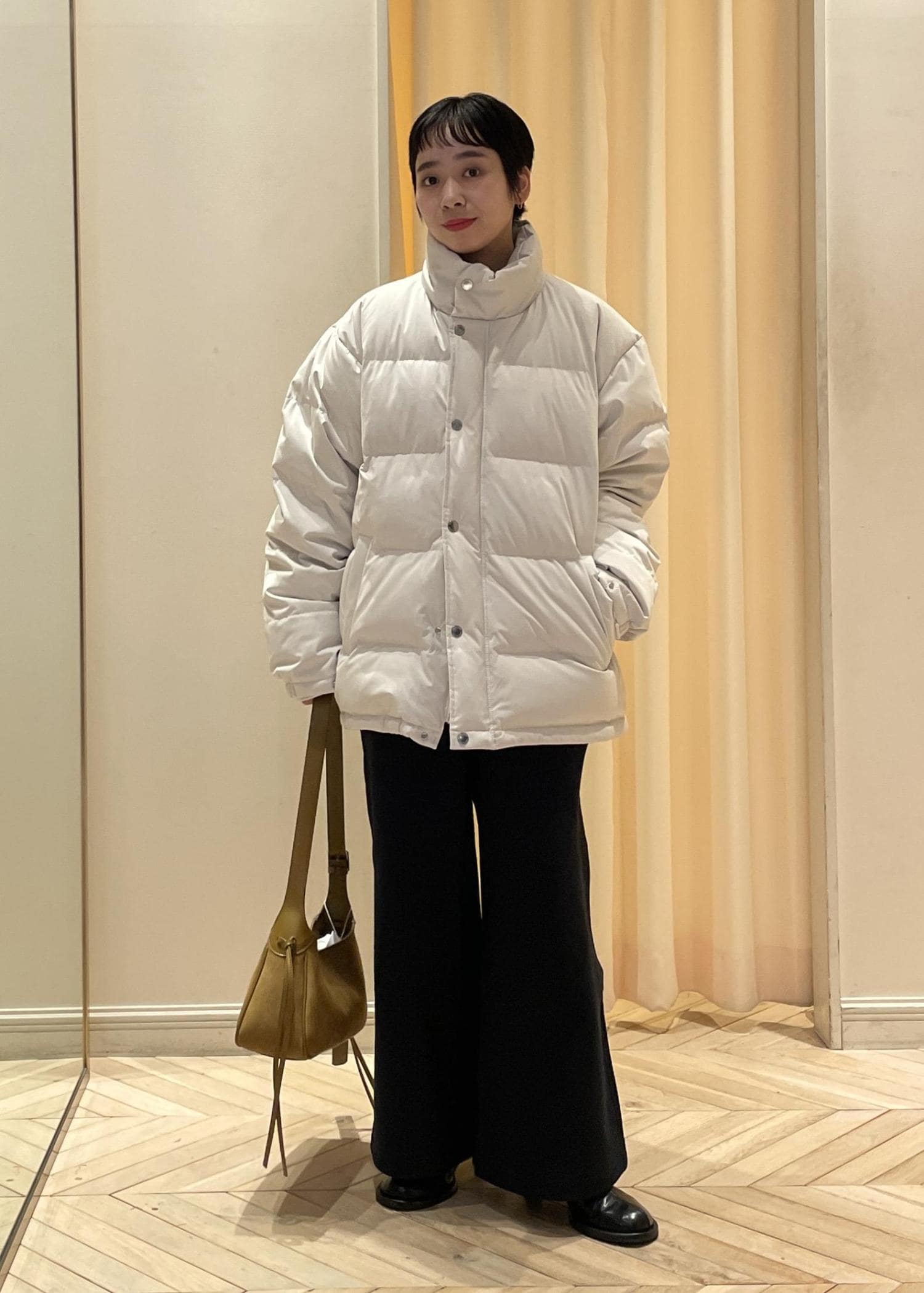 ウール地なのでカジュアル過ぎずに着用でき、体のラインを拾いすぎないので着やすいです! -