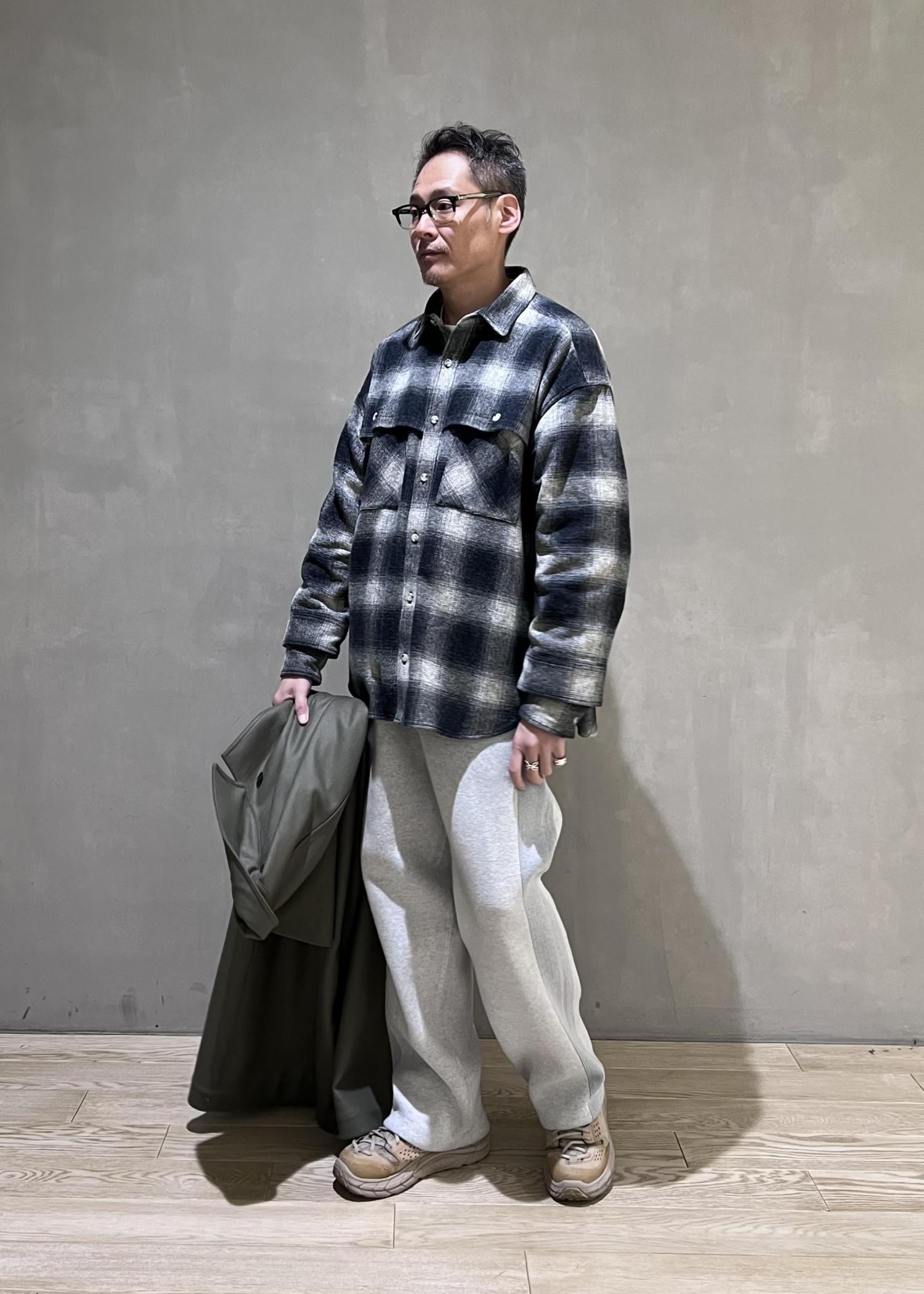 オーセンティックさとモダンな印象のコートに、アウターライクなシャツとスエットニットパンツでラフな印象でスタイリングしました!