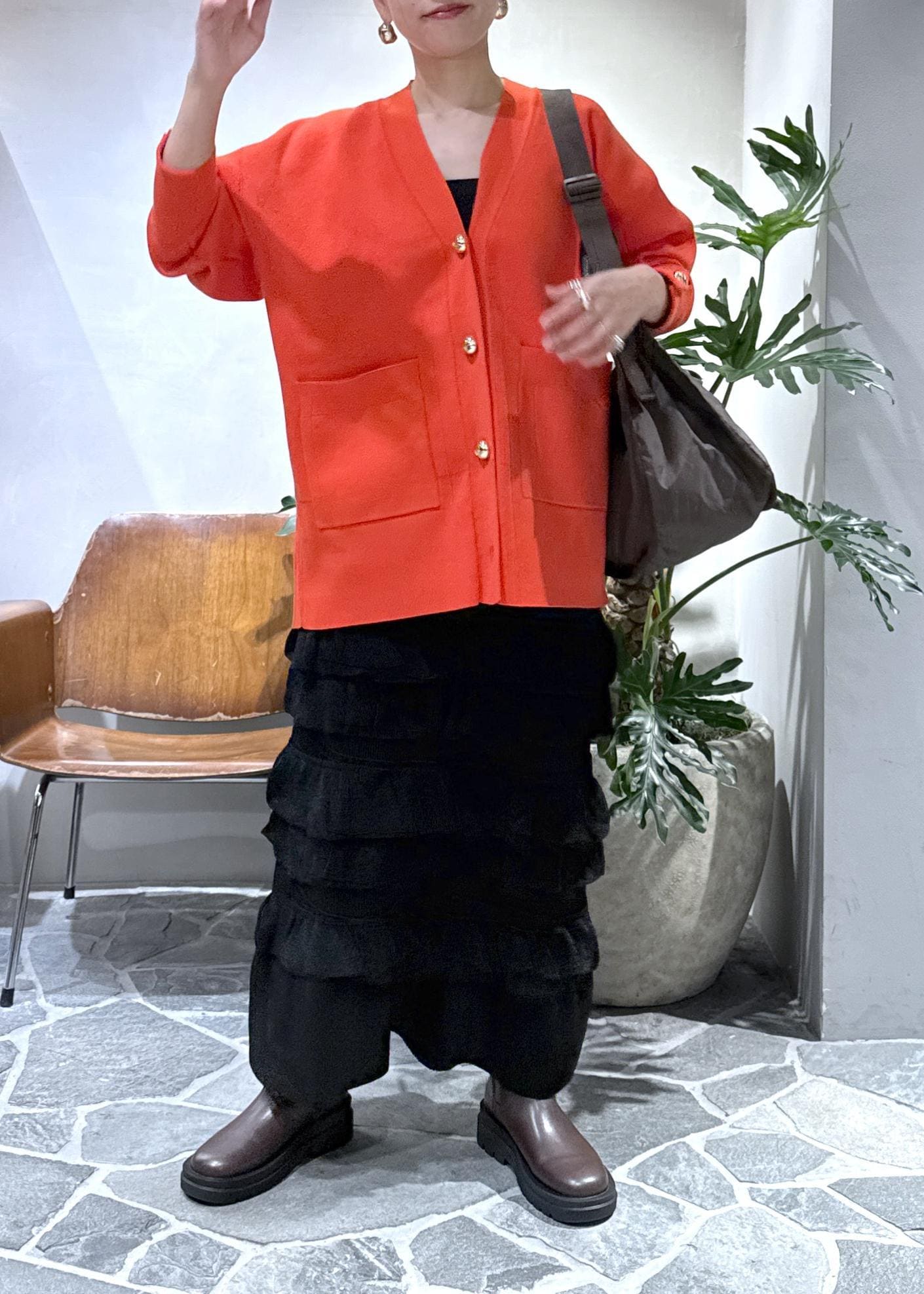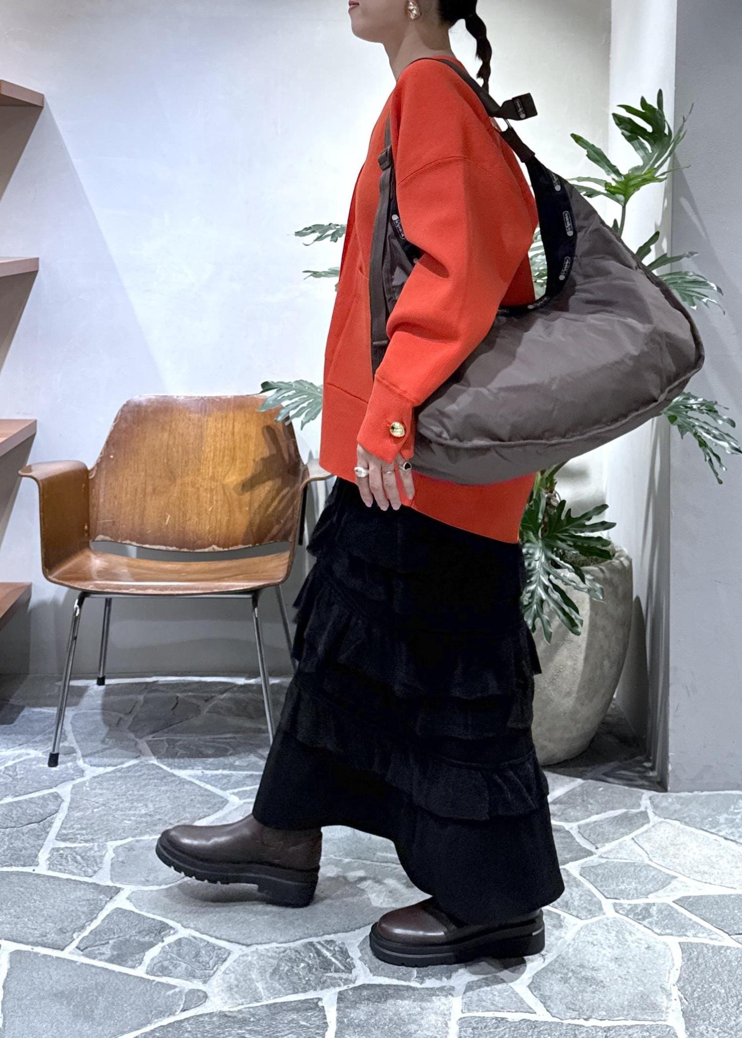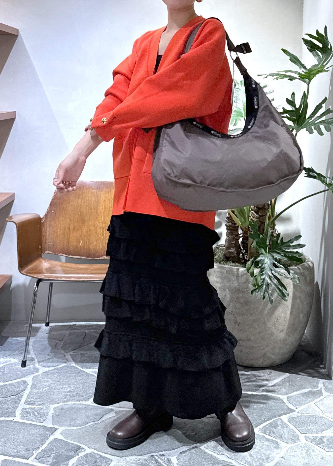 オレンジが生えるカーディガンに、ブラウンのLeSportsacを持って柔らかさのある大人カジュアルなスタイリングにしました!