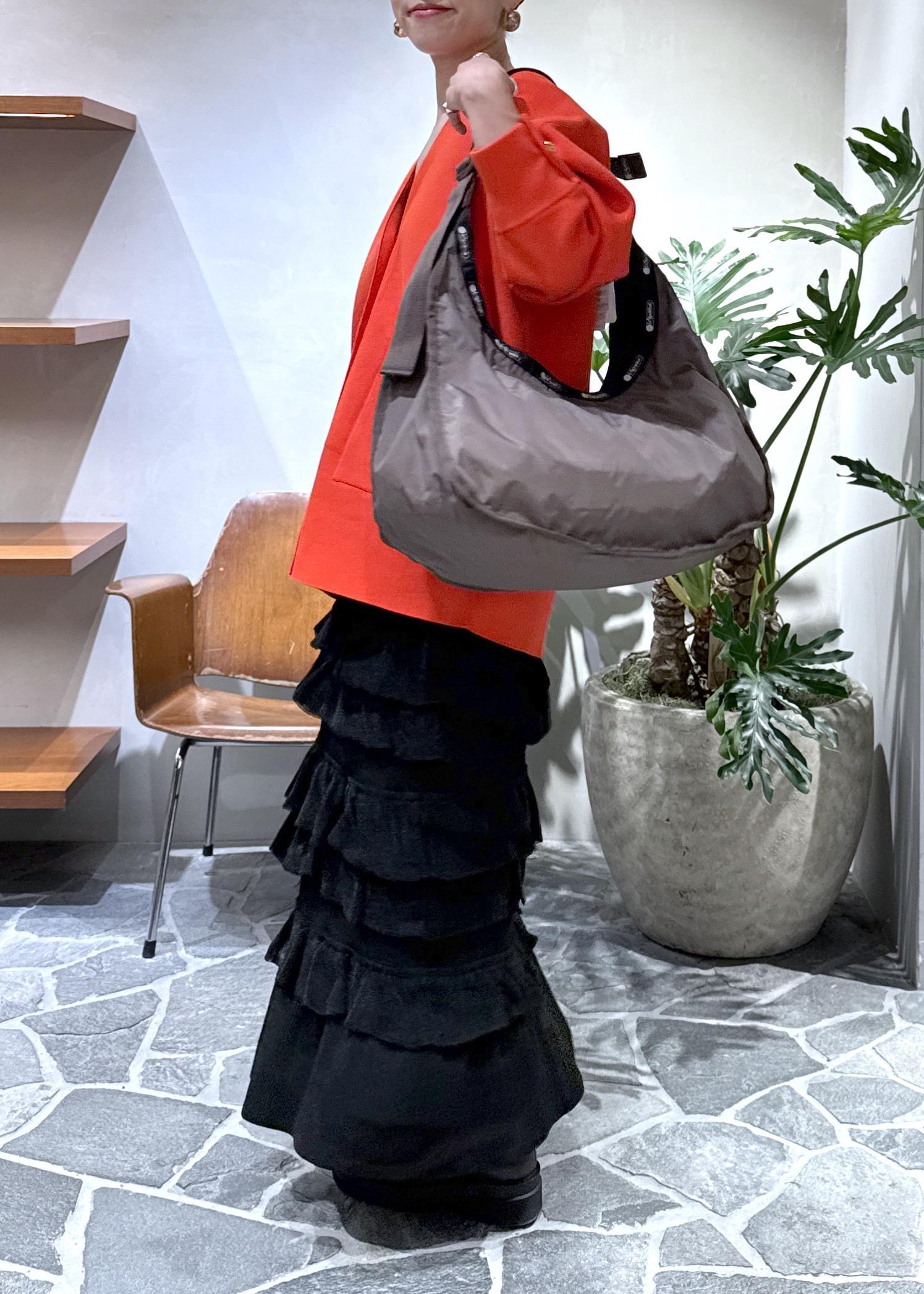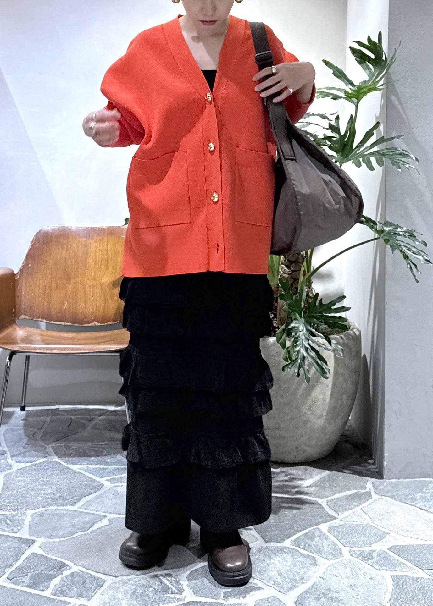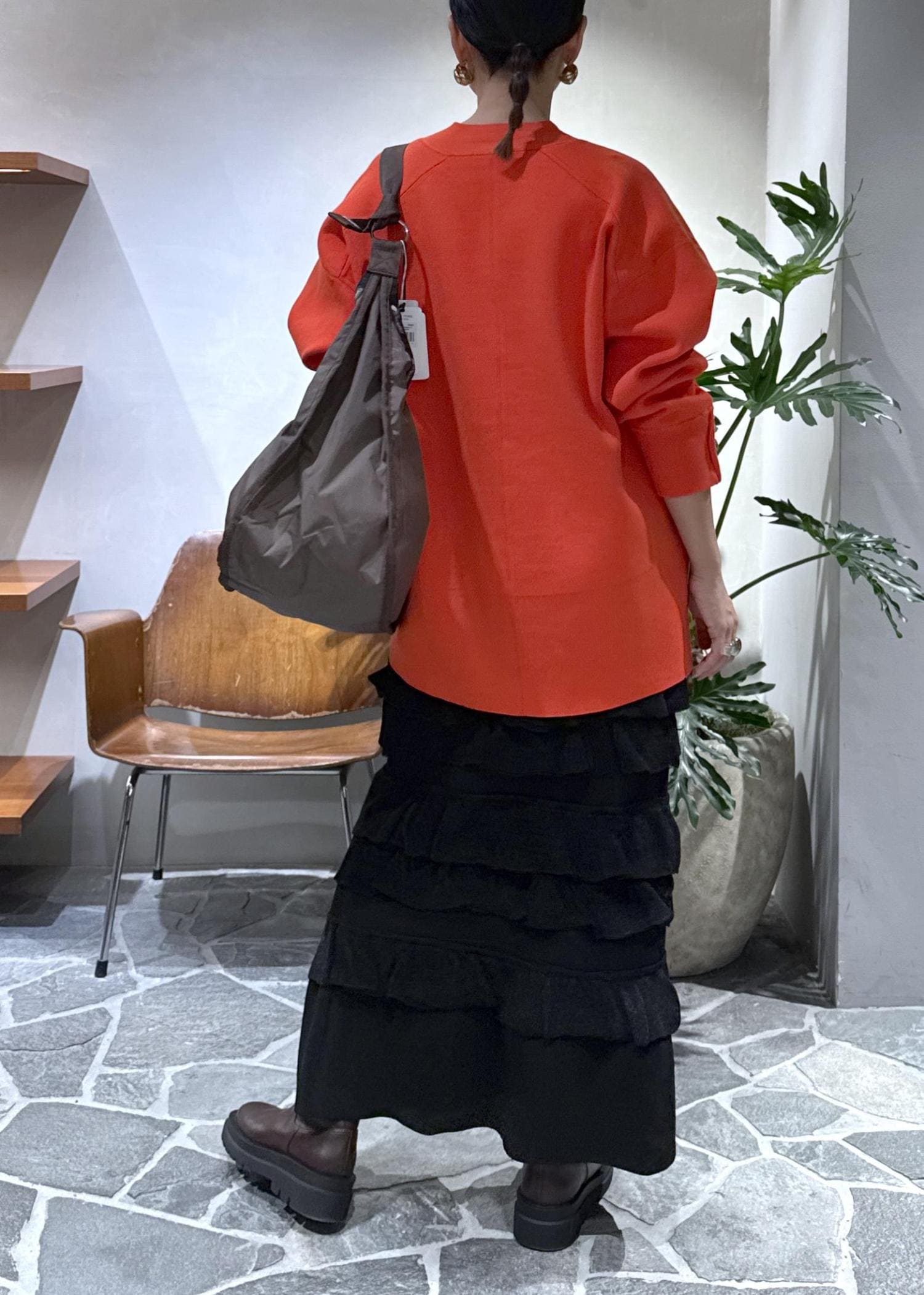 オレンジが生えるカーディガンに、ブラウンのLeSportsacを持って柔らかさのある大人カジュアルなスタイリングにしました!