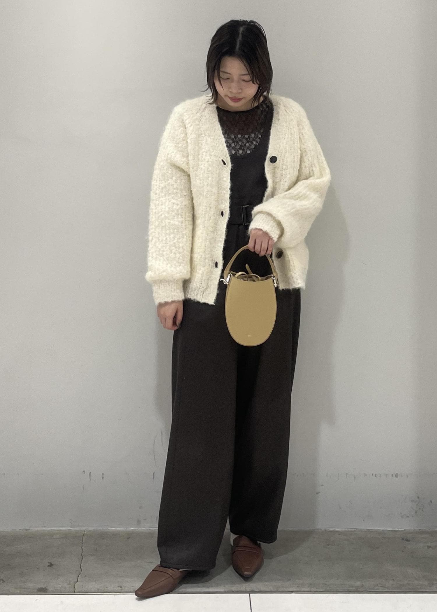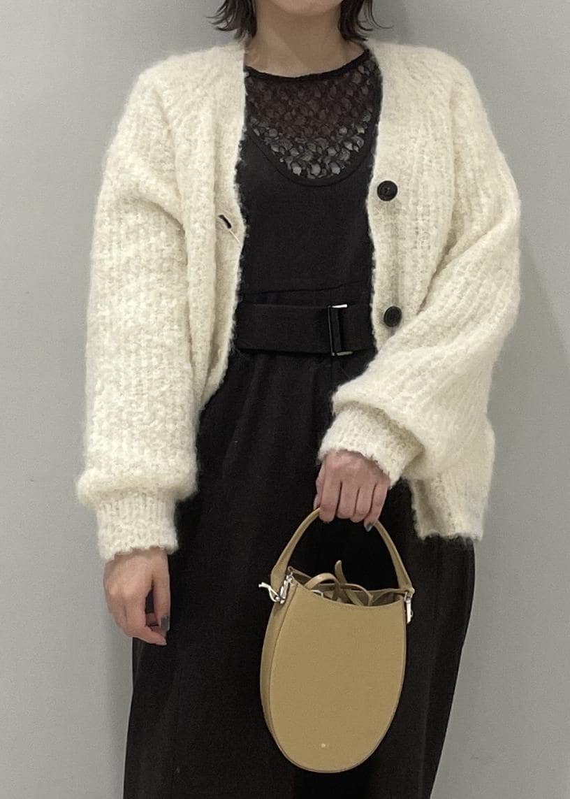 中にはレーストップスを仕込んで、抜け感を出しながらも防寒はしたいのでアウターにはもこもこのカーデをチョイス!