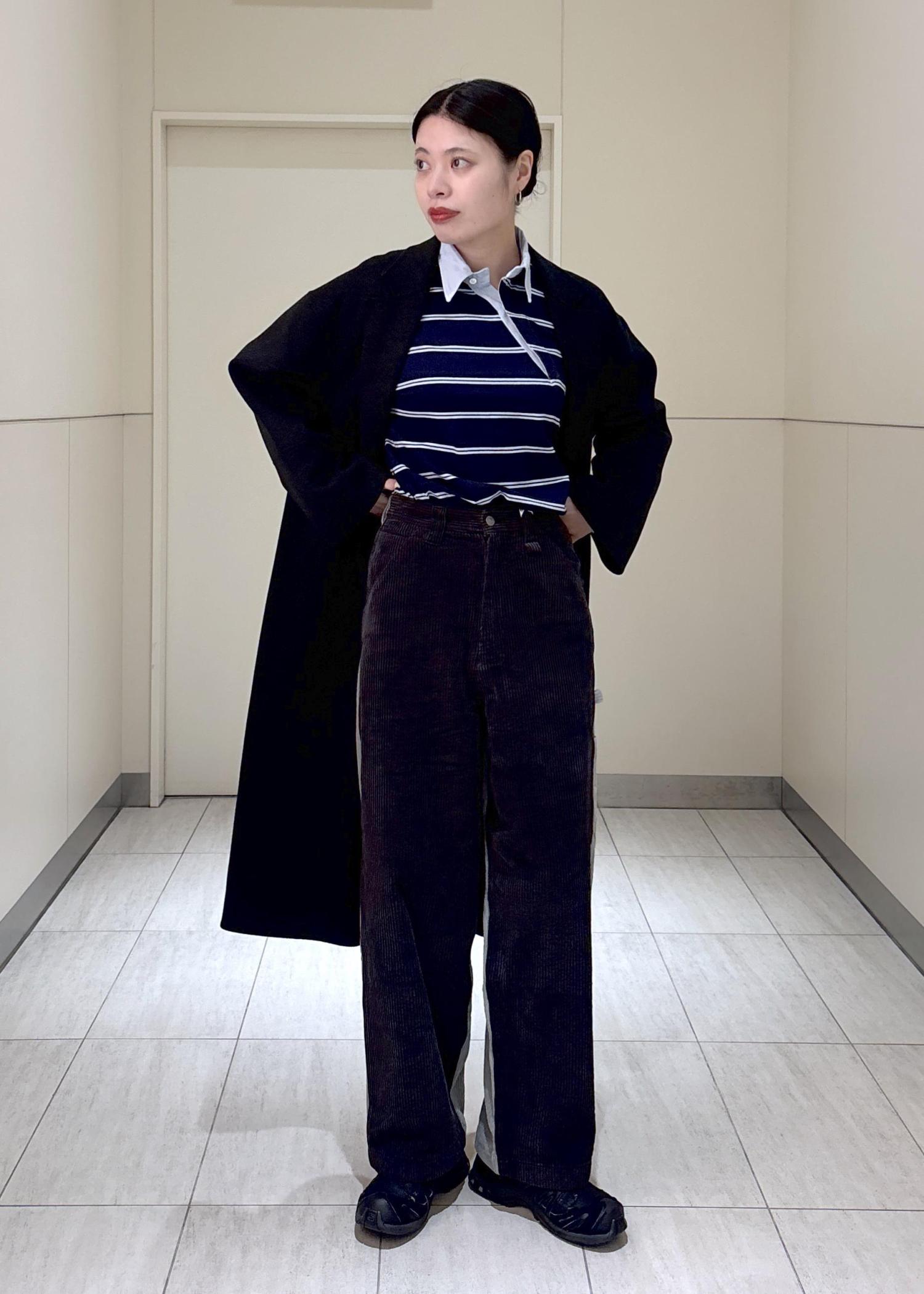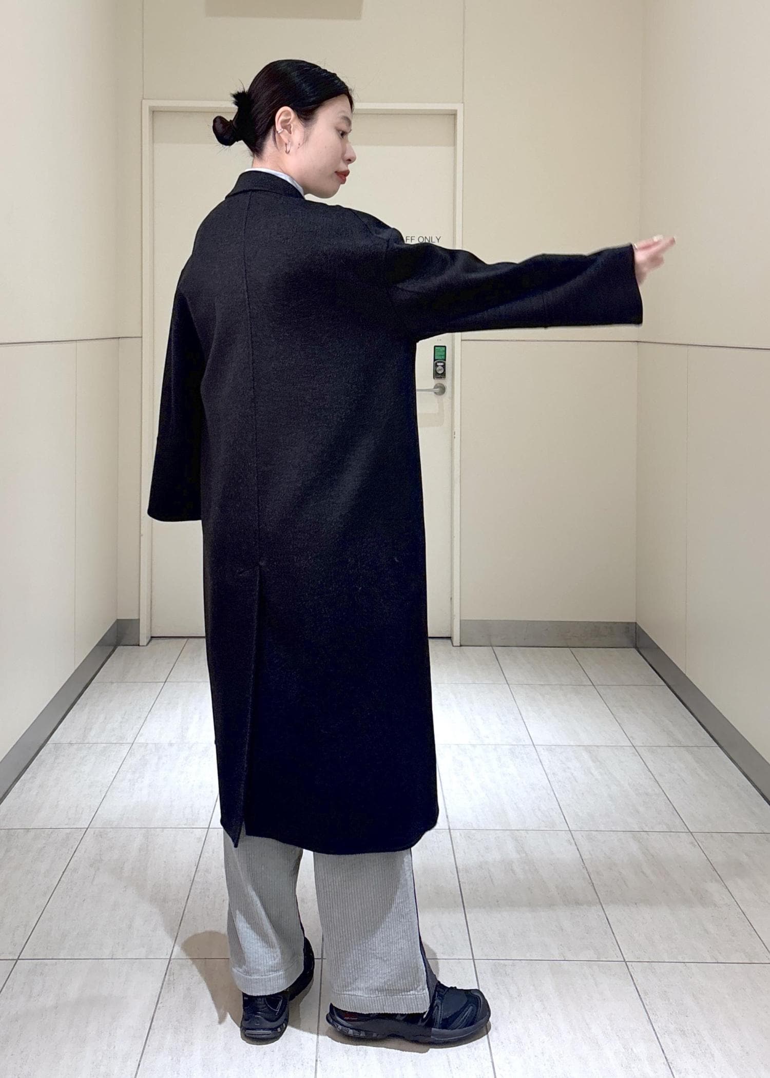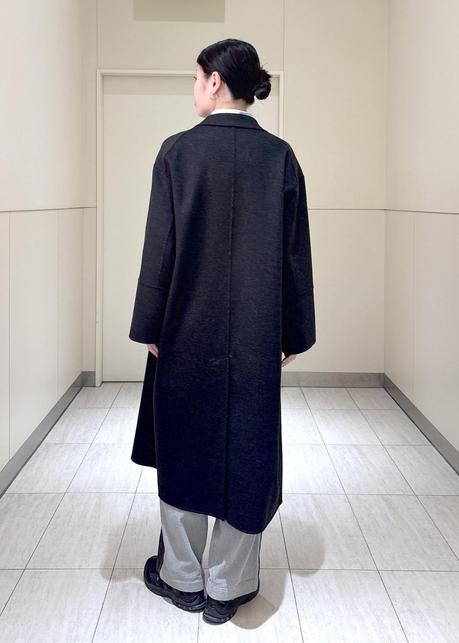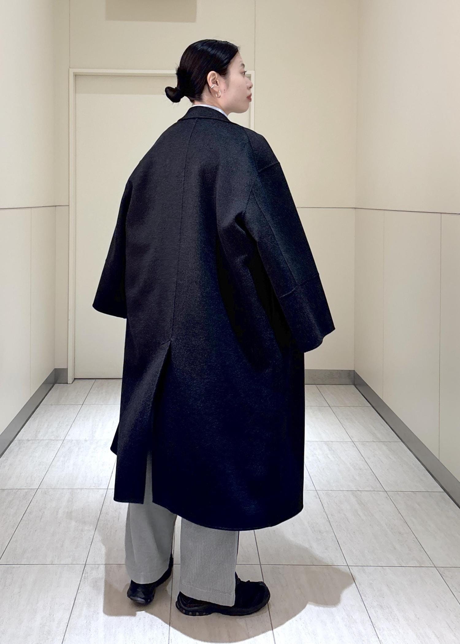 黒寄りのチャコールカラーなので、黒よりも重たく見えないロングコートで幅広いスタイリングに合わせやすいですよ☺︎
