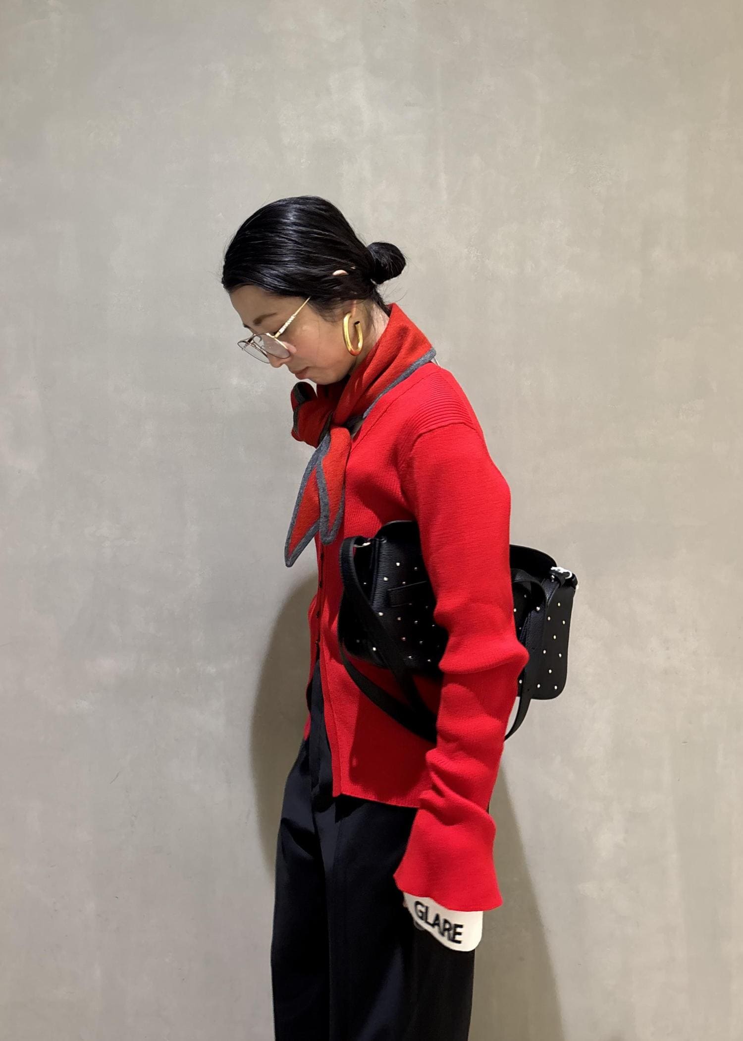 上品なスタイルなので、バッグはスタッズの少し辛めな雰囲気なものを合わせて引き締めてみました。