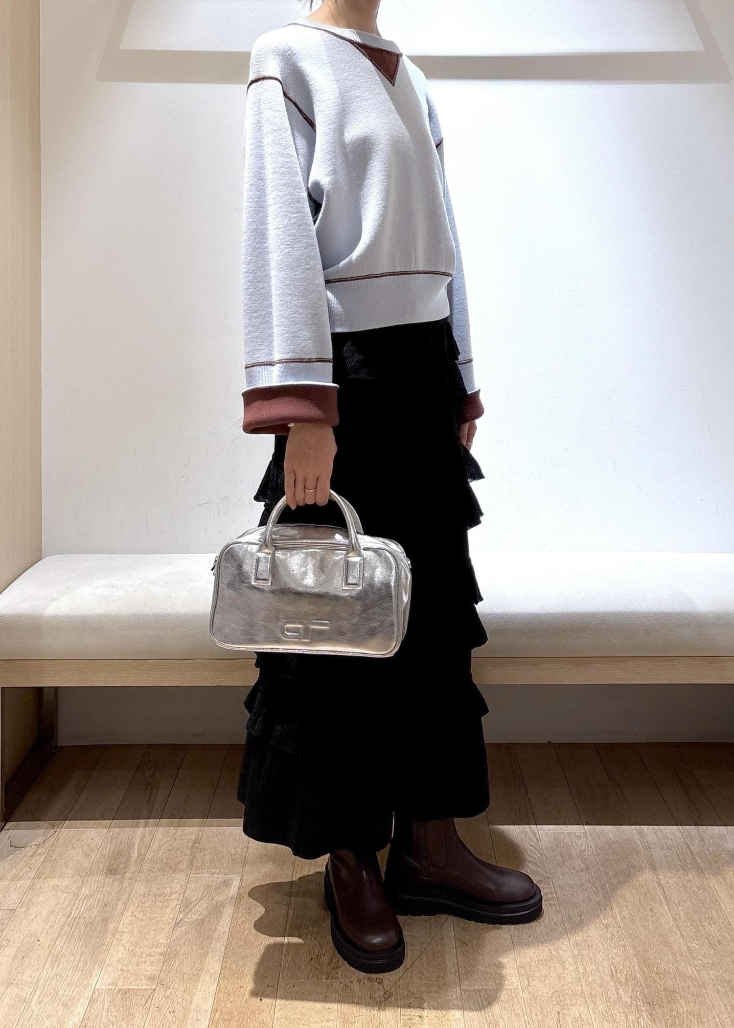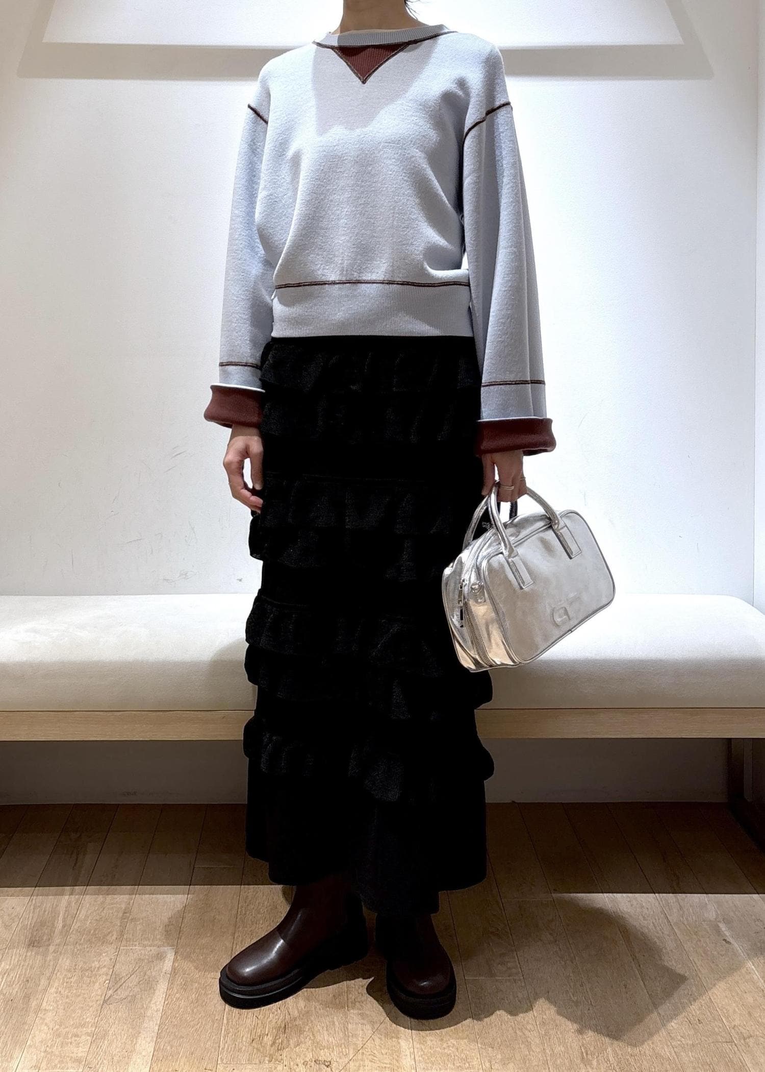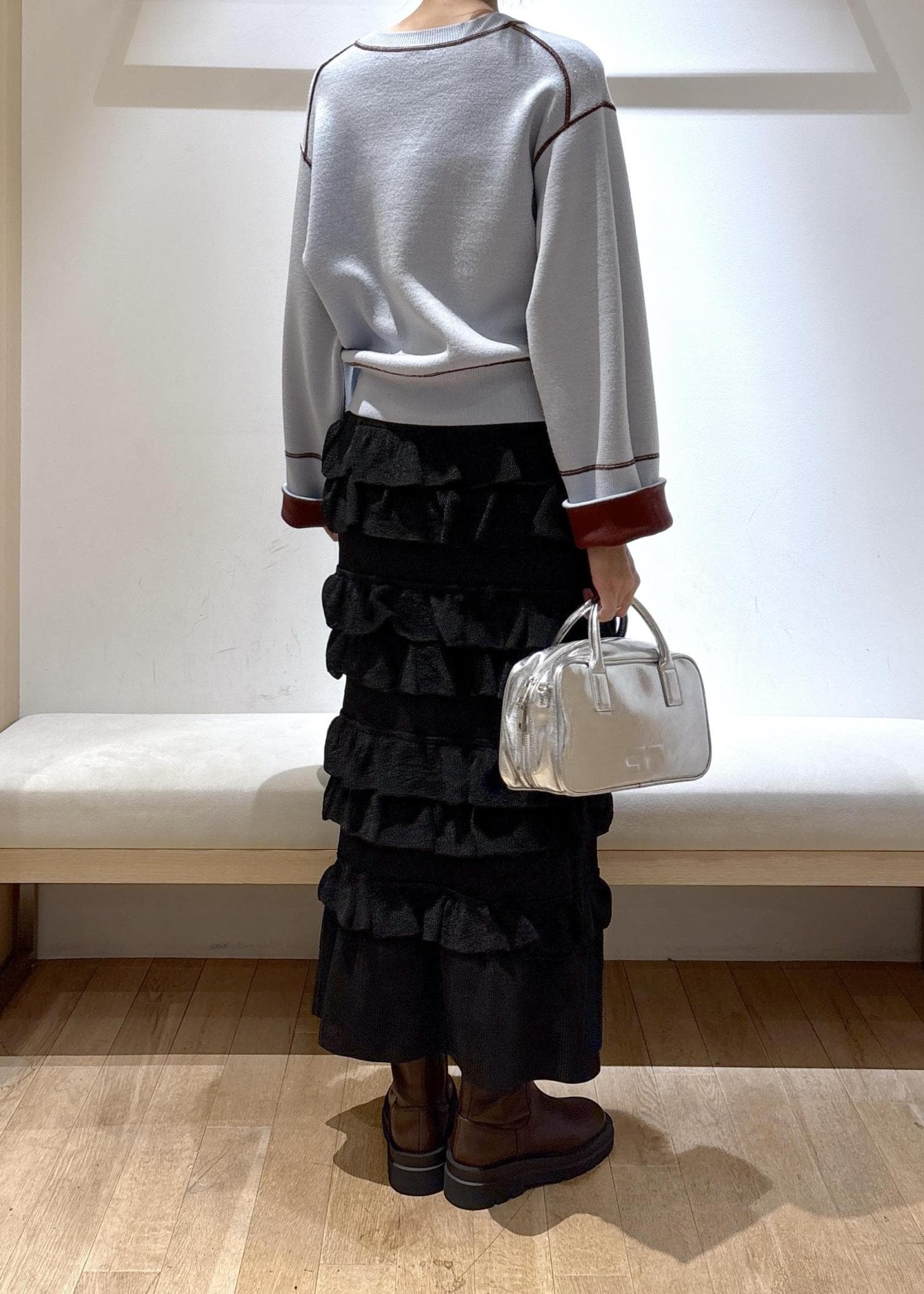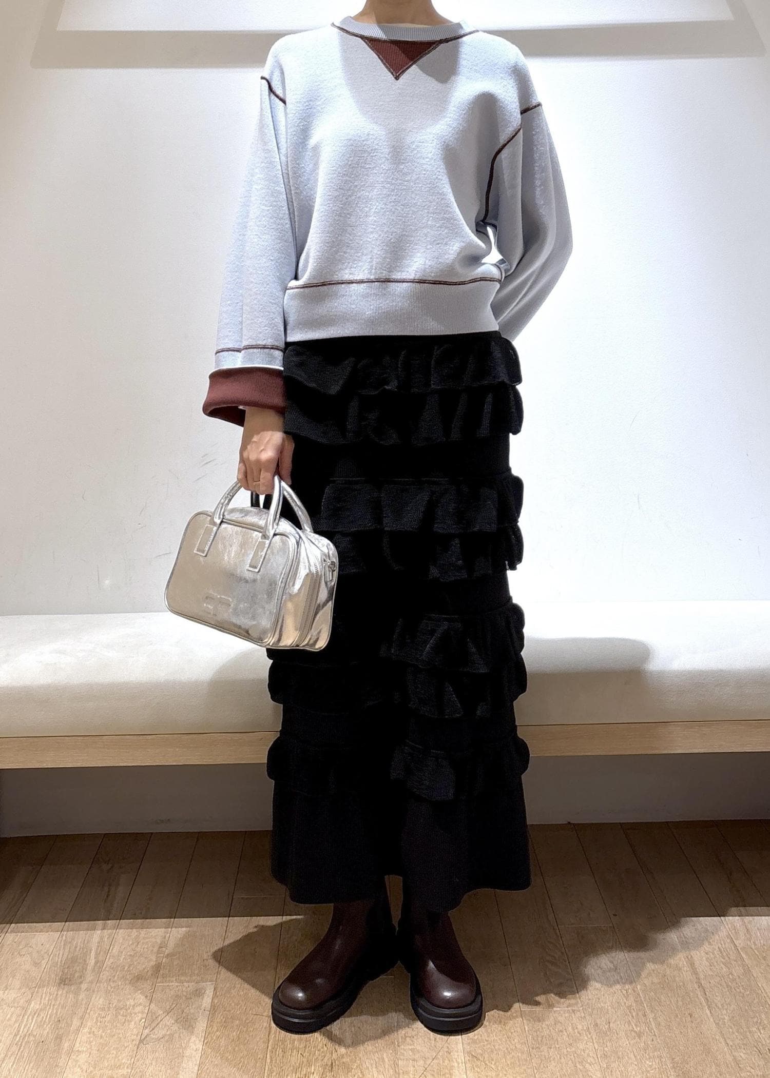 本日は大人気のリバーシブルニットに、フリルが映えるニットスカートを合わせたスタイリングです。