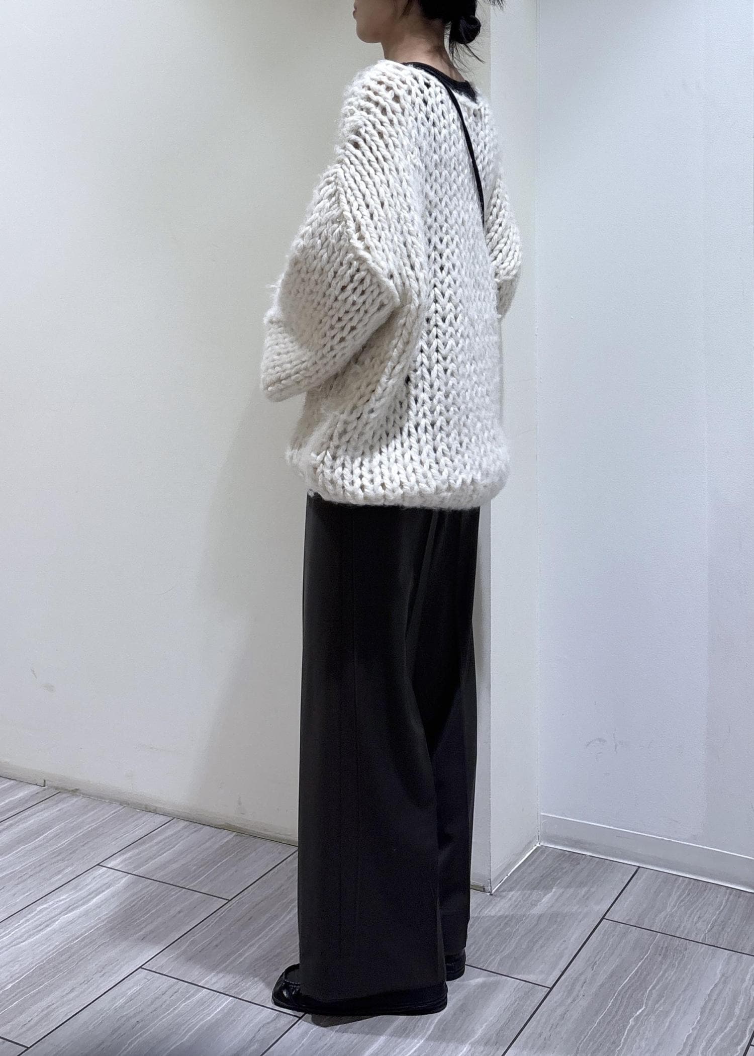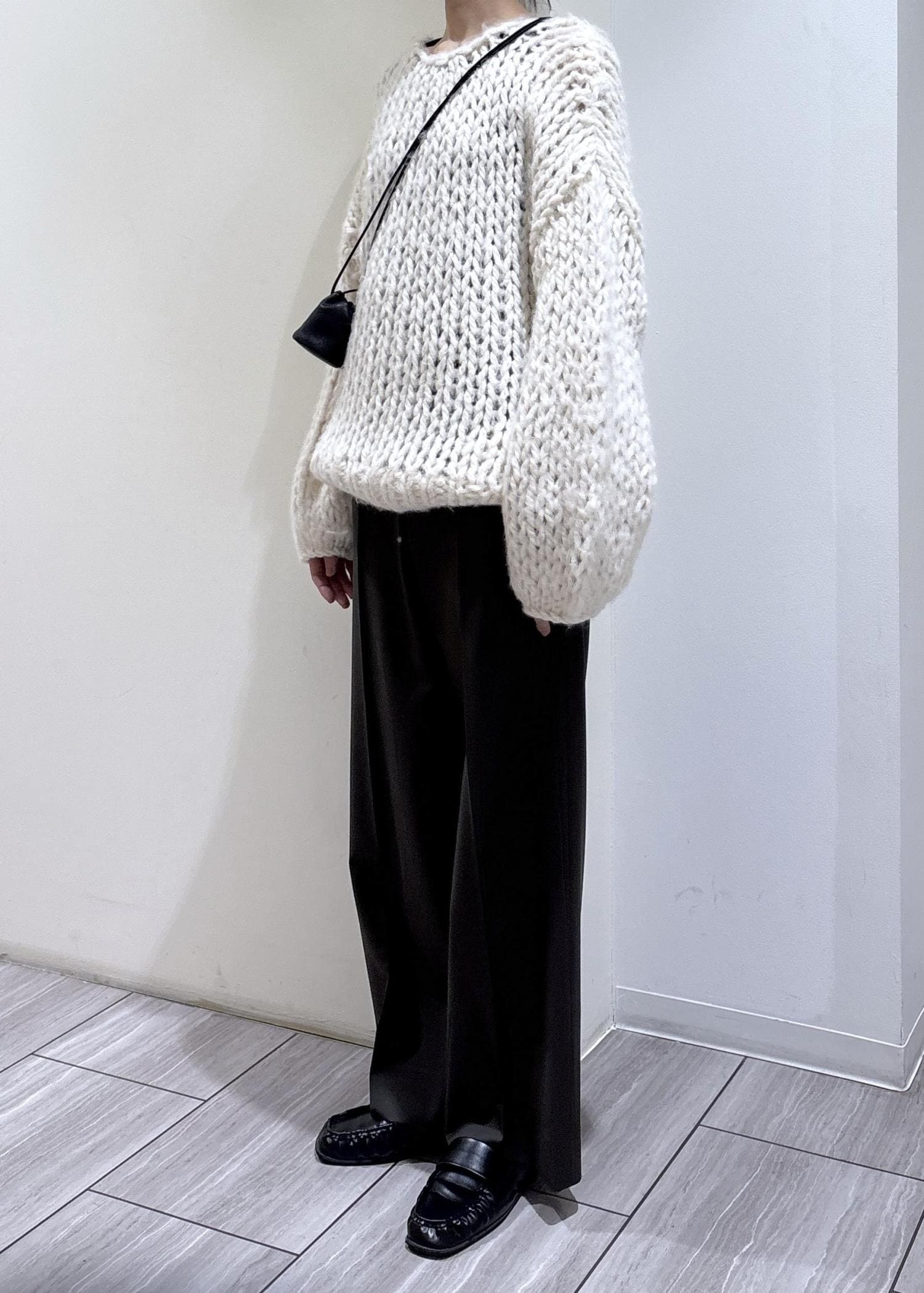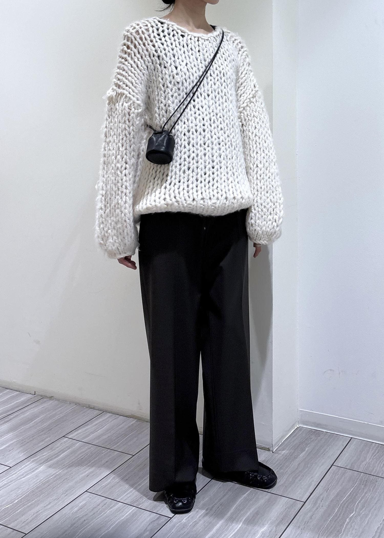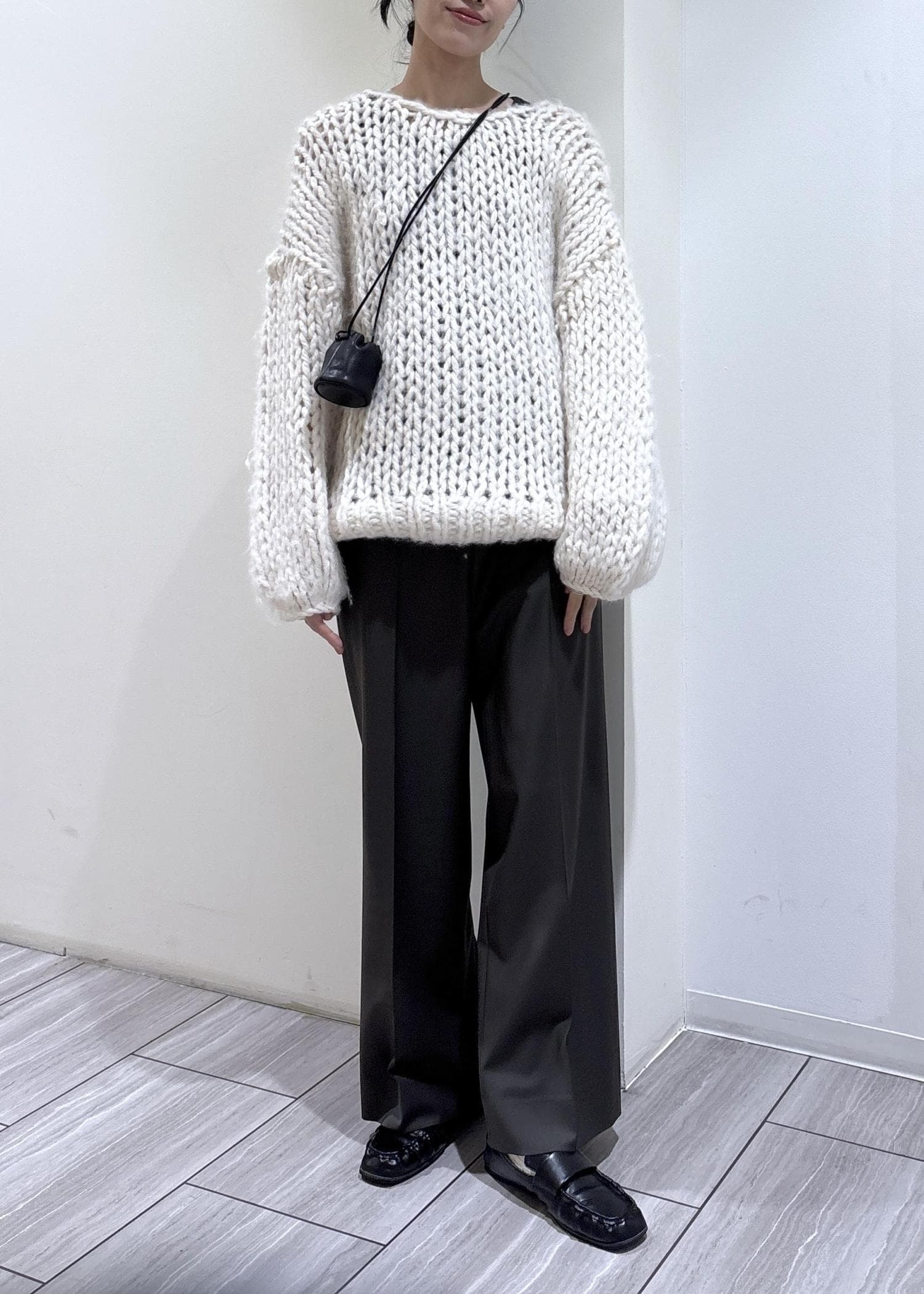 本日は、EMOELLのざっくり編みのふんわりニットに、落ち感のきれいなウールスラックスを合わせたスタイリングです。