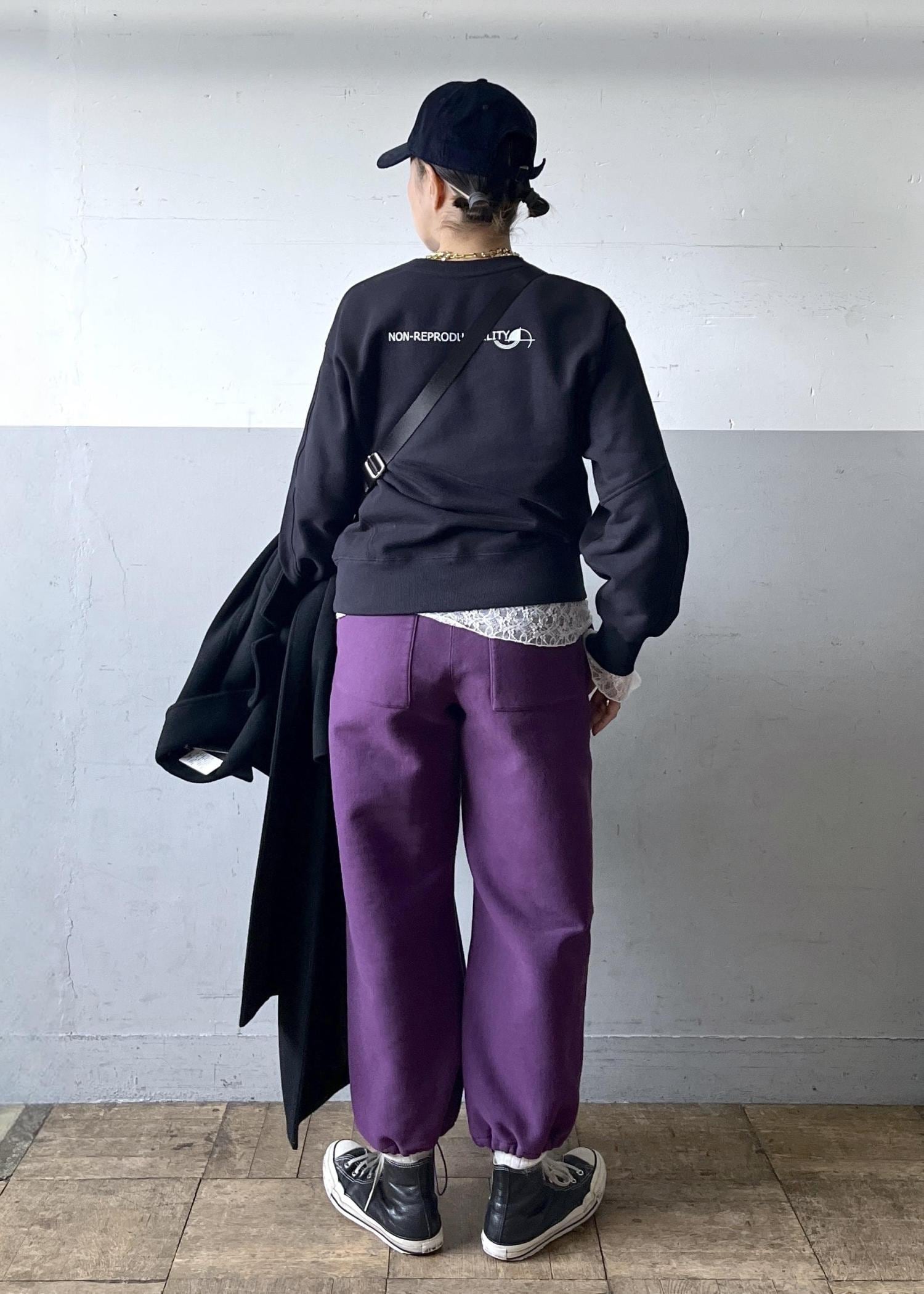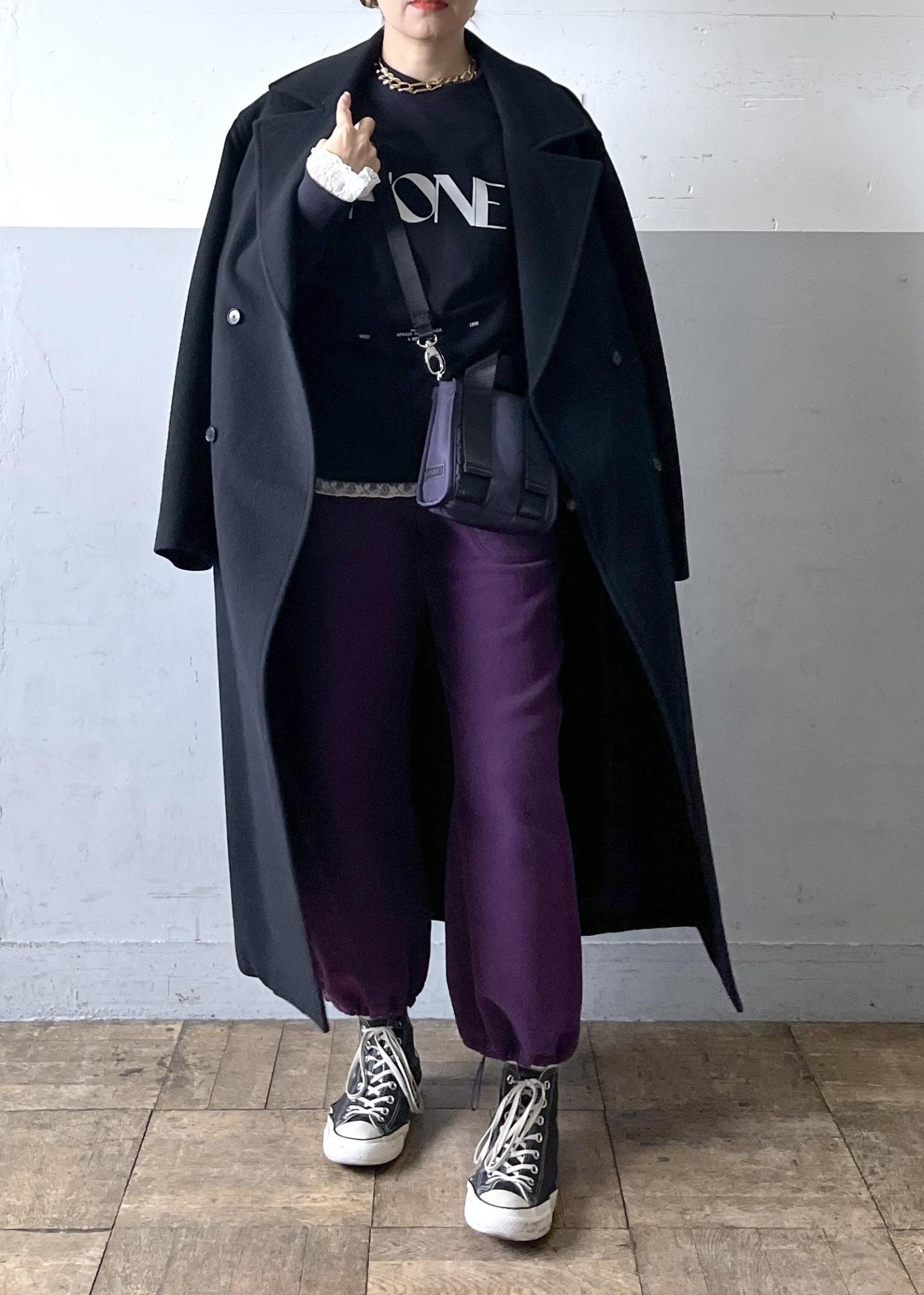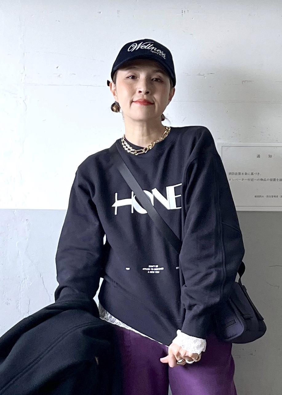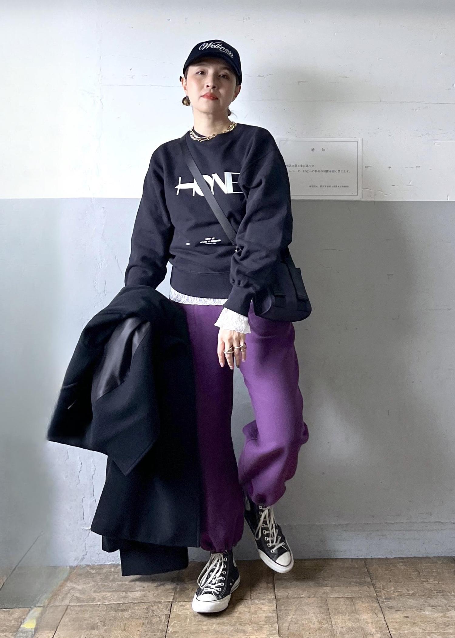 上下スウェットのリラックス感に、今年注目のレースカットソーをレイヤード。カジュアルになりすぎず、程よい女性らしさと抜け感をプラスしています。
