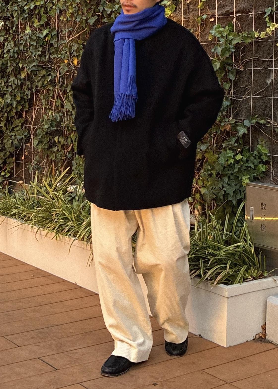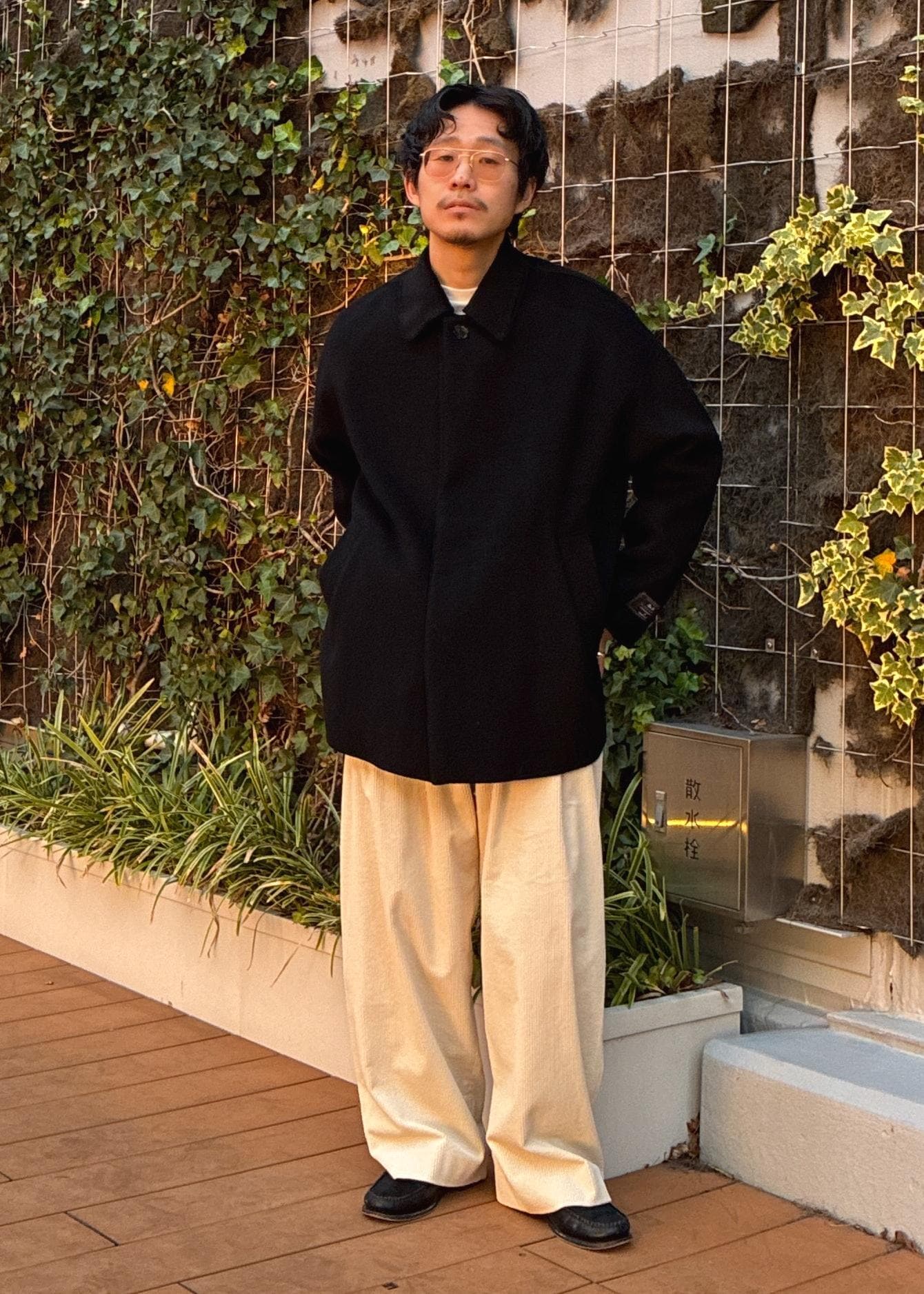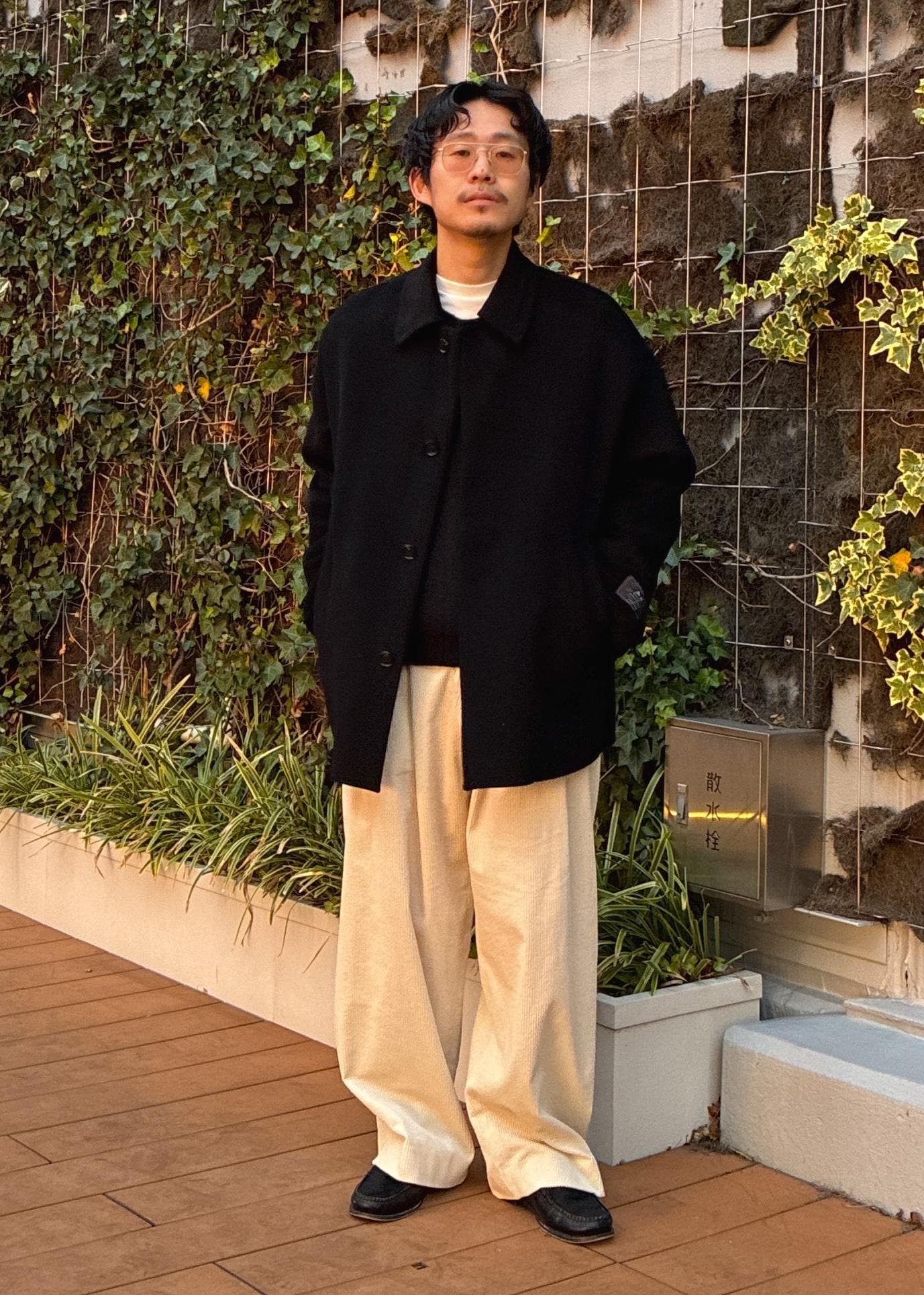 ADAM ET ROPÉ HOMMEメリノウール ダブルフェイス ショート ステンカラーコートブラック / M¥39,600レビューややゆったりめのサイズ感で、僕自身肩幅がありますがMでもかなり余裕を持って着用できました。