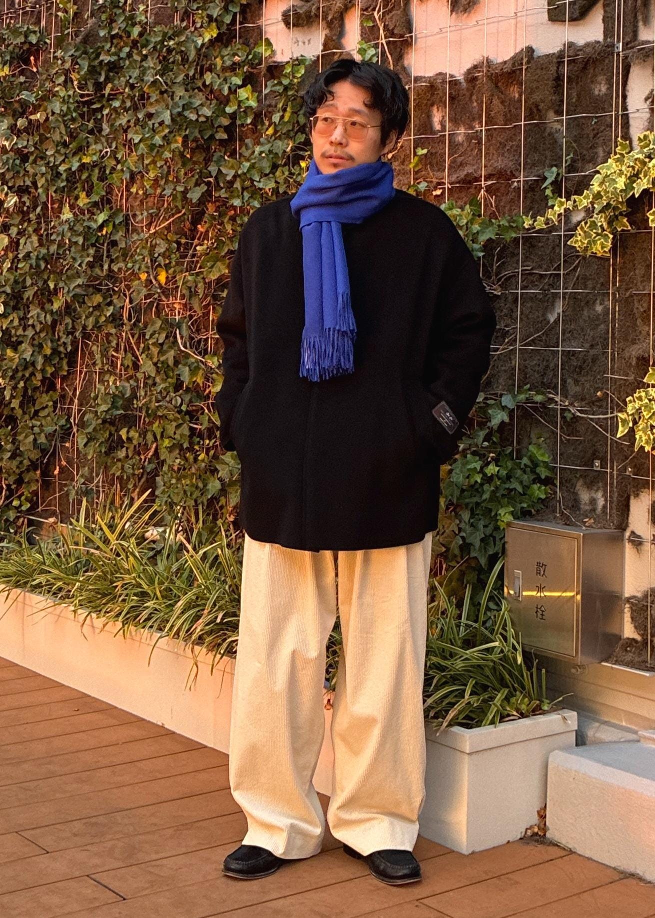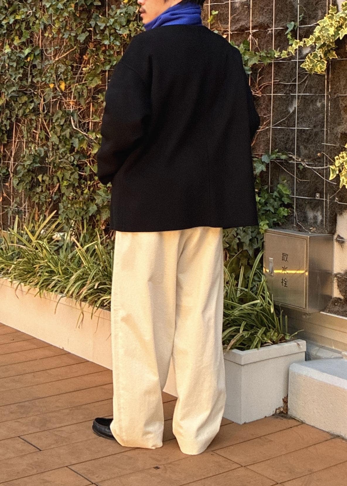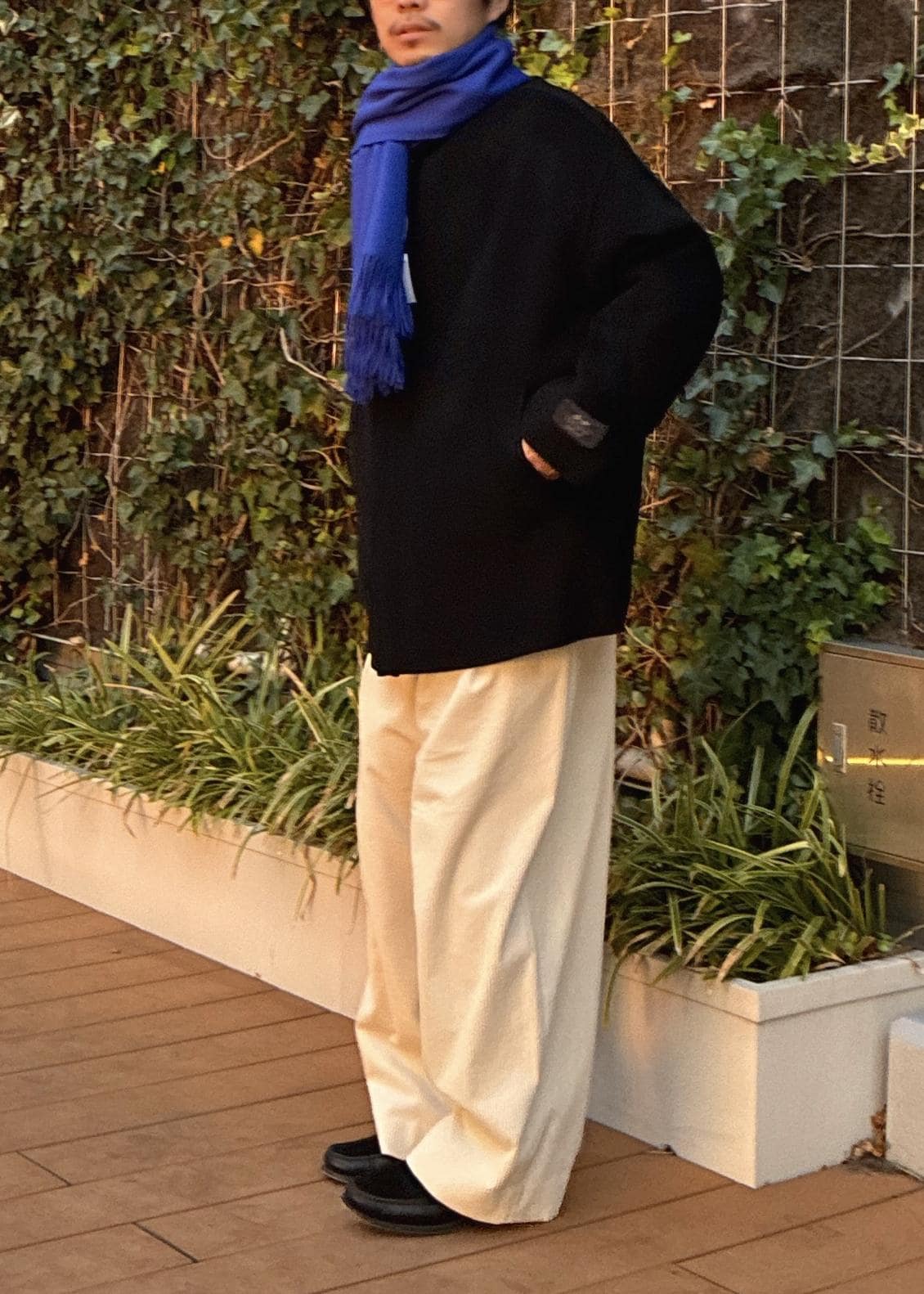 ADAM ET ROPÉ HOMMEメリノウール ダブルフェイス ショート ステンカラーコートブラック / M¥39,600レビューややゆったりめのサイズ感で、僕自身肩幅がありますがMでもかなり余裕を持って着用できました。