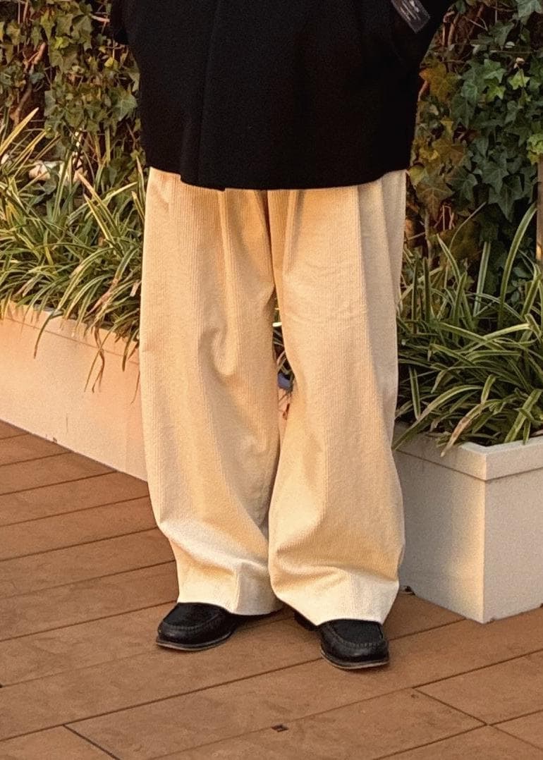 ADAM ET ROPÉ HOMMEコーデュロイ バギー スラックスオフホワイト / M¥19,910レビュー程よいフィット感のあるウエストサイズで、僕自身細身体型ですが、Mサイズでベルトをせずともずり落ちないくらいにちょうどよく着用できました。