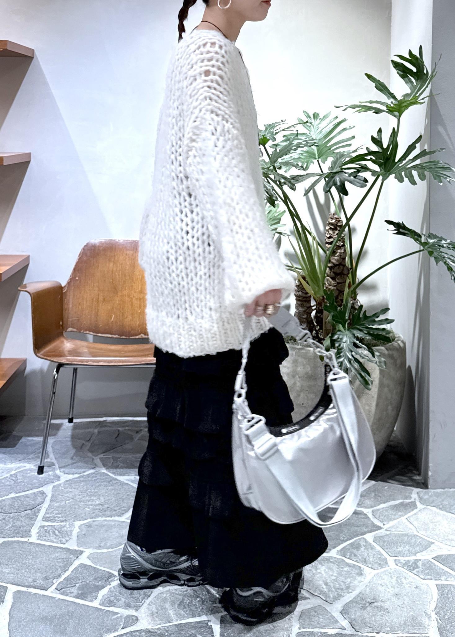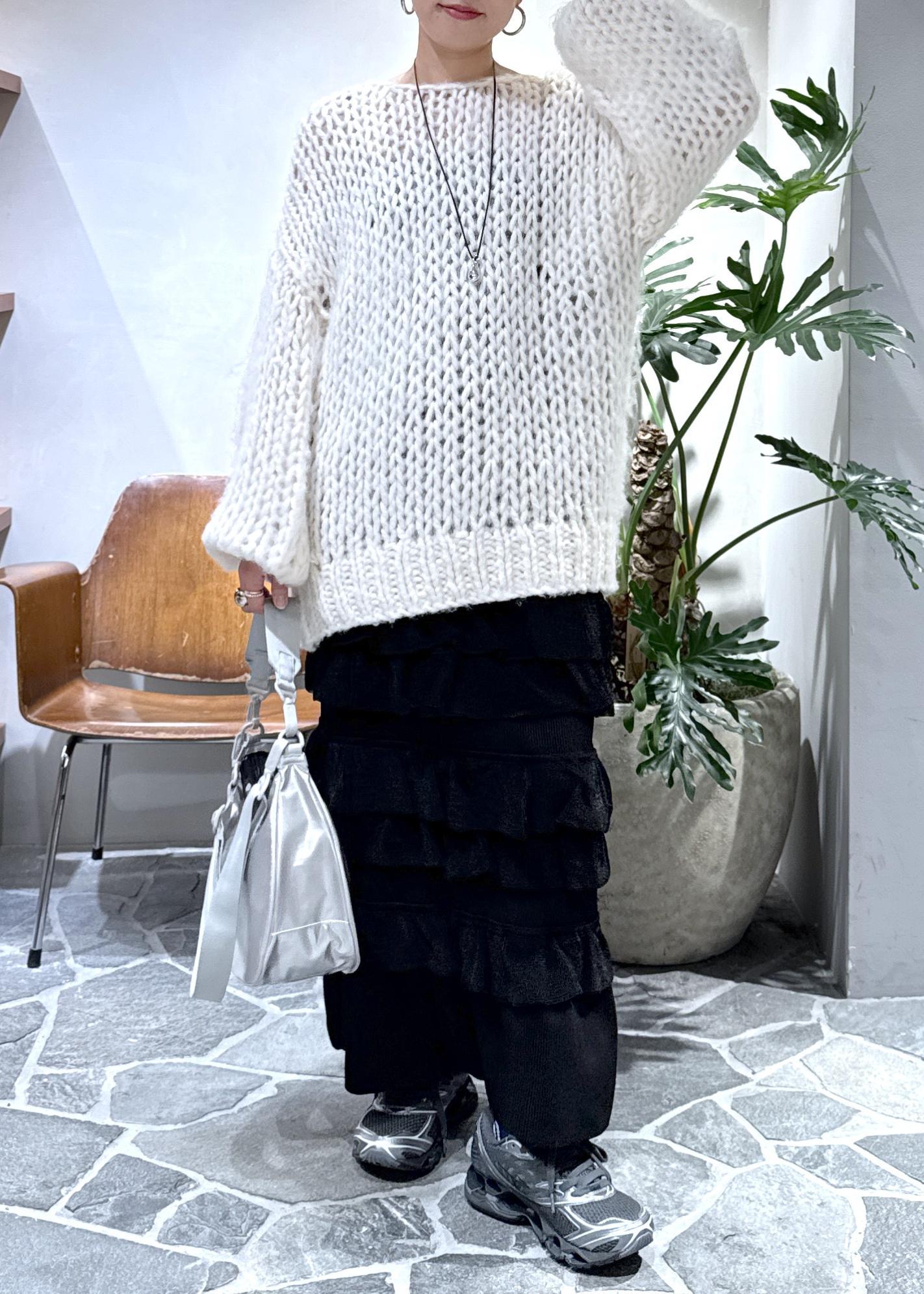 ざっくり編みのニットとフリルスカートのフェミニンなコーデにスニーカーとカジュアルバッグを合わせて、フェミニンカジュアルコーデに仕上げました!