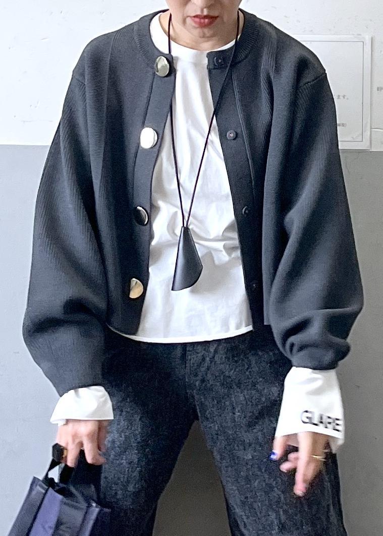ボタンデザインがアクセントになり、シンプルながらも表情のあるスタイリングに。