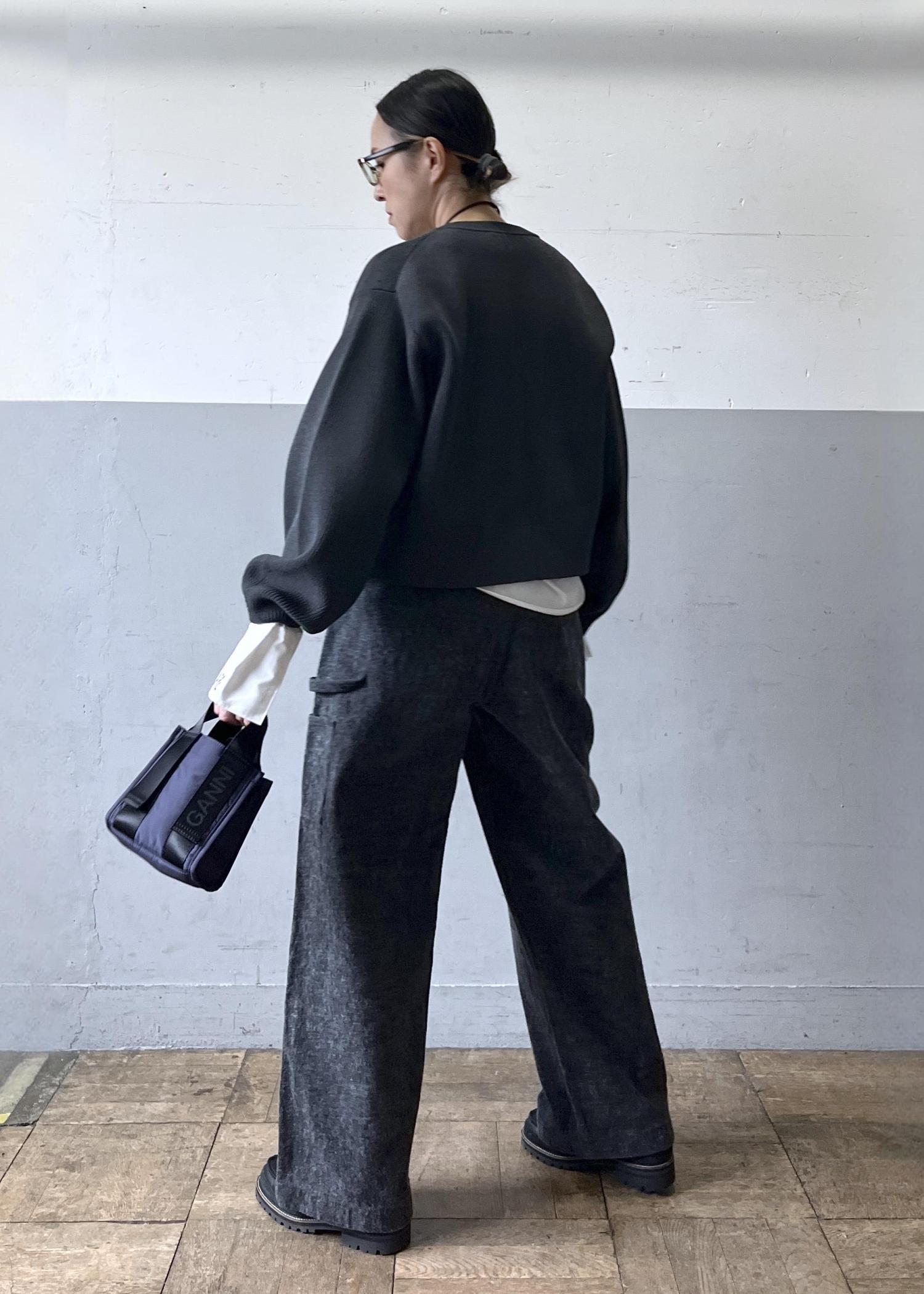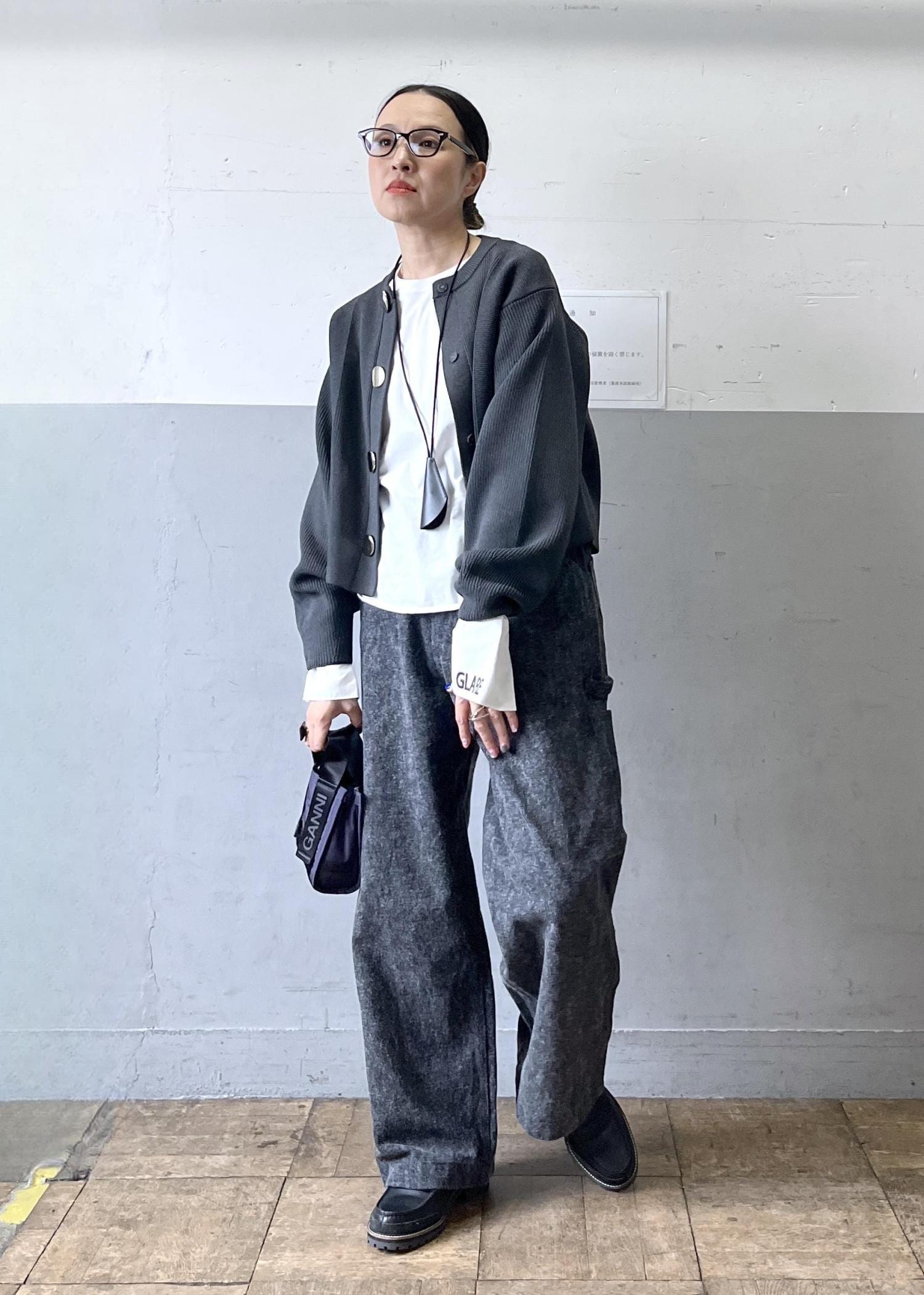 ワイドパンツ合わせで甘さを抑え、大人の余裕を感じるバランスに仕上げています。