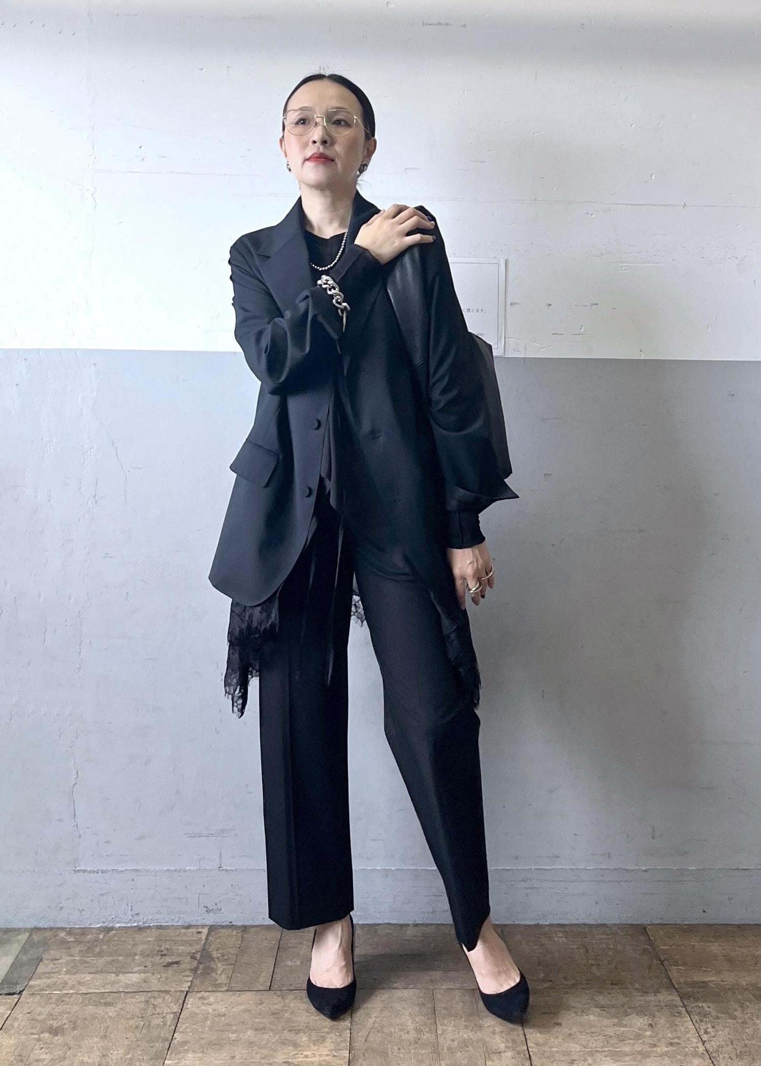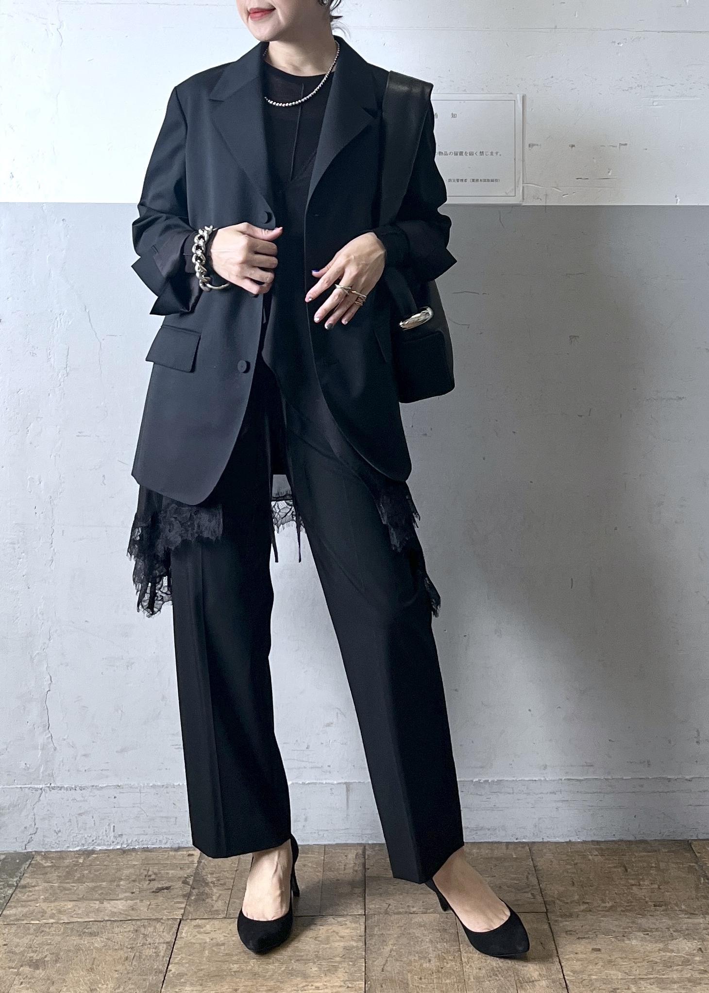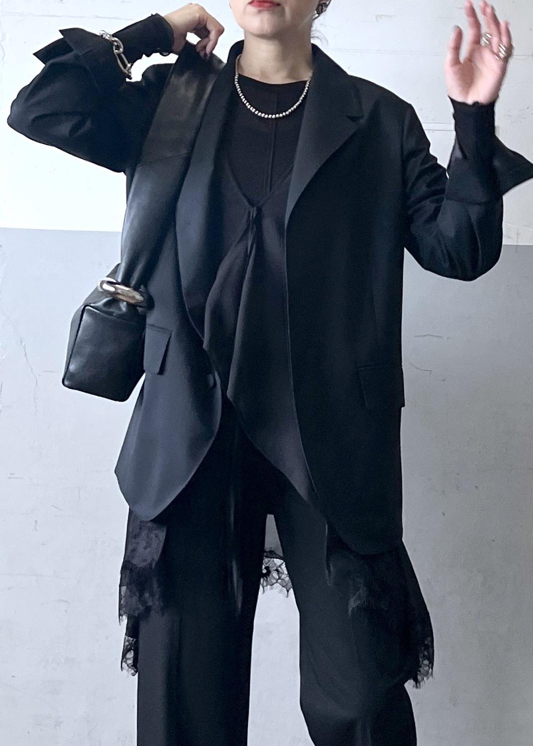 シングルジャケットを主役に、レースのジレを重ねたレイヤードスタイル。ブラックワントーンでも重く見えず、程よい抜けと女性らしさをプラス。