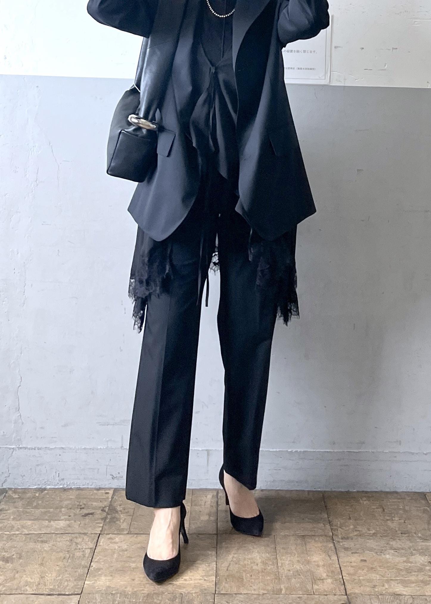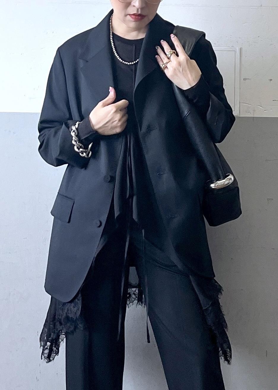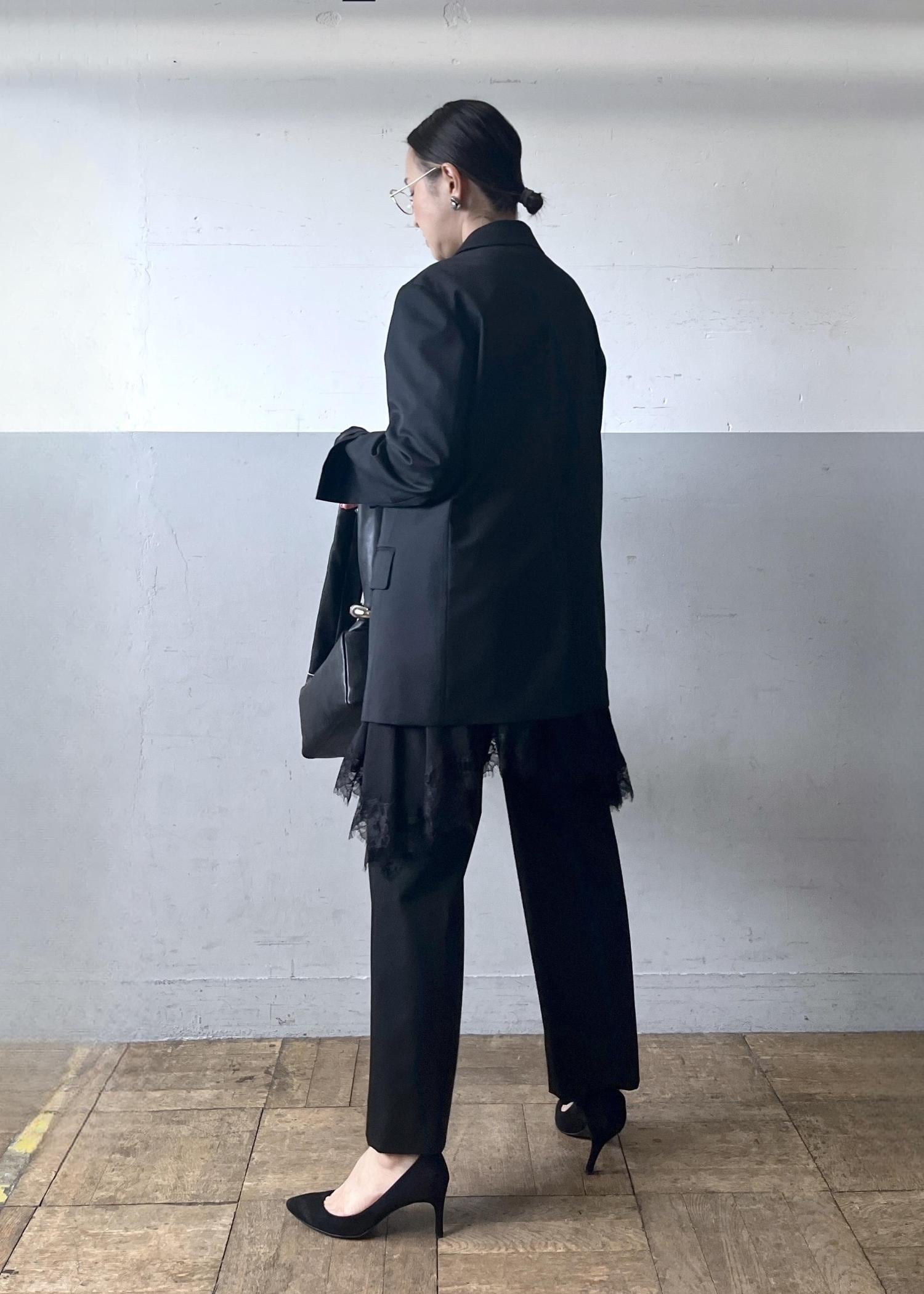シングルジャケットを主役に、レースのジレを重ねたレイヤードスタイル。ブラックワントーンでも重く見えず、程よい抜けと女性らしさをプラス。