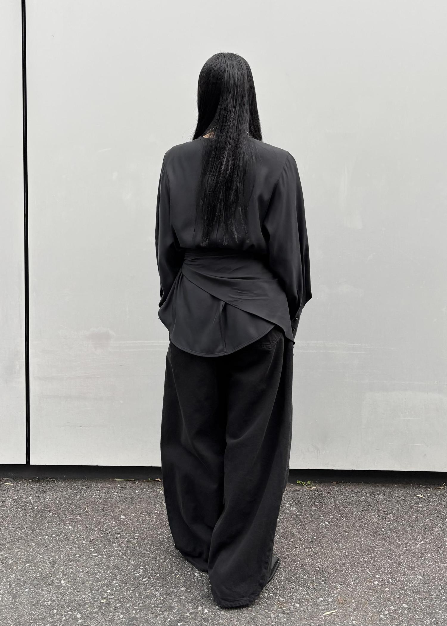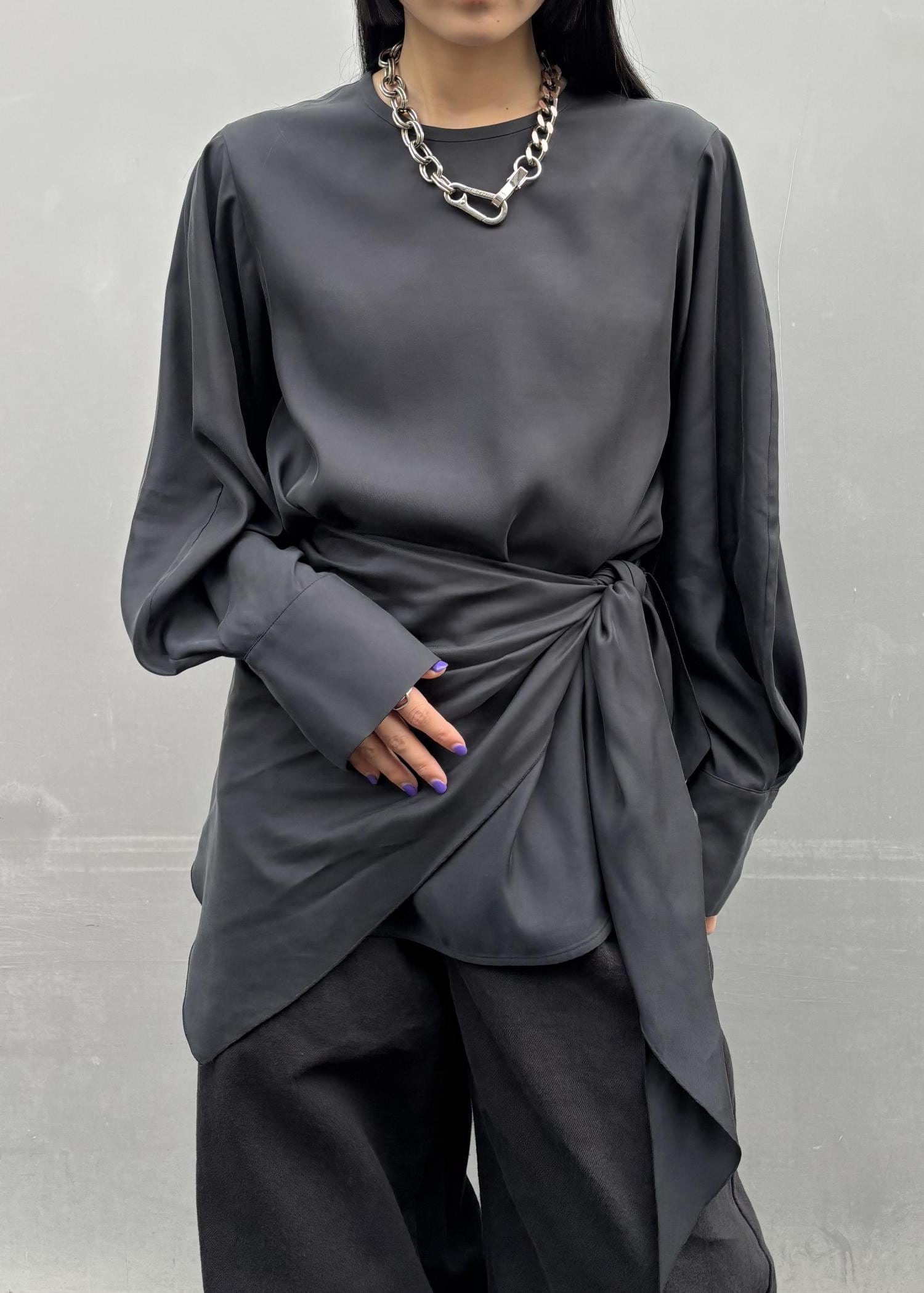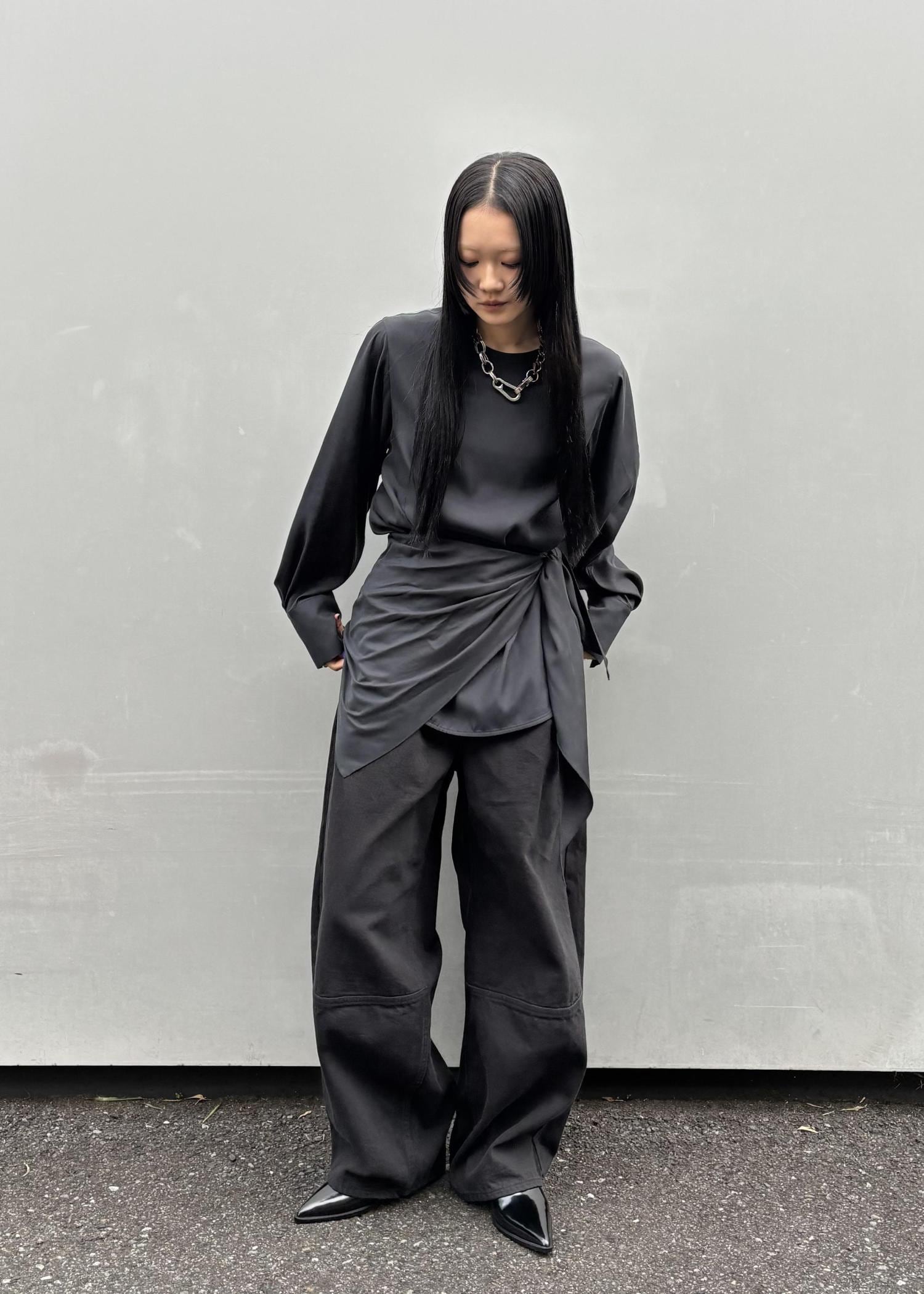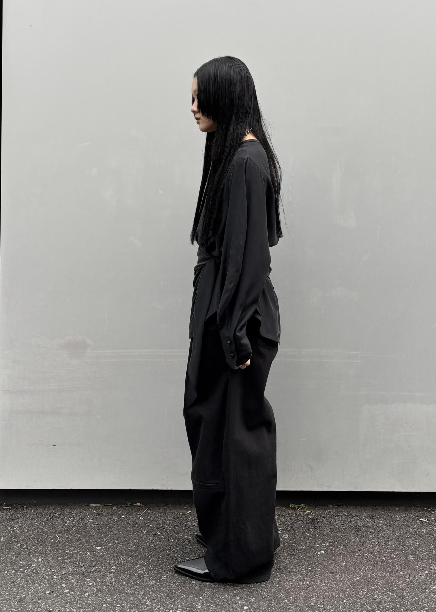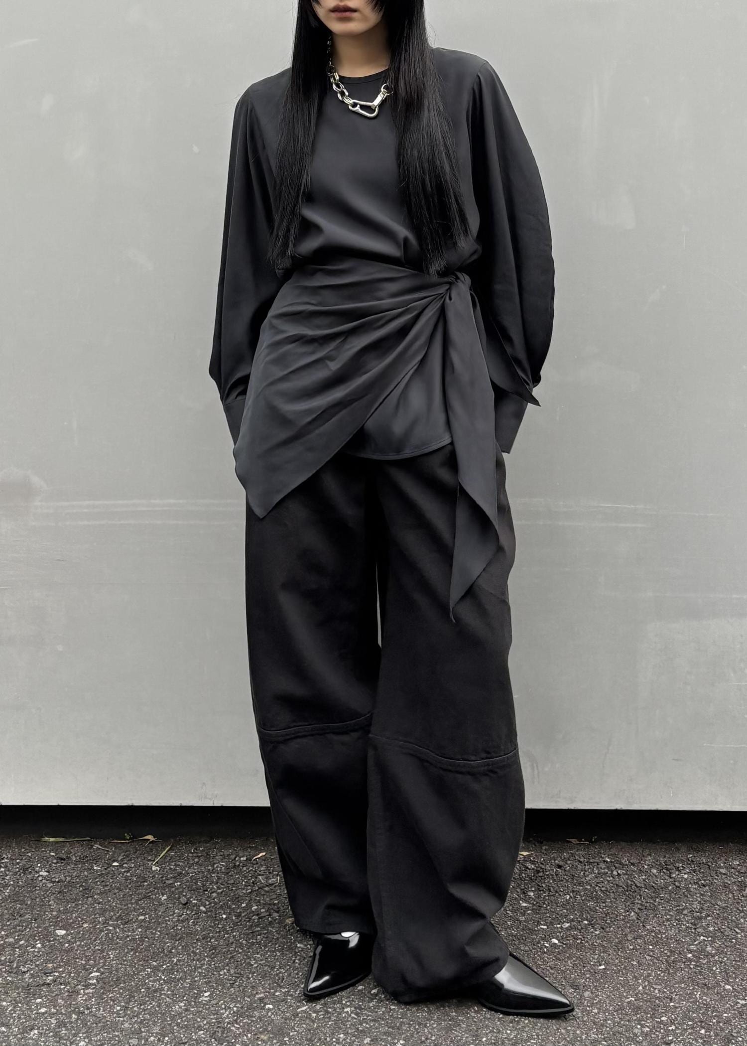 テロっと程よくツヤのある上品な素材感。手洗い可能なのがありがたいポイント。ややゆったりとしたゆとりのあるサイズ感。スカーフは首に巻いたり腰に巻いたりと、色んなアレンジが楽しめる大判サイズ。