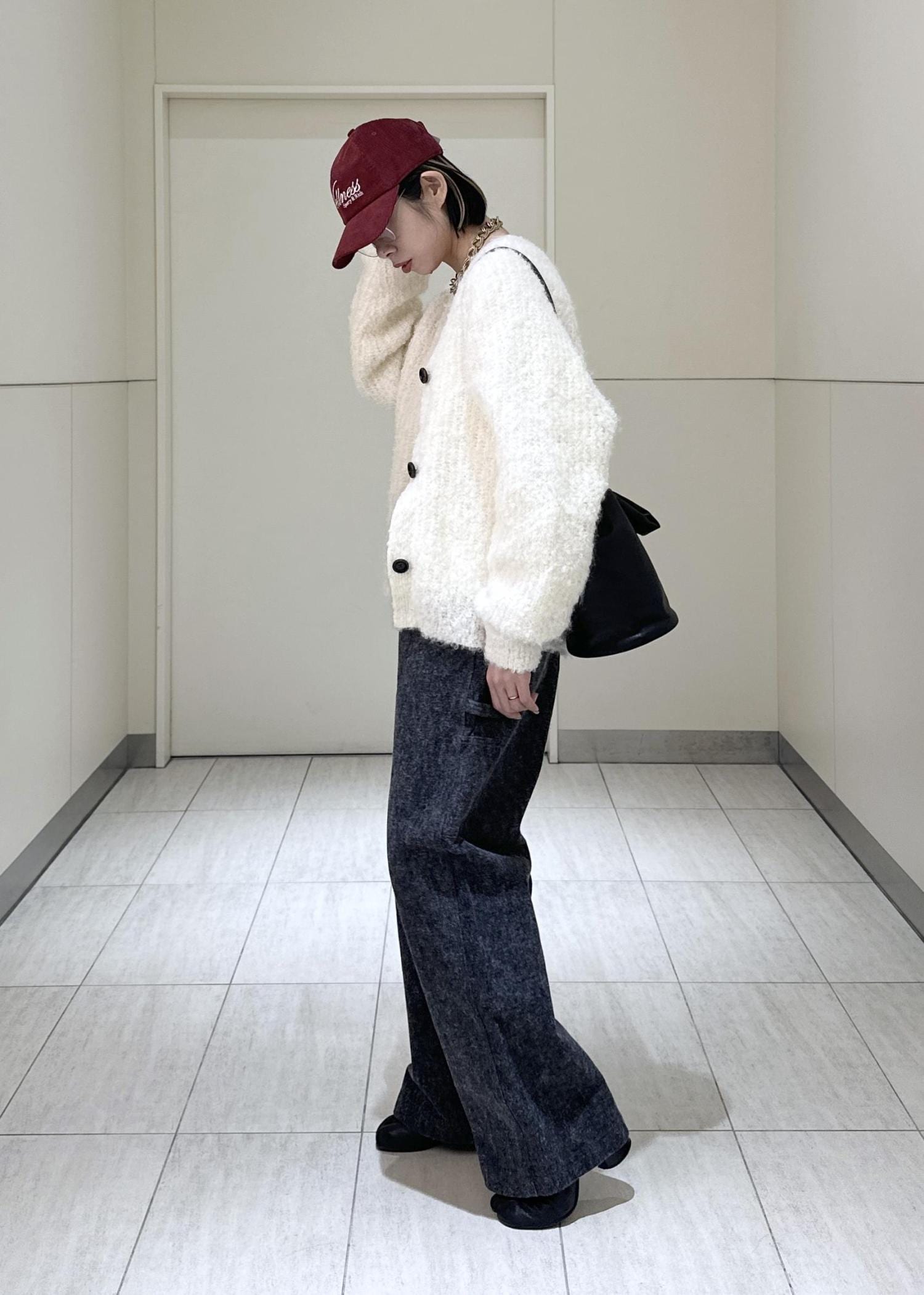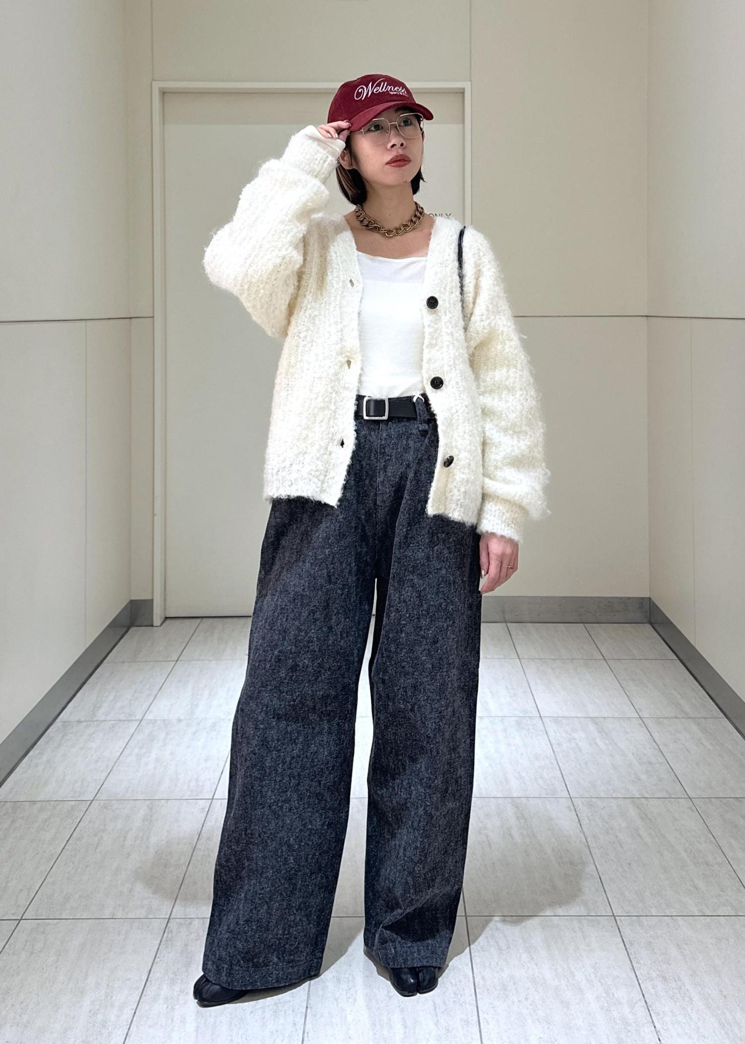 スタイリングはキャップを被ってシンプルなカジュアルスタイルに。