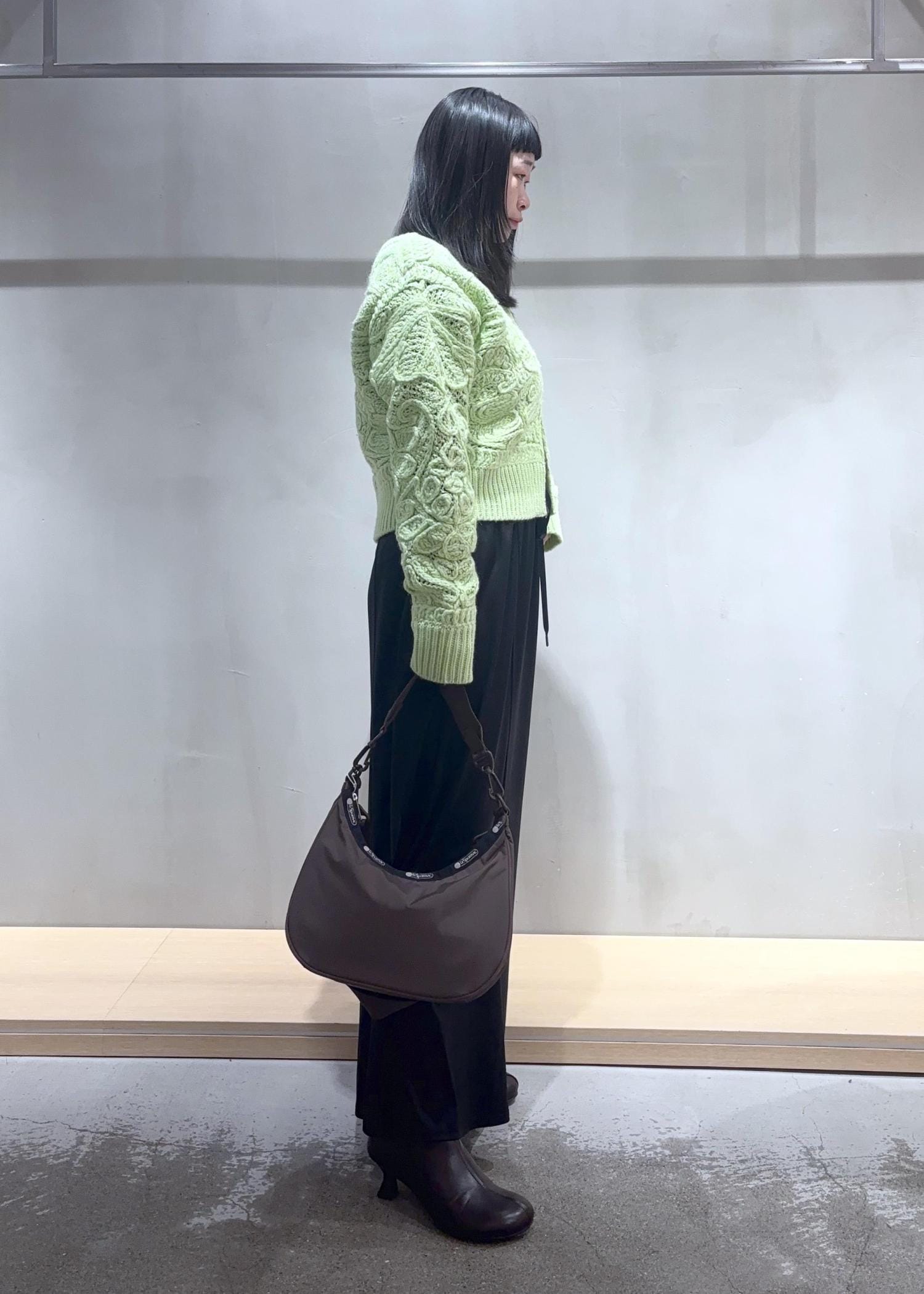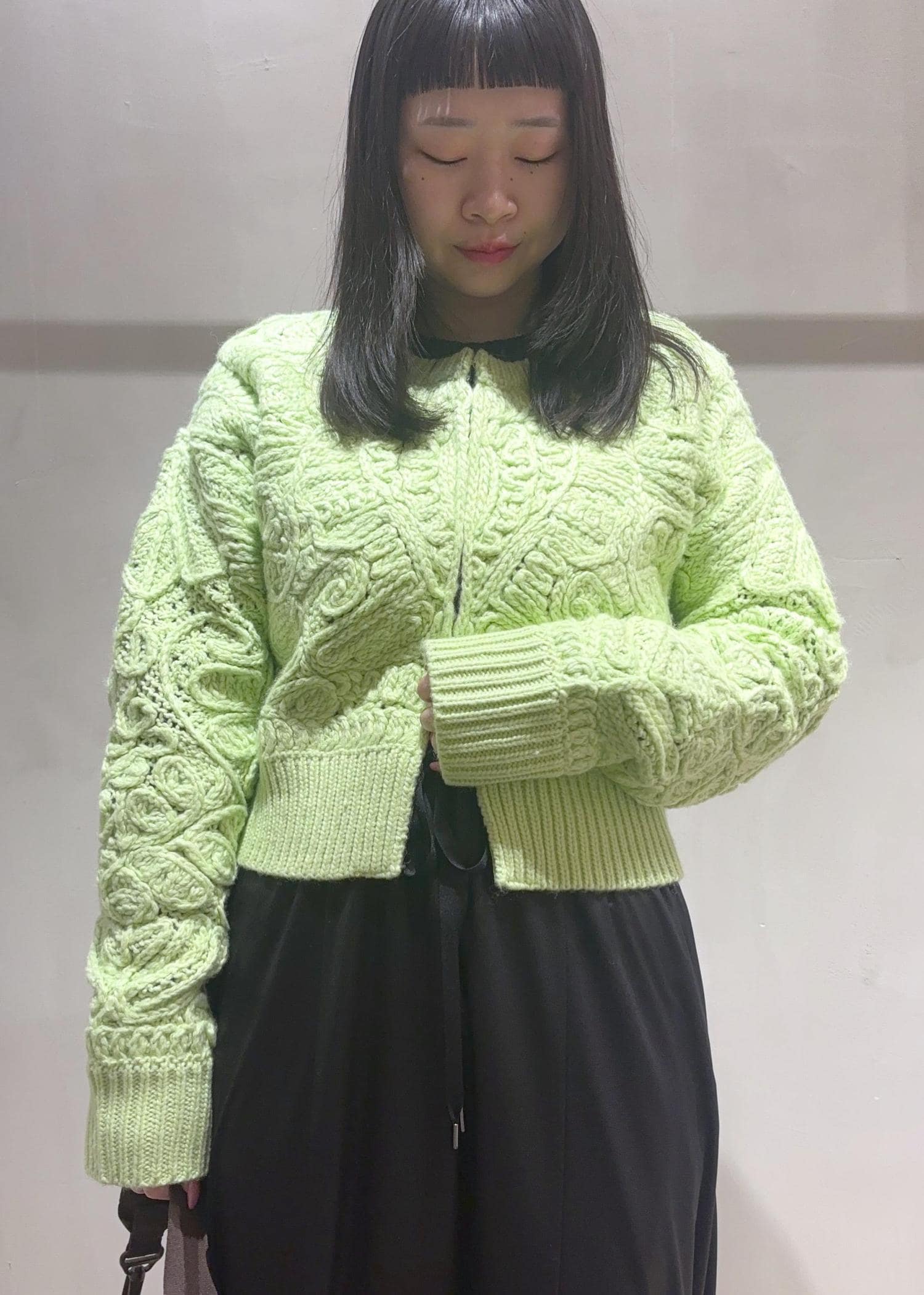 テンションが上がるグリーンのニットカーディガンはデザインも特徴があり着心地も良いです!