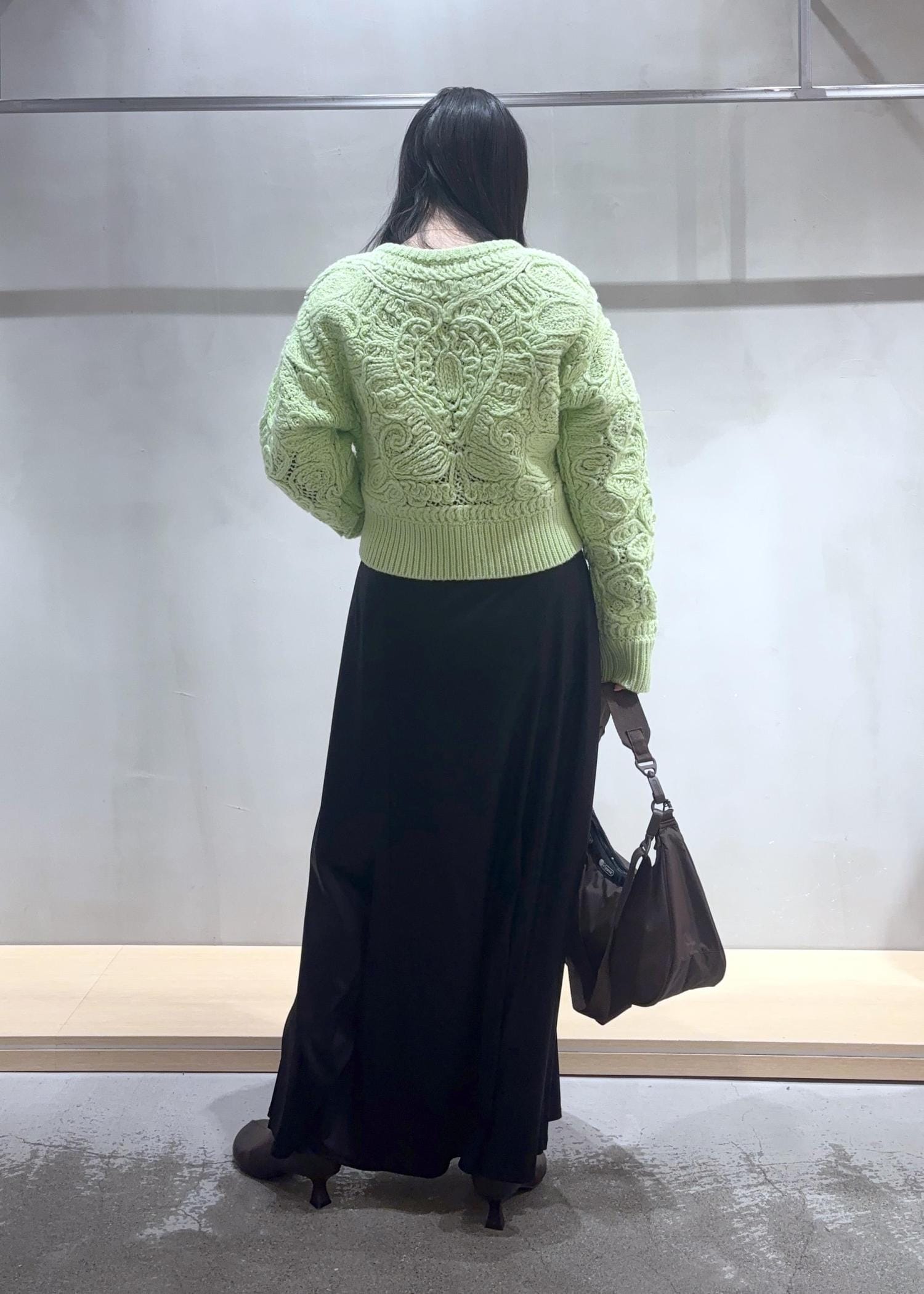 ADAM ET ROPÉ FEMMEコードレースパターンニットカーディガンライトグリーン / F¥23,100レビュー重くもなくチクチク感もそんなに感じないカーディガンでした!バックデザインもハートのようなデザインもあり個性的すぎずお洒落です☺︎