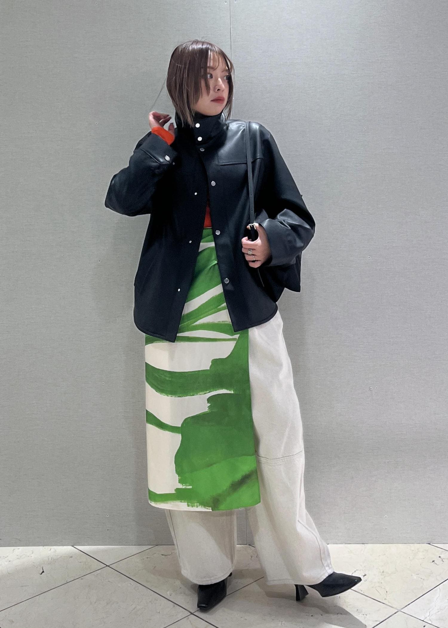 ボトムスはおしゃれなレザーパンツと合わせて、モードな雰囲気にしてみました!