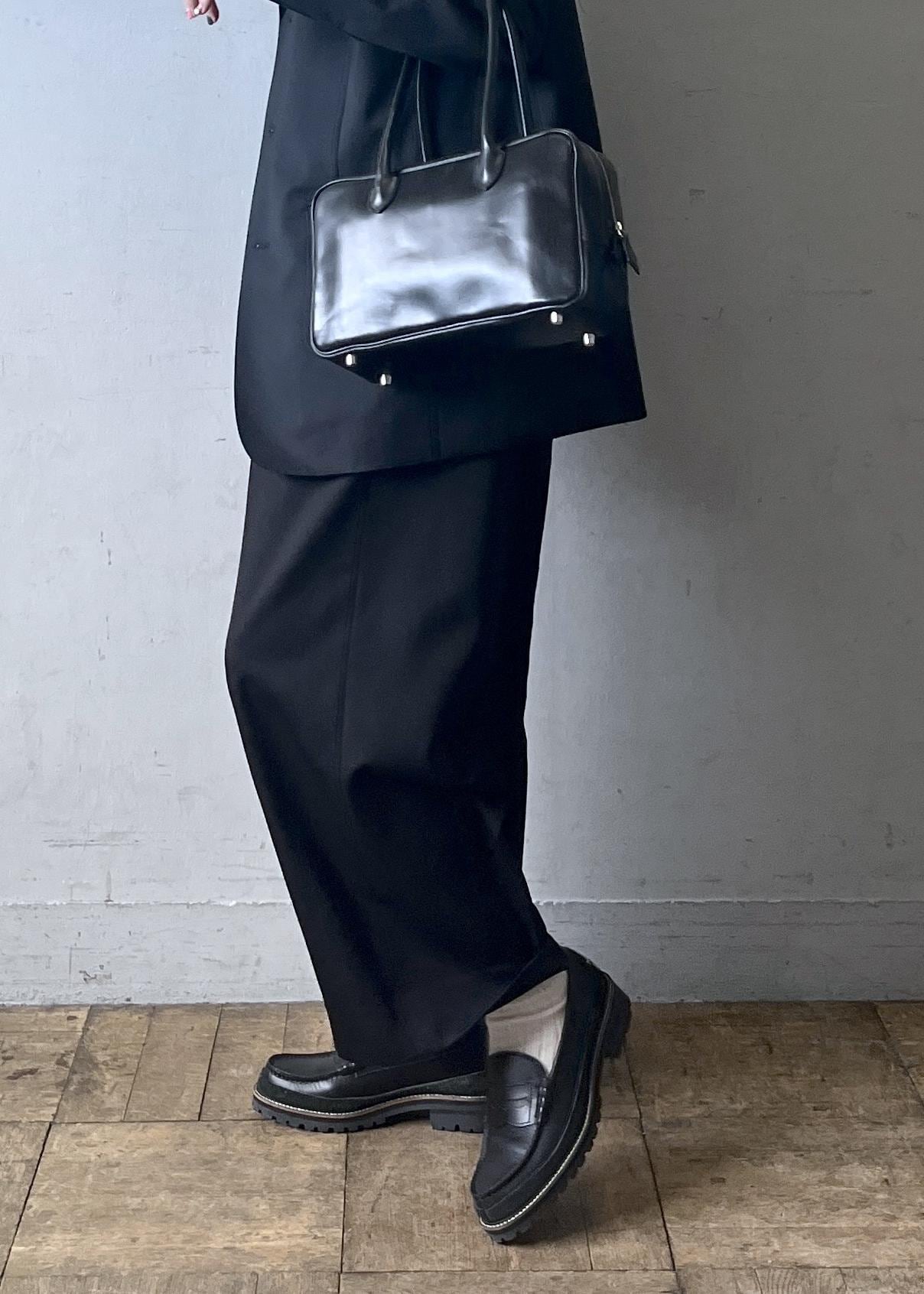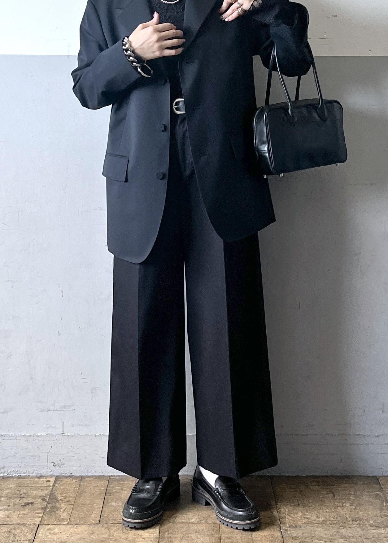 ウール100%のワイドストレートのスラックスです。裏地はないですがチクチク感もなく履きやすいです。共布のベルトが付いているのも嬉しいです。