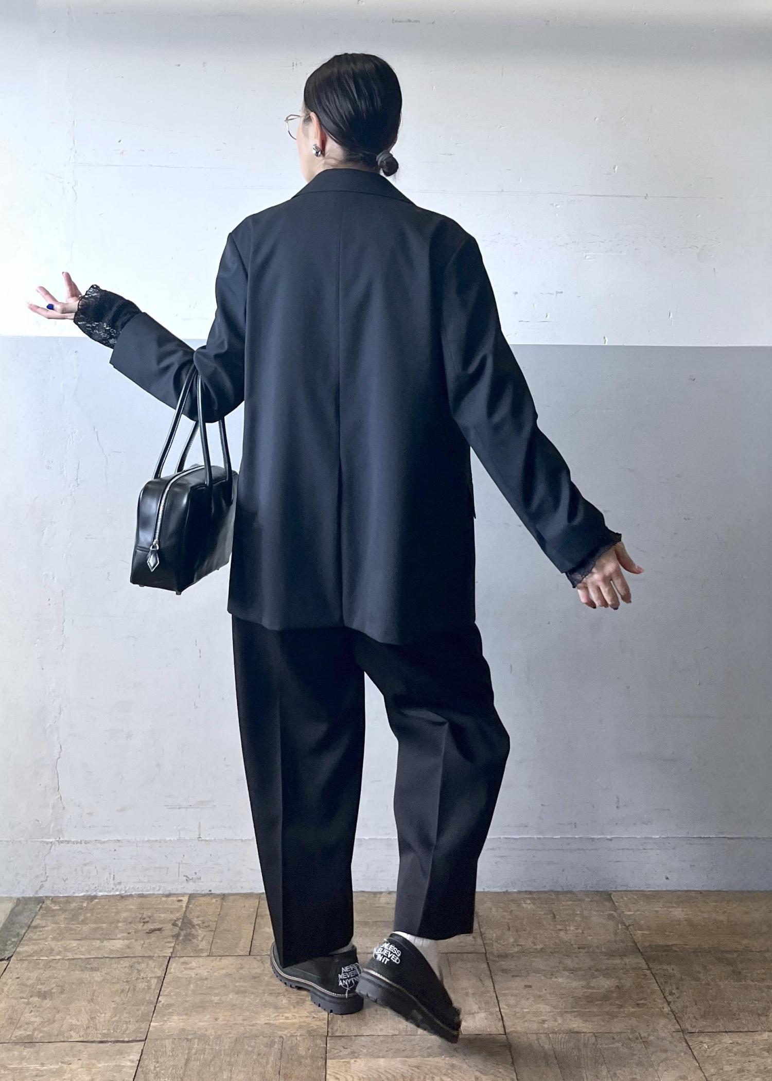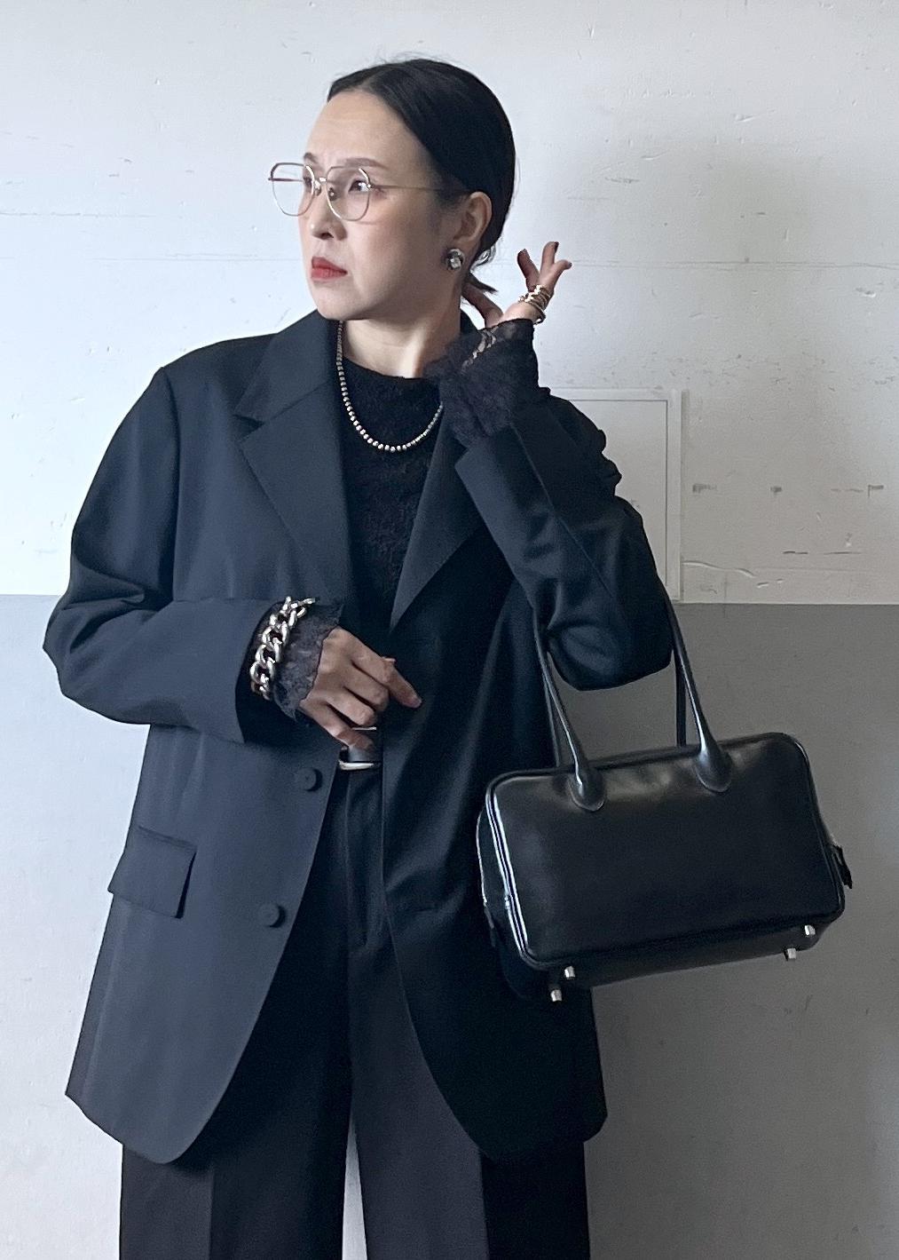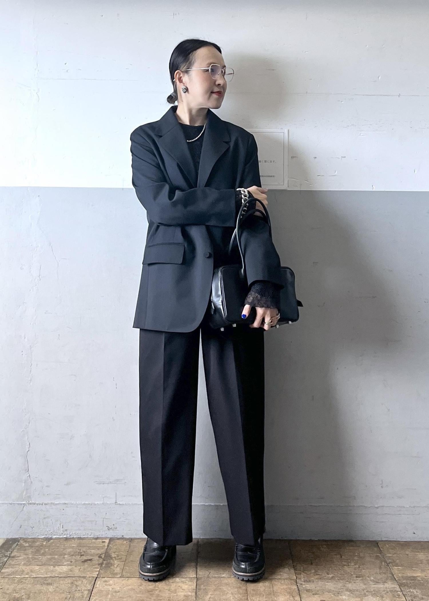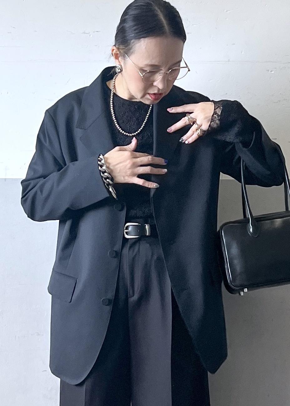 きちんと感のあるジャケットに、繊細なレースを合わせることでブラックスタイルも重くなりすぎず、女性らしい抜け感のある印象に。