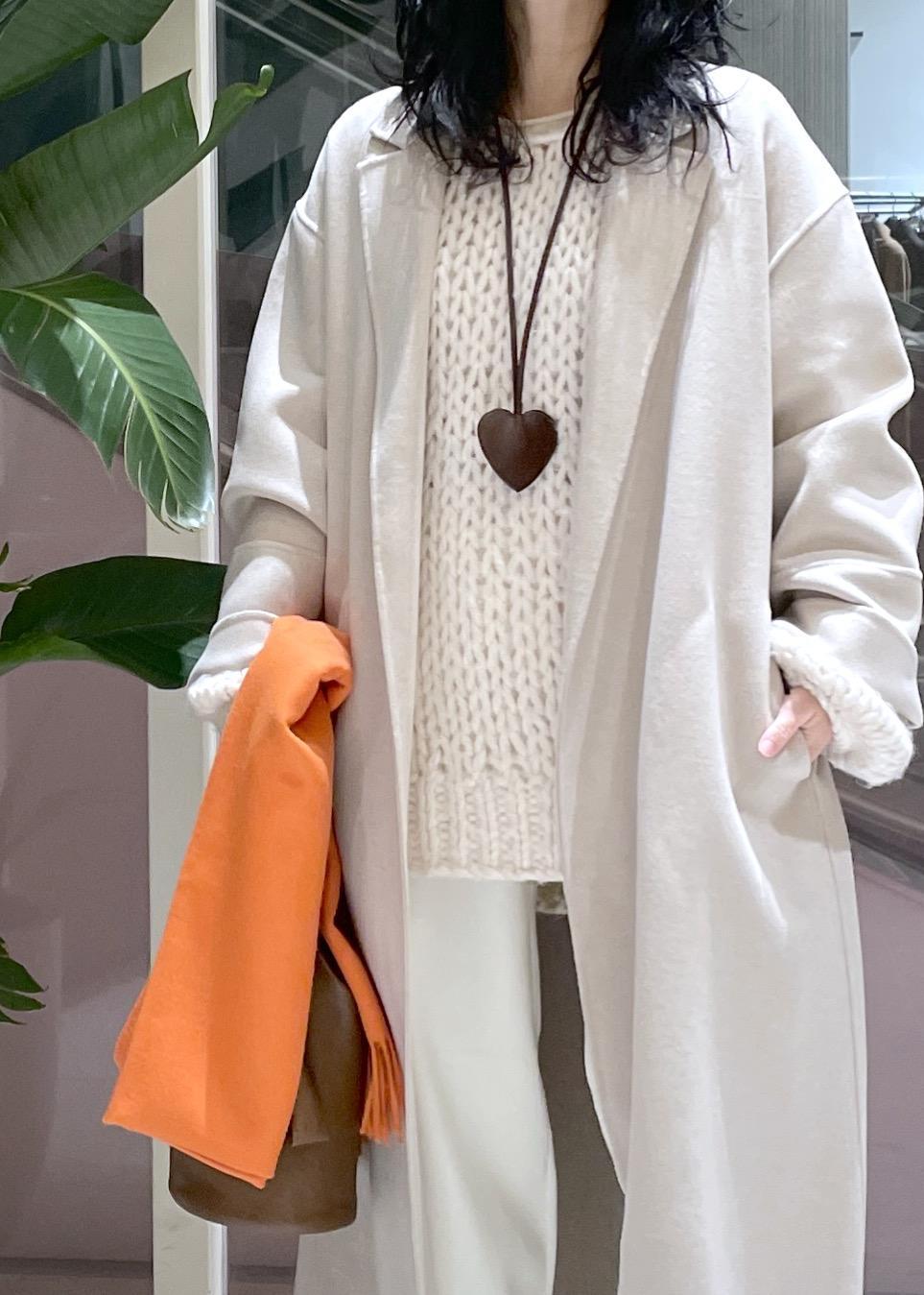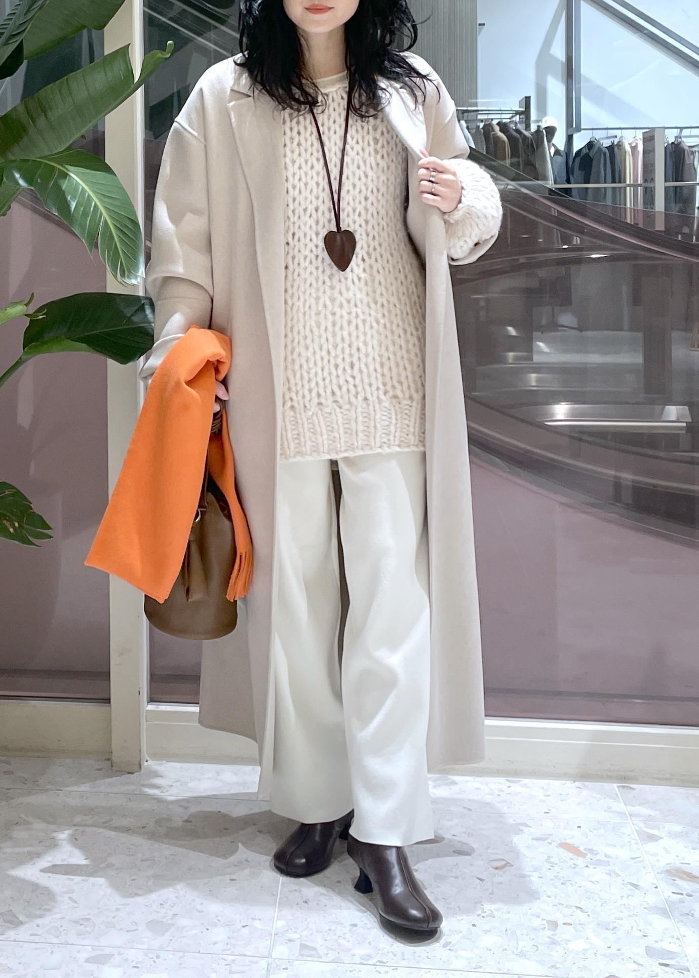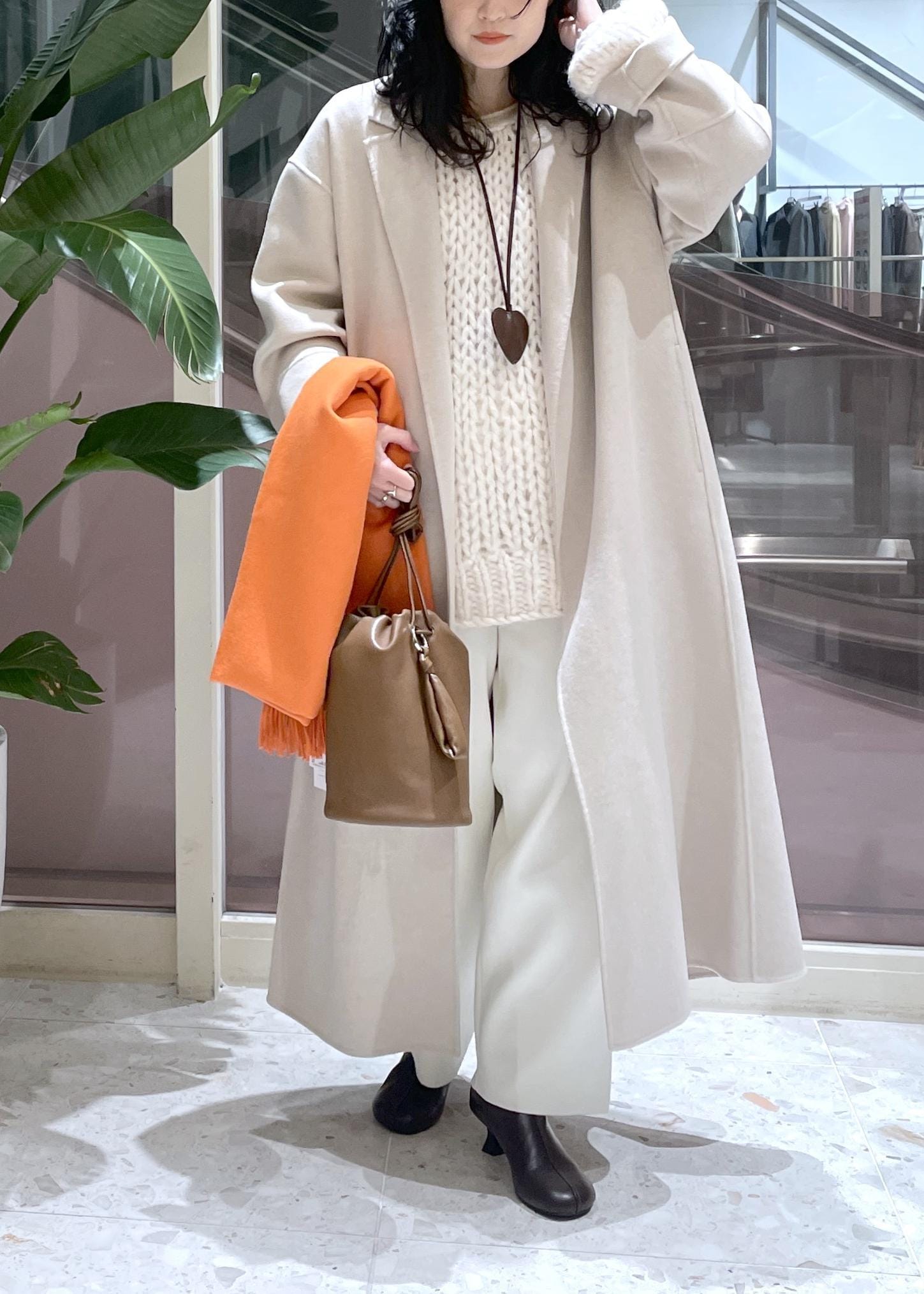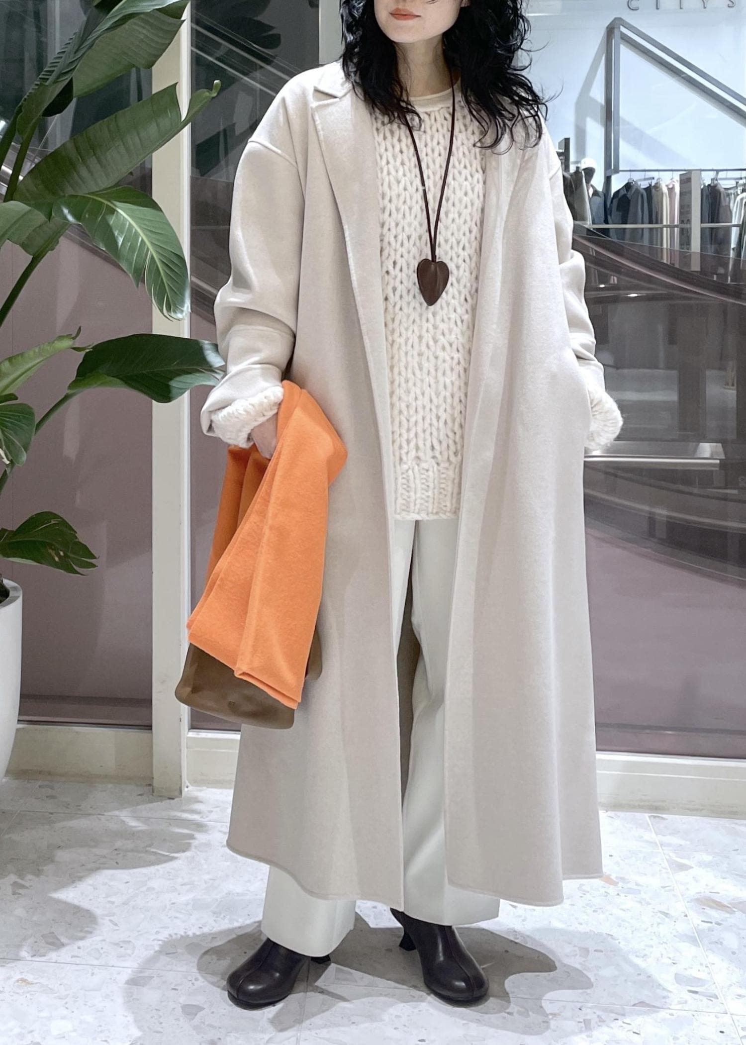 イタリアのColombo社のカシミヤ混ダブルフェイル素材を使ったコートは、淡いベージュだとより一層上質な素材感が引き立ちます。