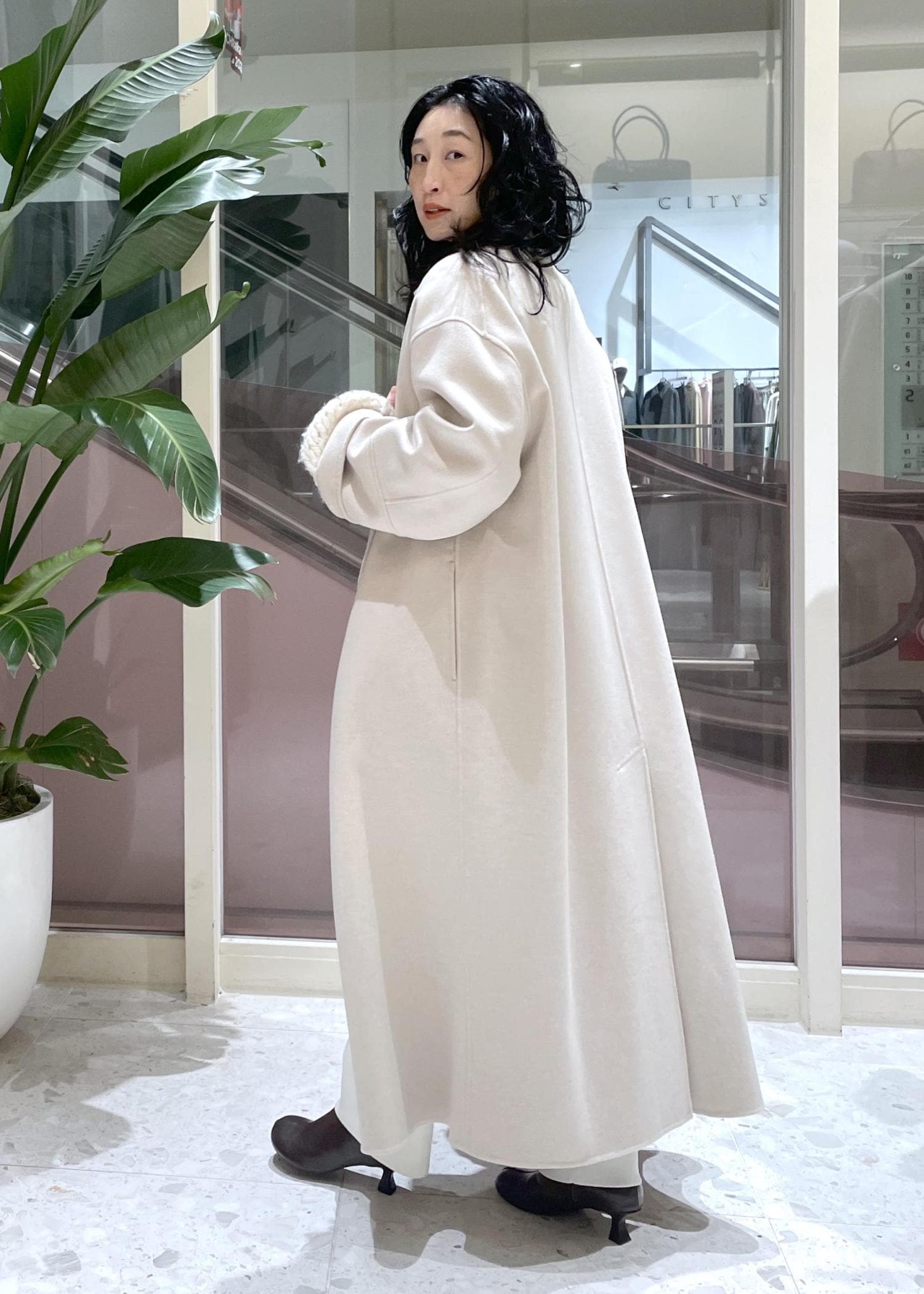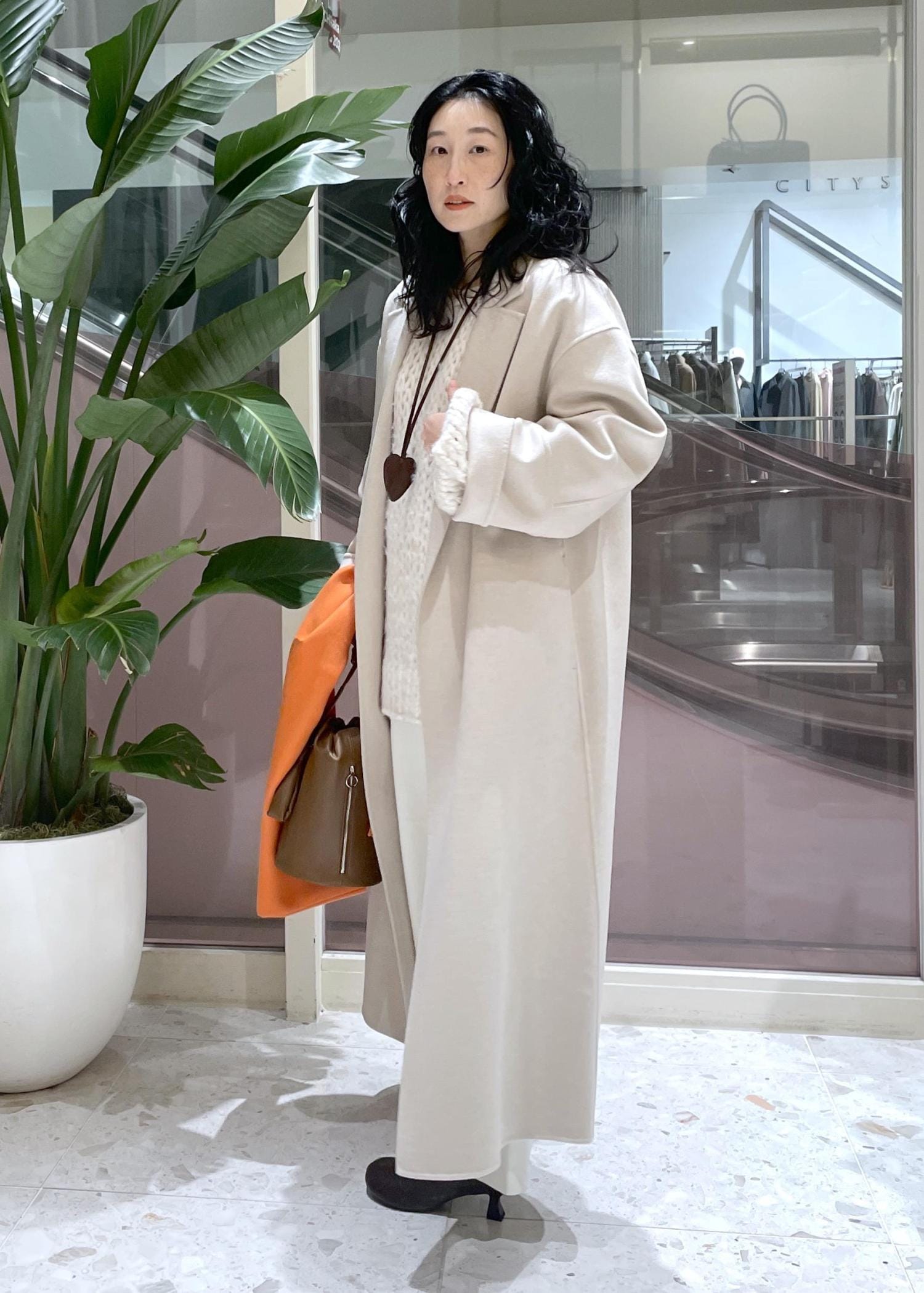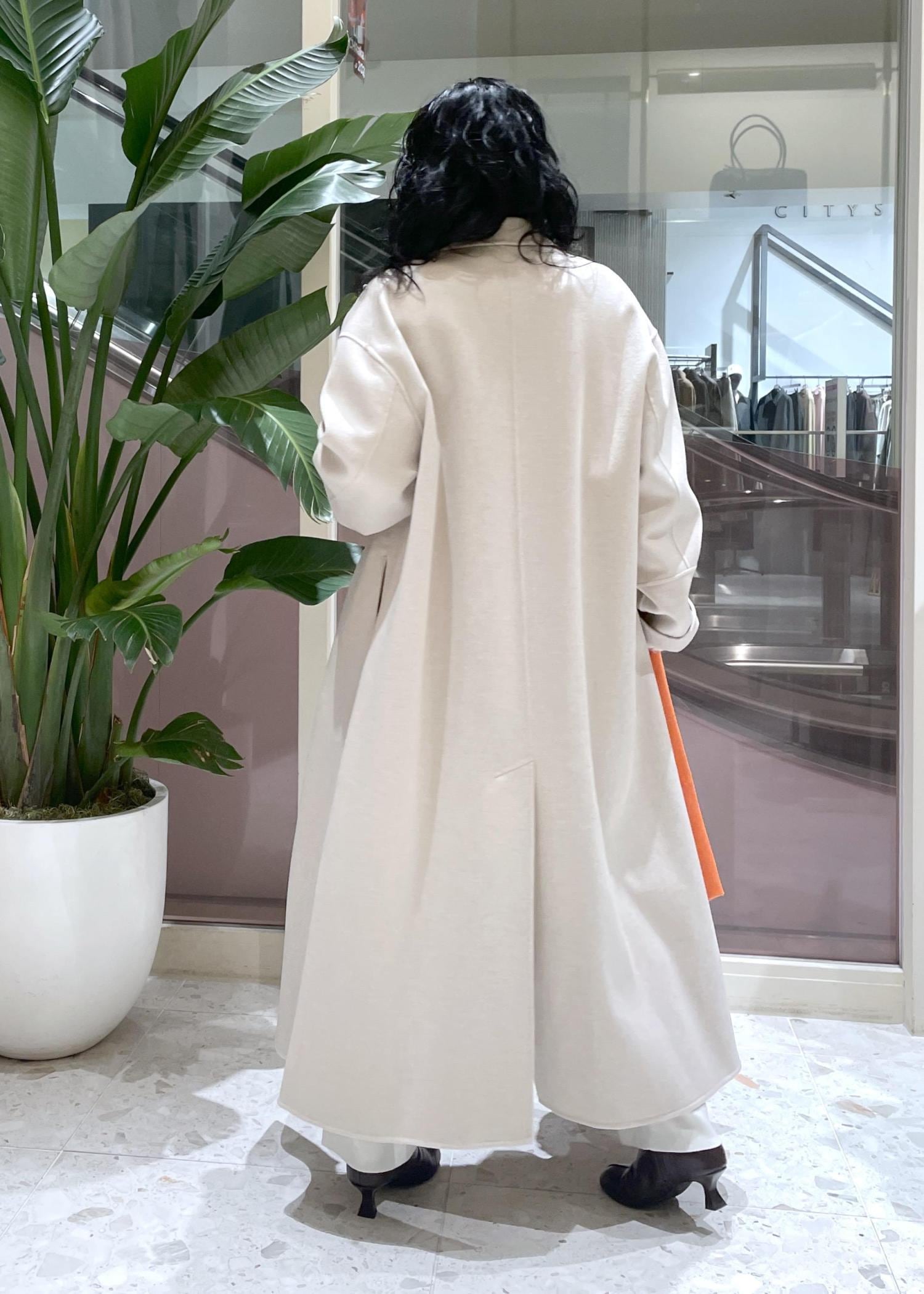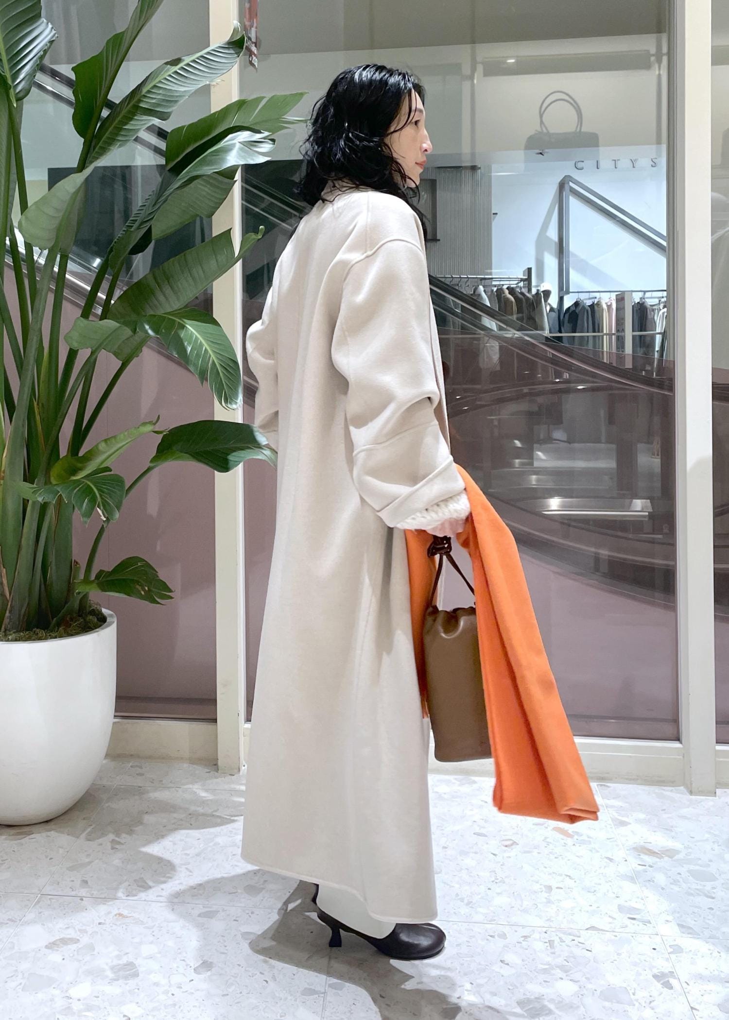 イタリアのColombo社のカシミヤ混ダブルフェイル素材を使ったコートは、淡いベージュだとより一層上質な素材感が引き立ちます。