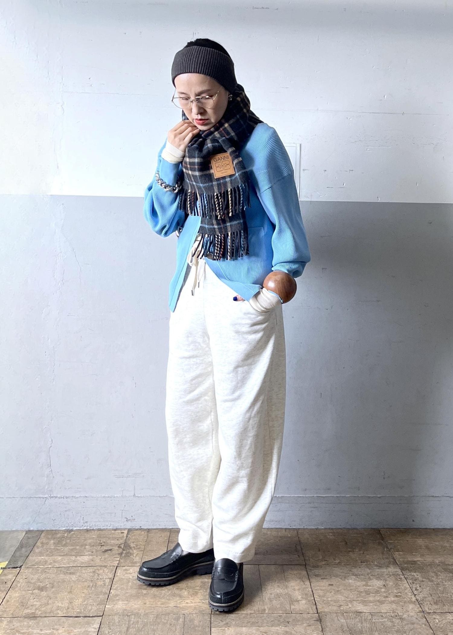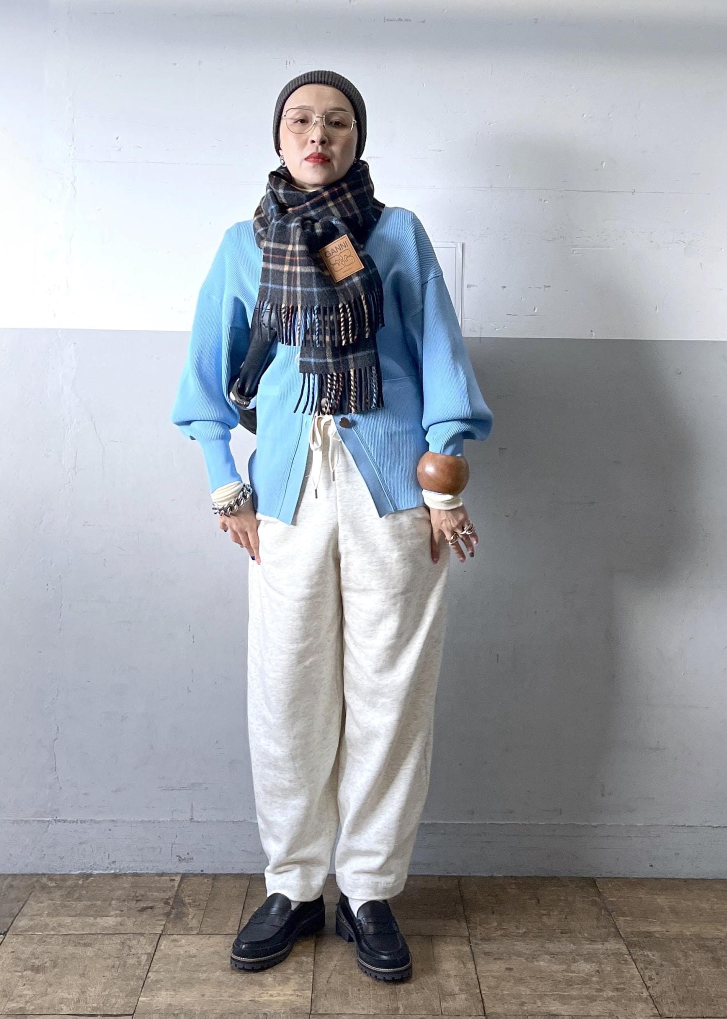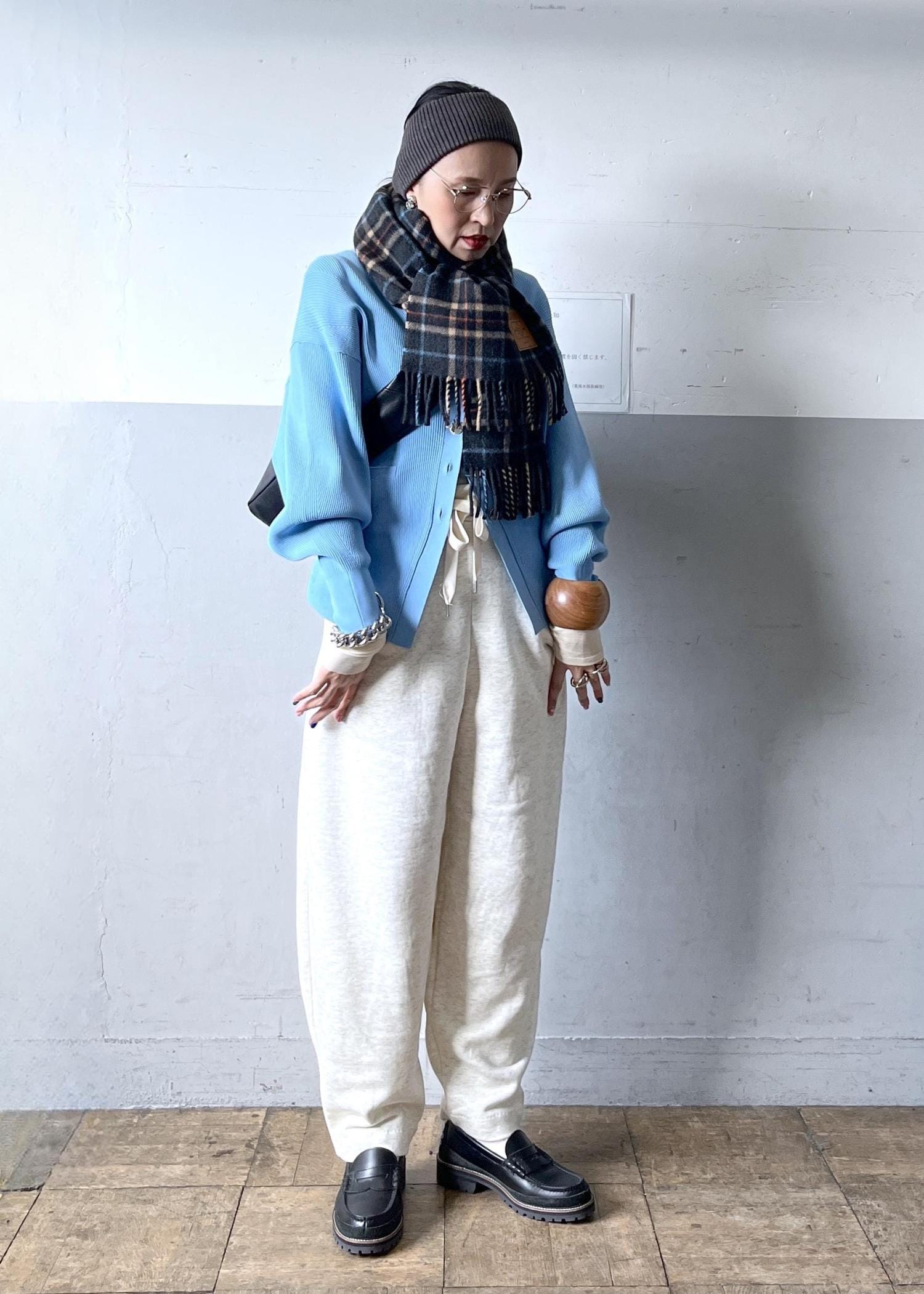 ブルーのカーディガンを主役に、スウェットパンツで抜け感をプラス。