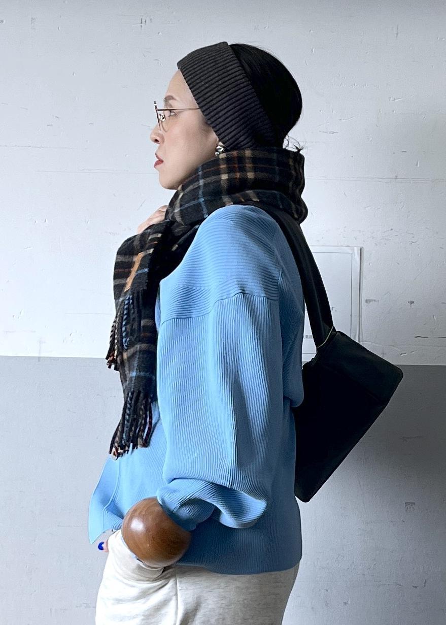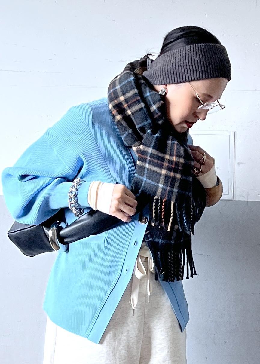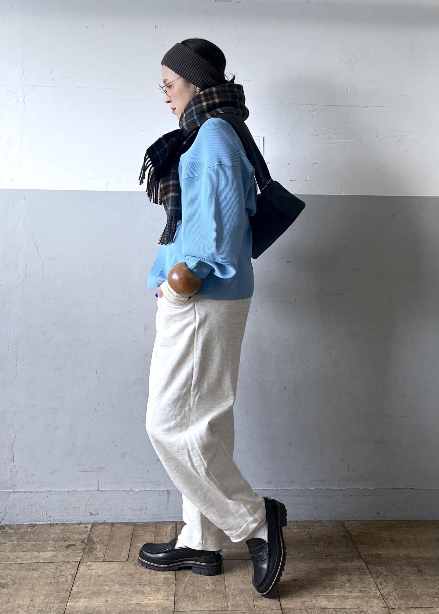 ブルーのカーディガンを主役に、スウェットパンツで抜け感をプラス。