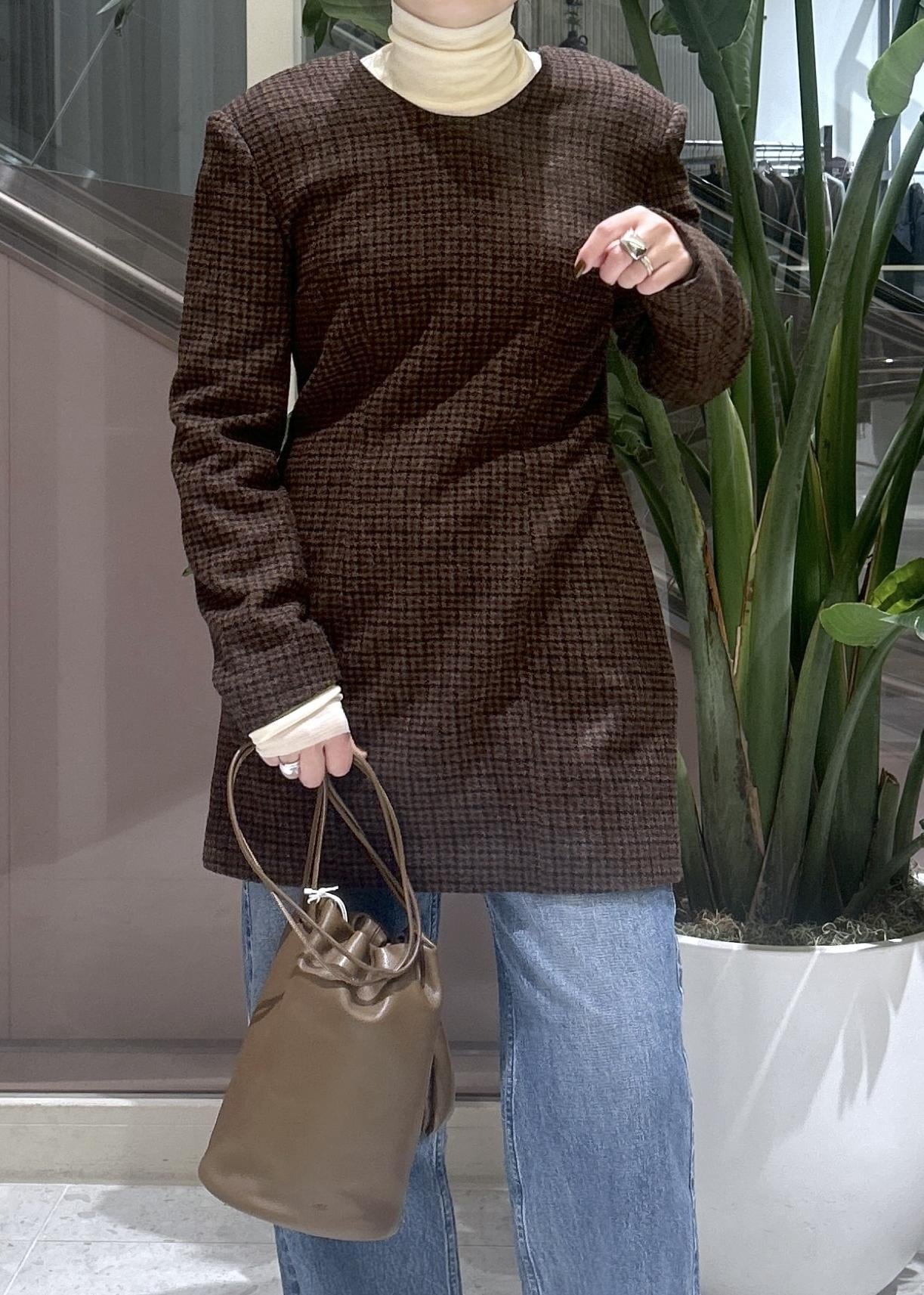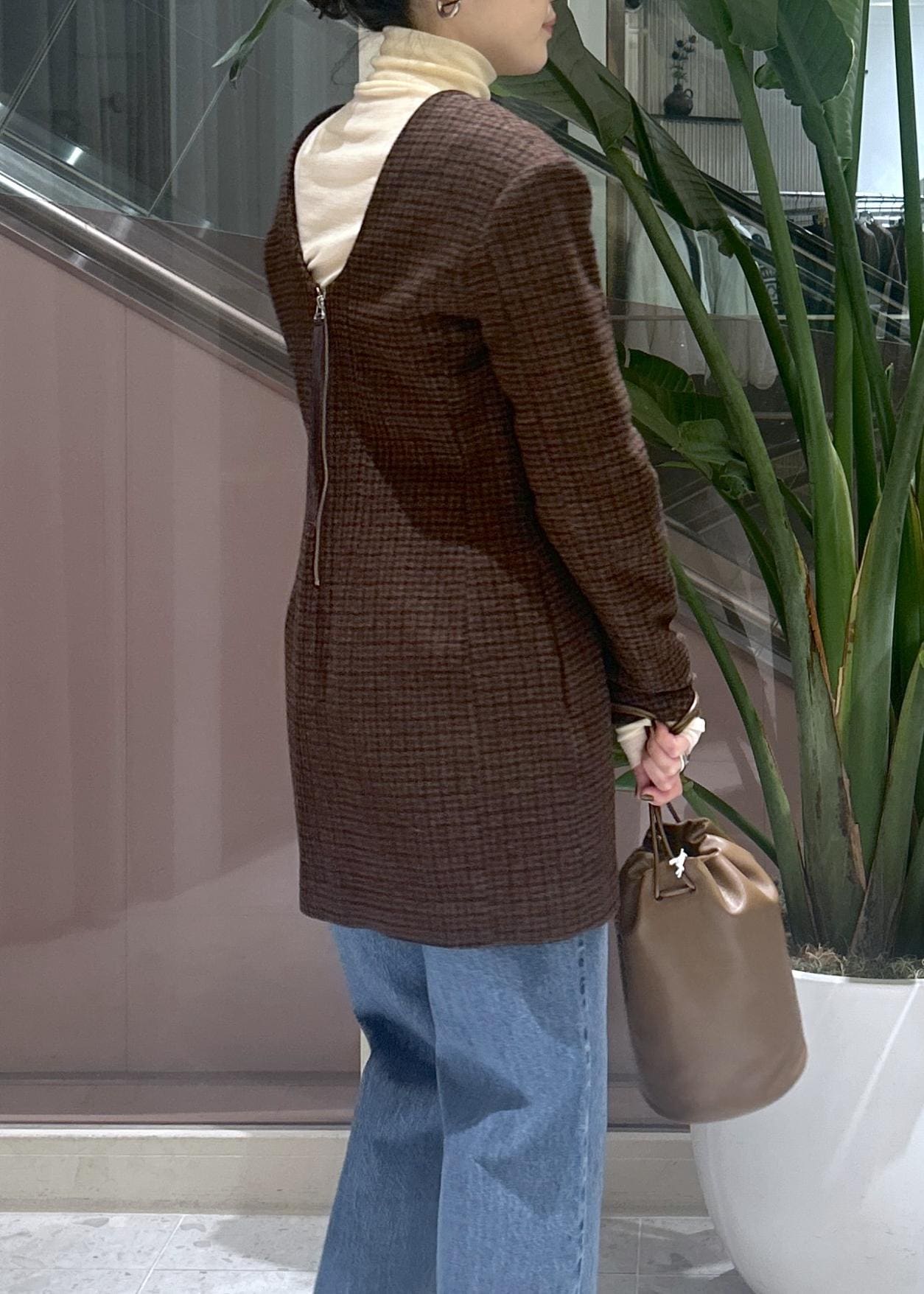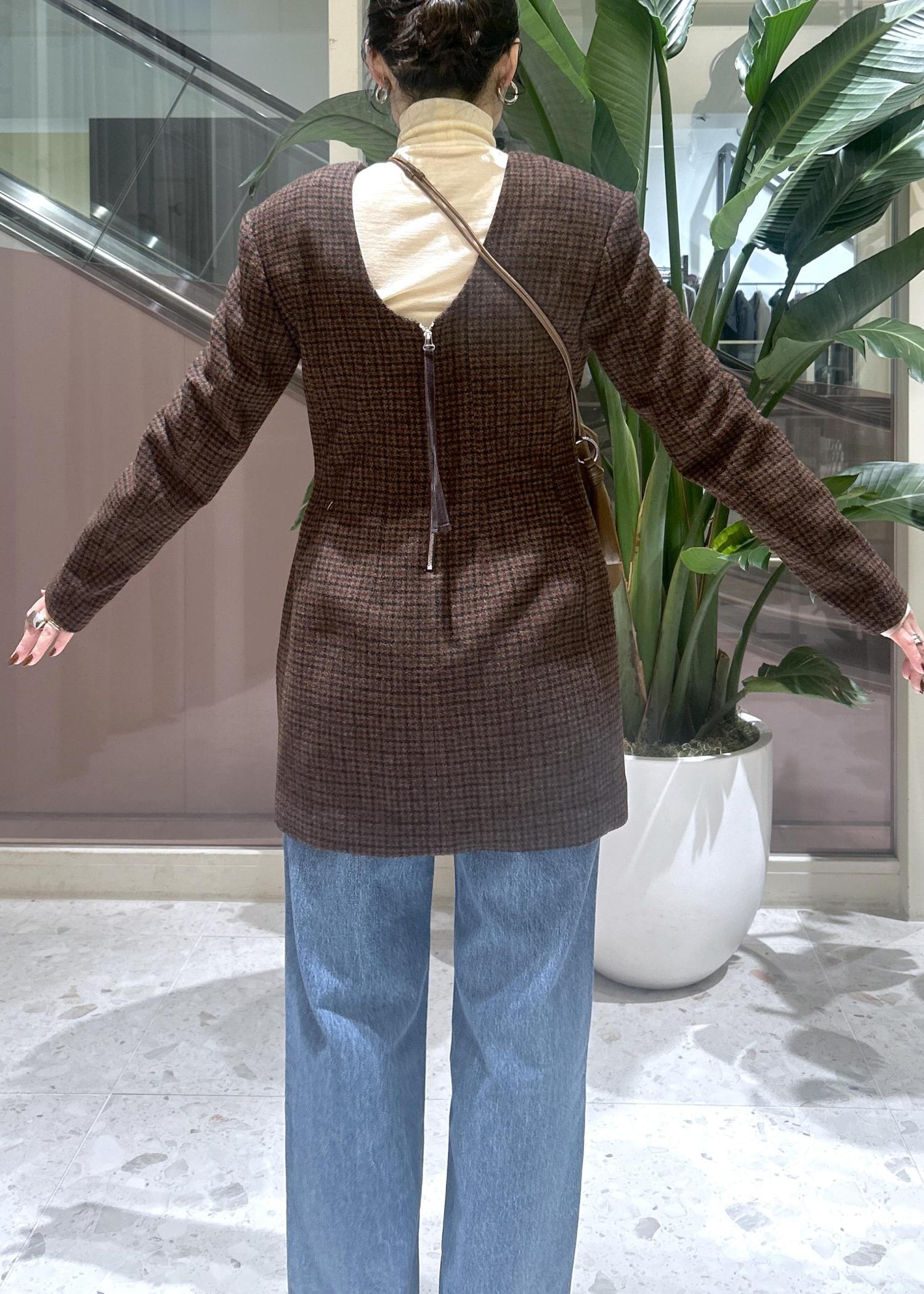 JANE SMITHのチェック柄ミニ丈ワンピースはデニムとレイヤードして大人が着れる可愛いスタイリングに。