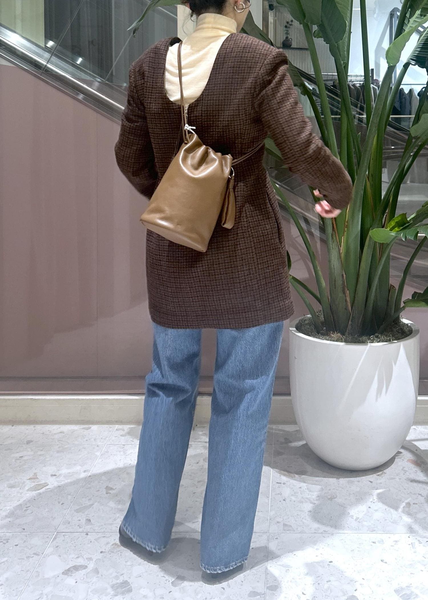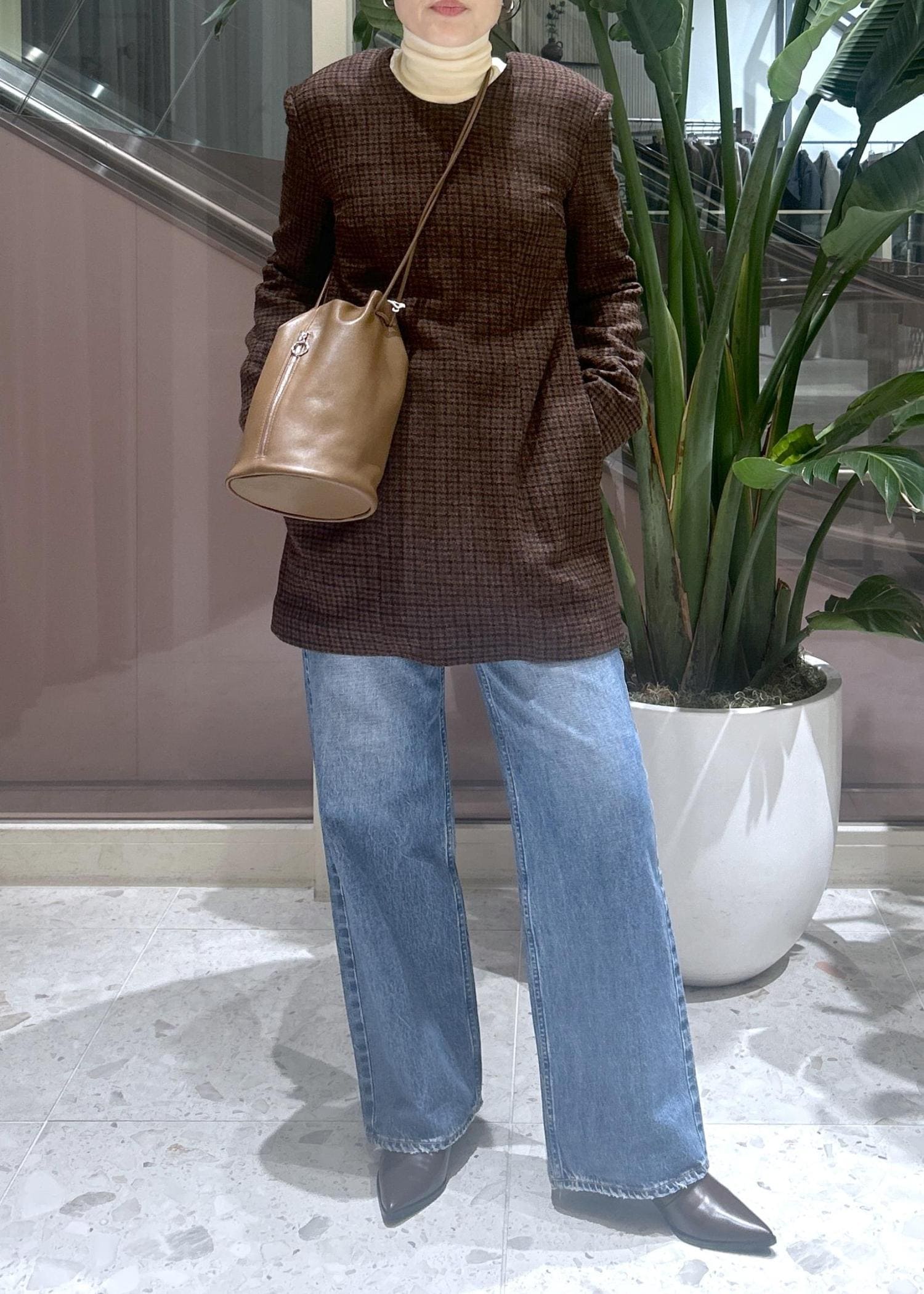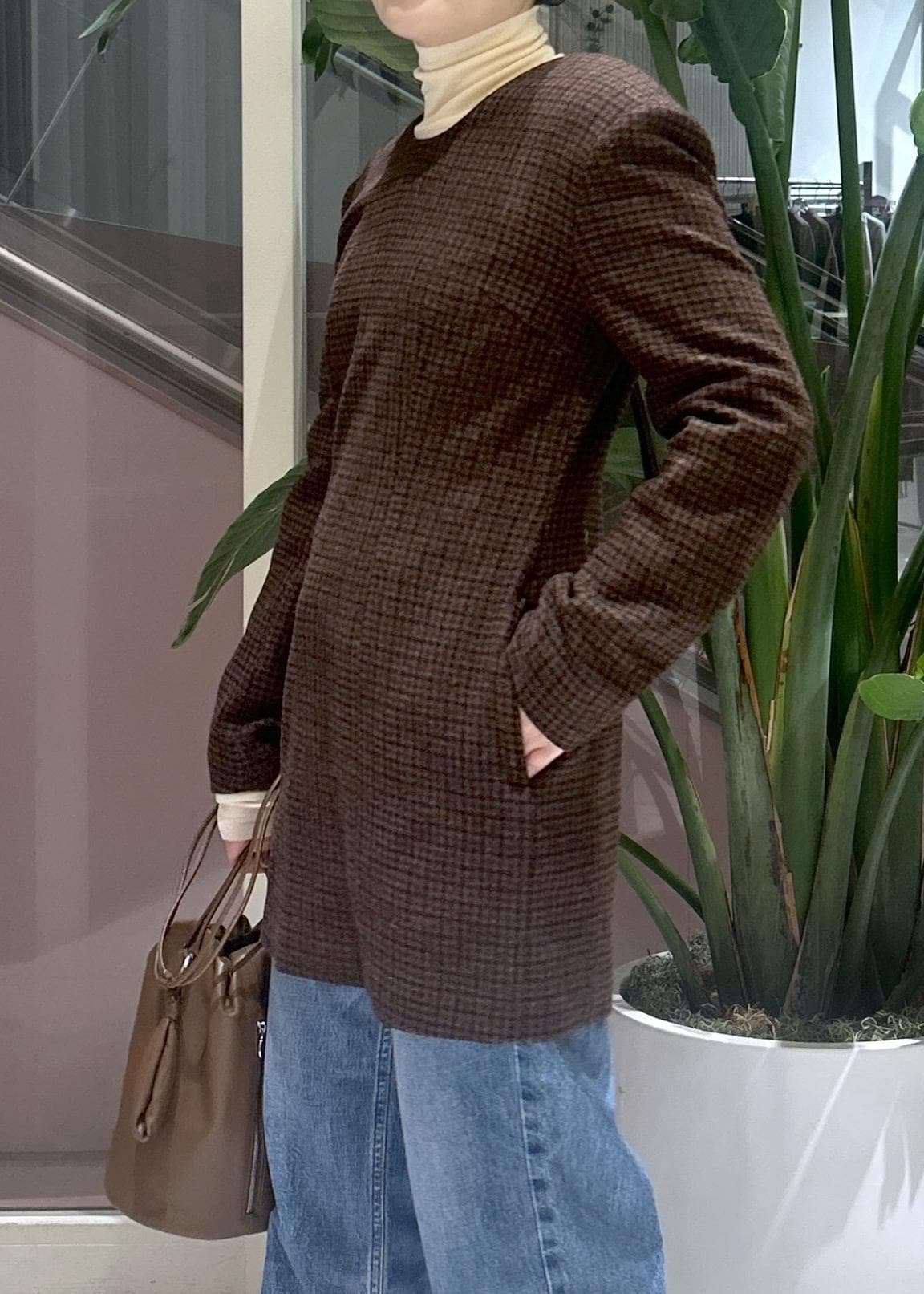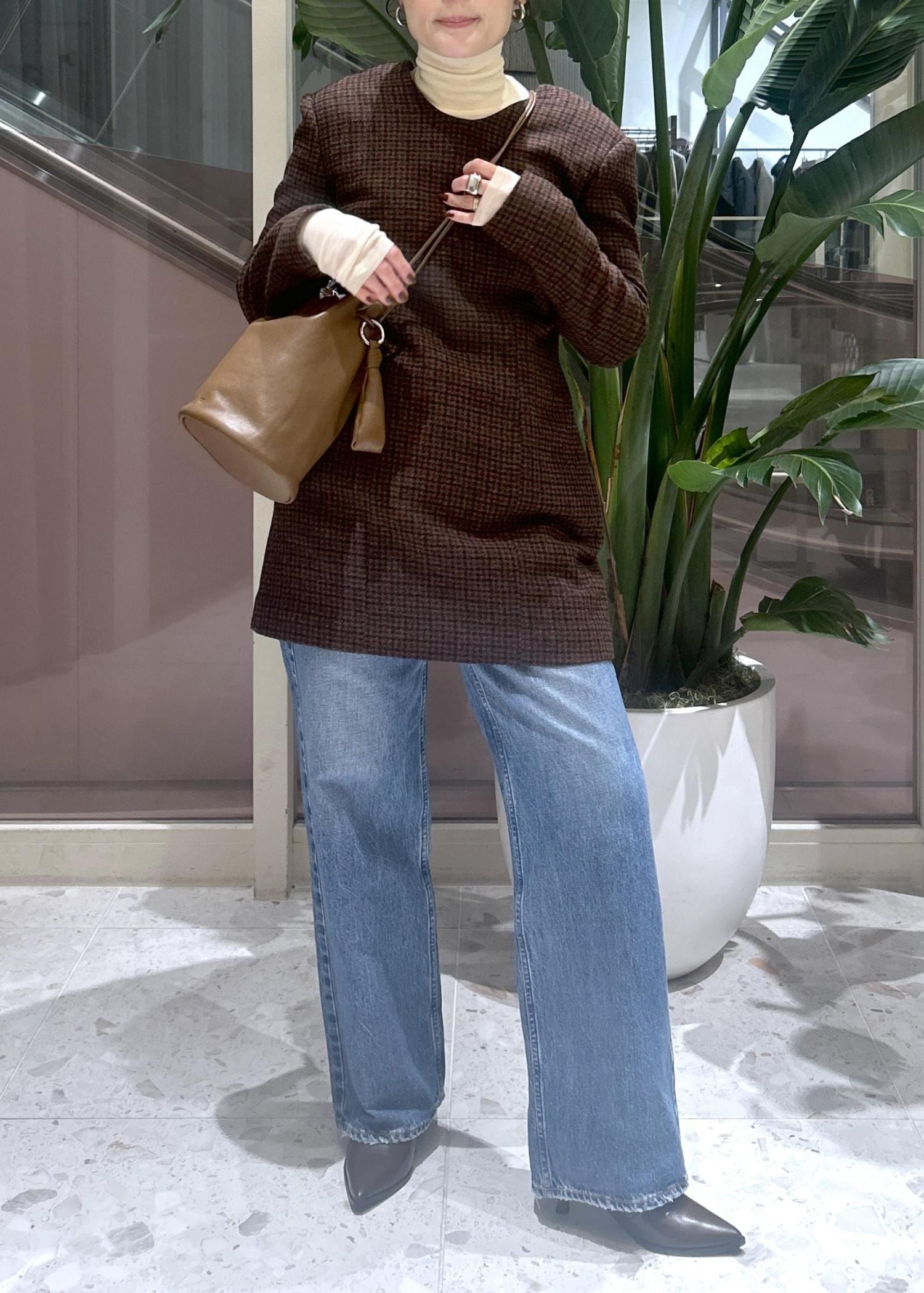 JANE SMITHのチェック柄ミニ丈ワンピースはデニムとレイヤードして大人が着れる可愛いスタイリングに。
