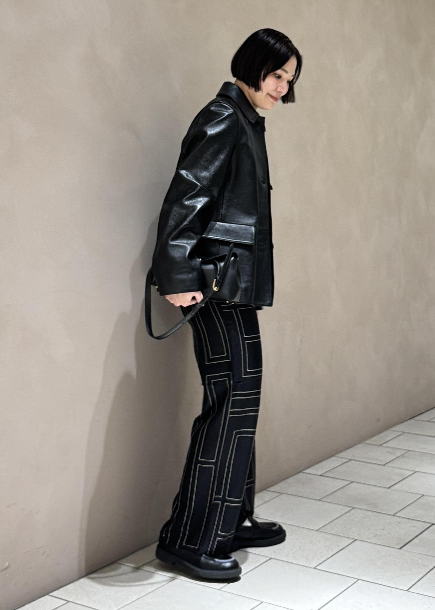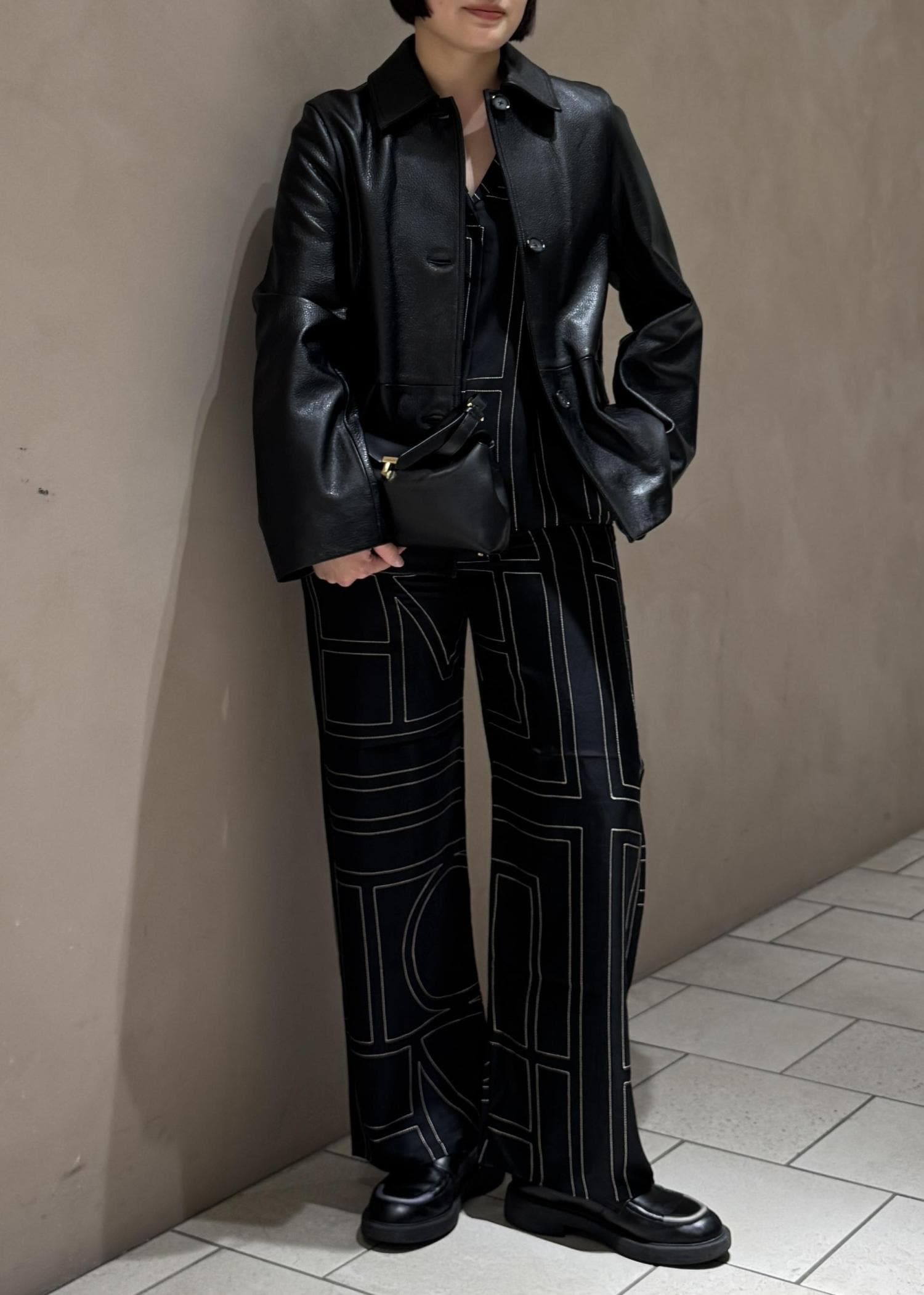 トップスとボトムスにはモノグラム柄のシルクシャツとパンツのセットアップで着用。