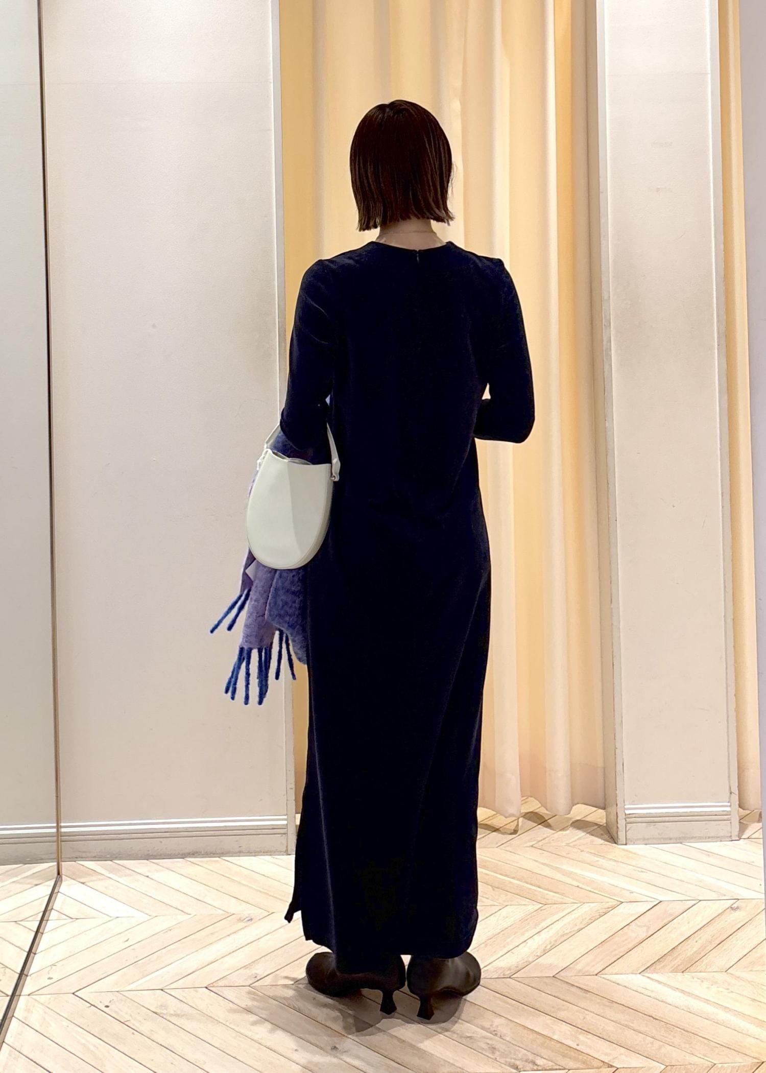 程よくツヤ感のあるベロアワンピースは、体のラインを拾うタイトなシルエットとキュッとしまるネイビーカラーの合わせが着るだけで、上品見えします☺︎