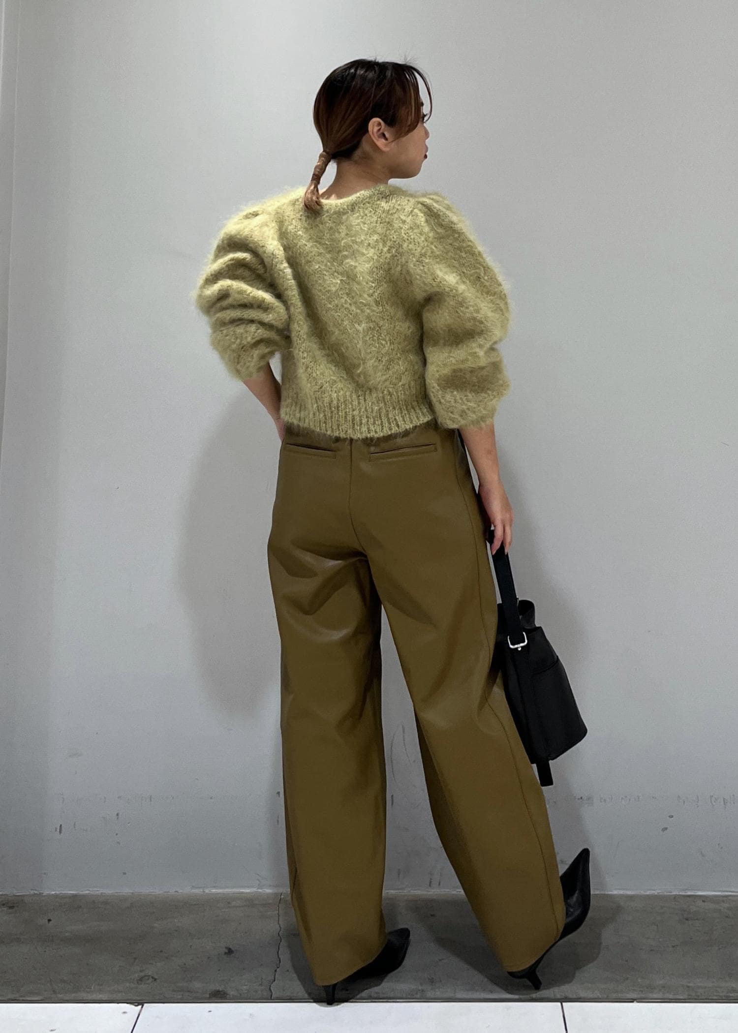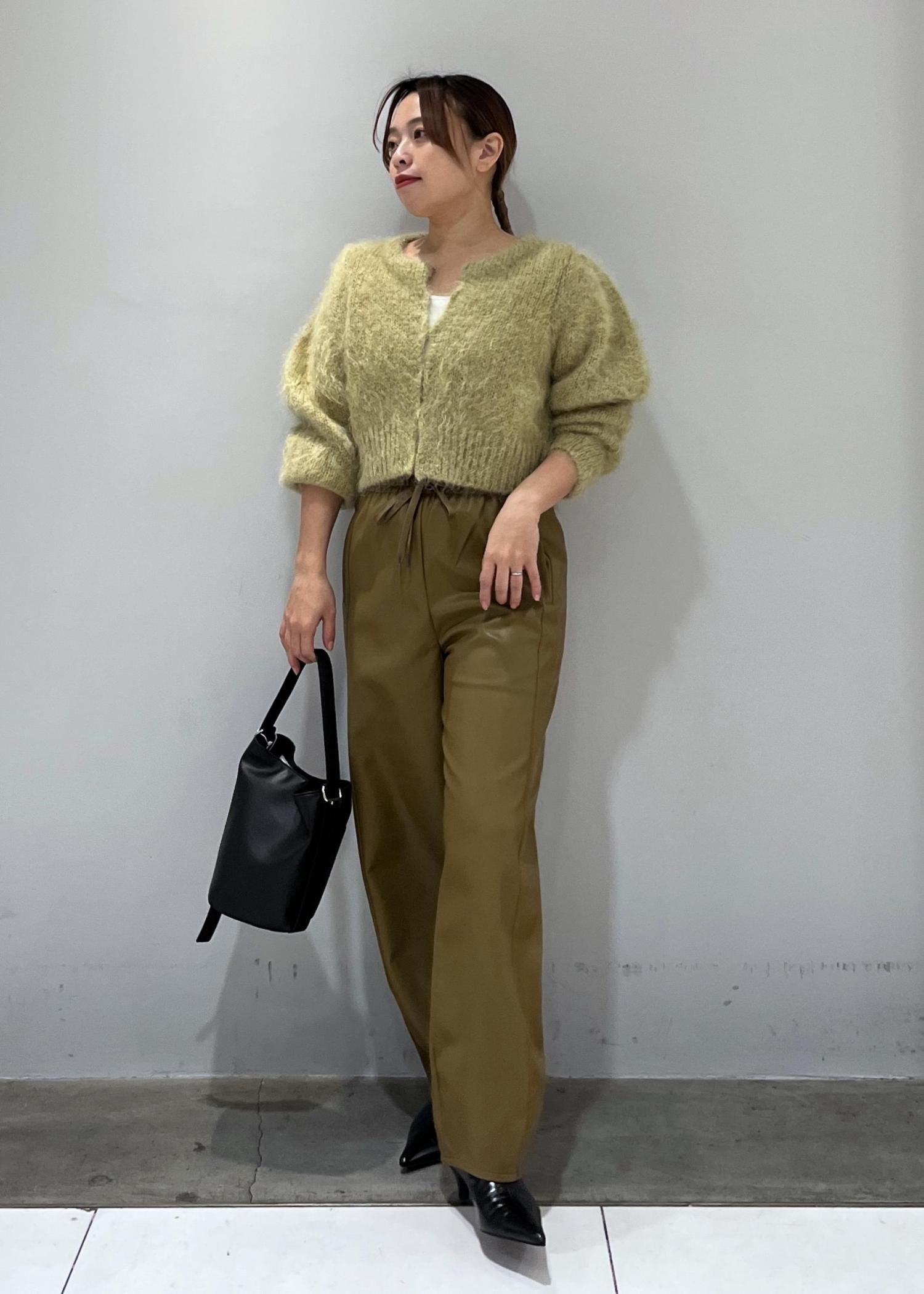 グリーンのカラーで華を添えながら、周りと差がつくベージュカラーのレザーパンツを合わせました☺︎
