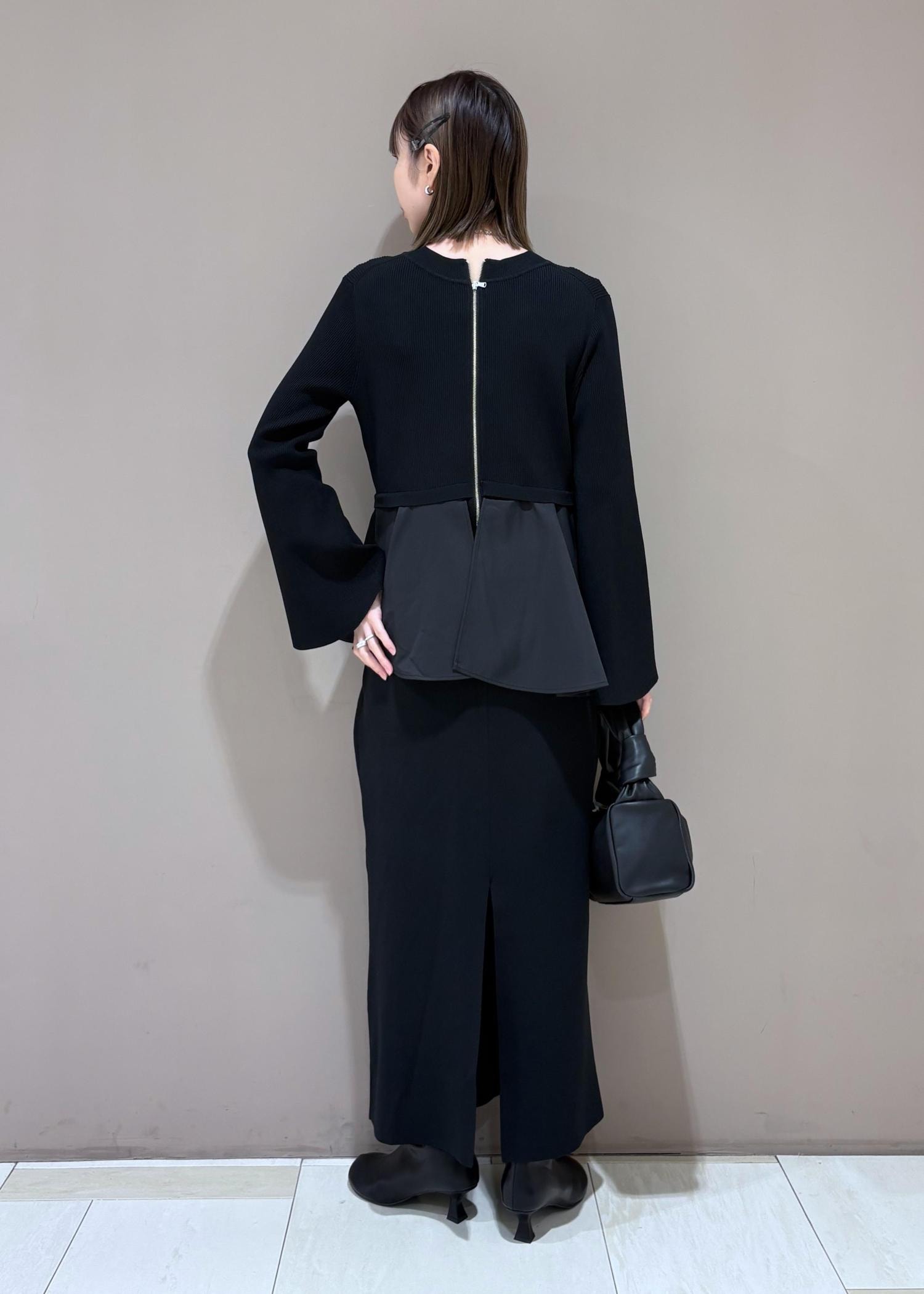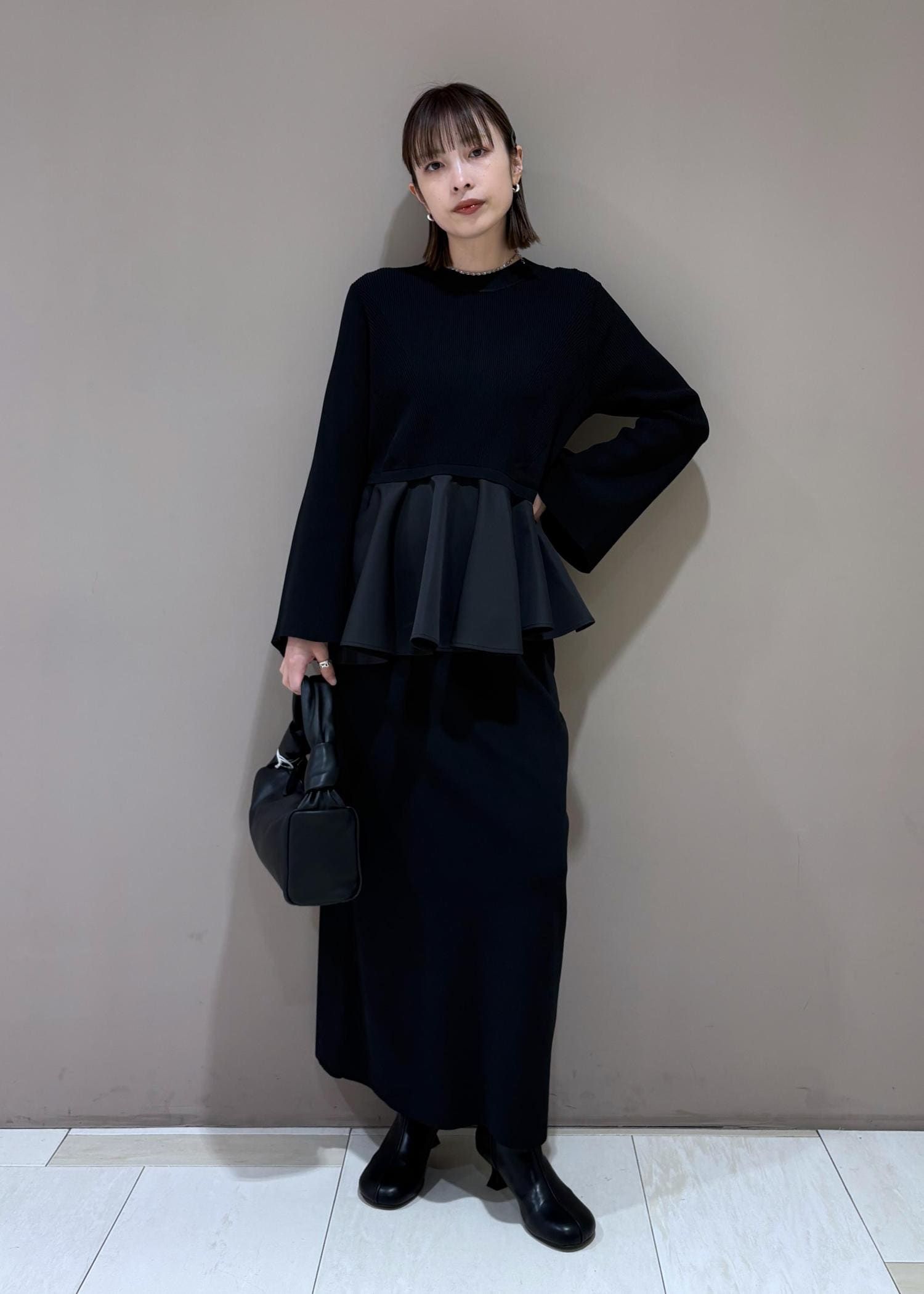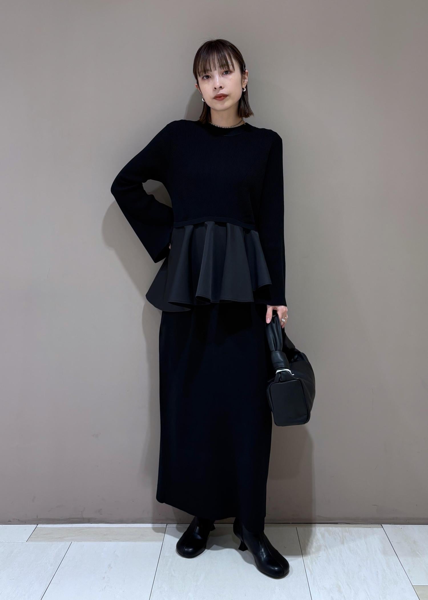 ADAM ET ROPÉ FEMME【サステナブル】ペプラムコンビニットワンピース/オケージョン対応ブラック / F¥23,100レビュー162cm、フリーサイズ着用。