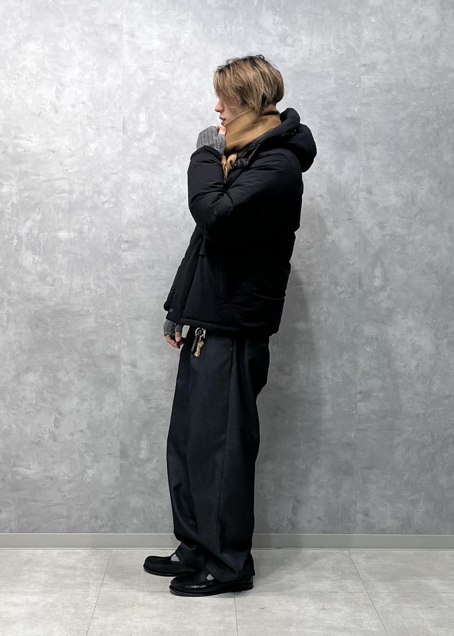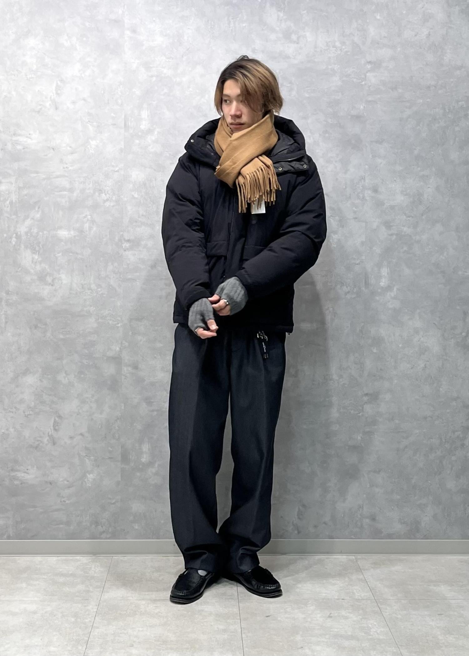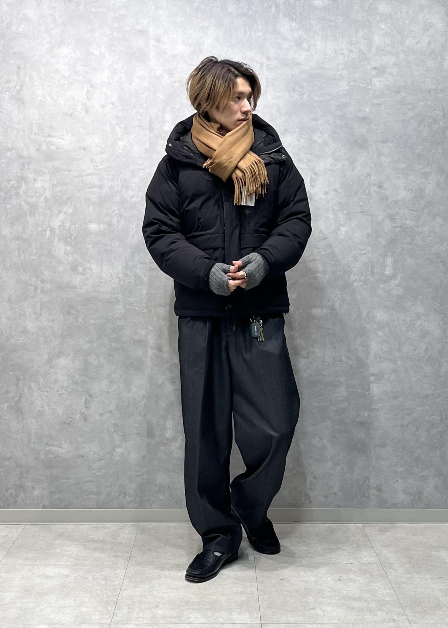 重くなりすぎないようにマフラーとハンドウォーマーでカラーを足したスタイリングにしました。