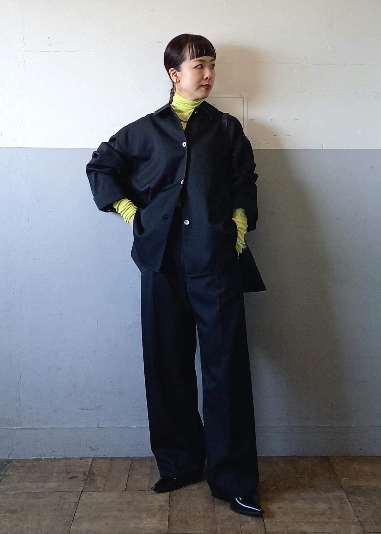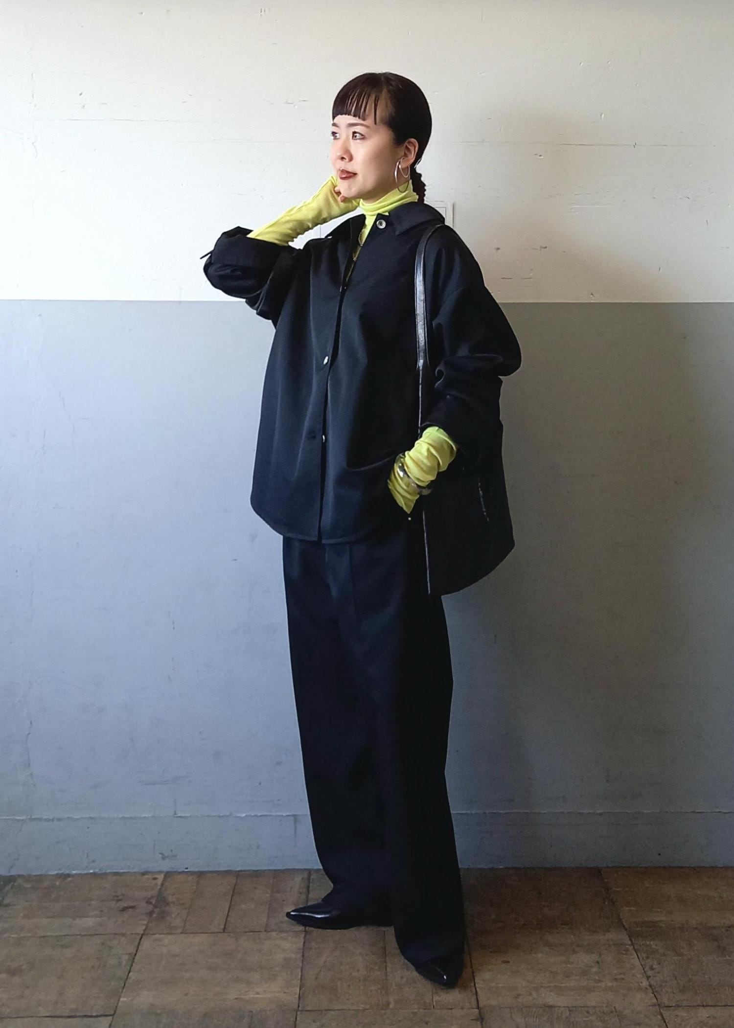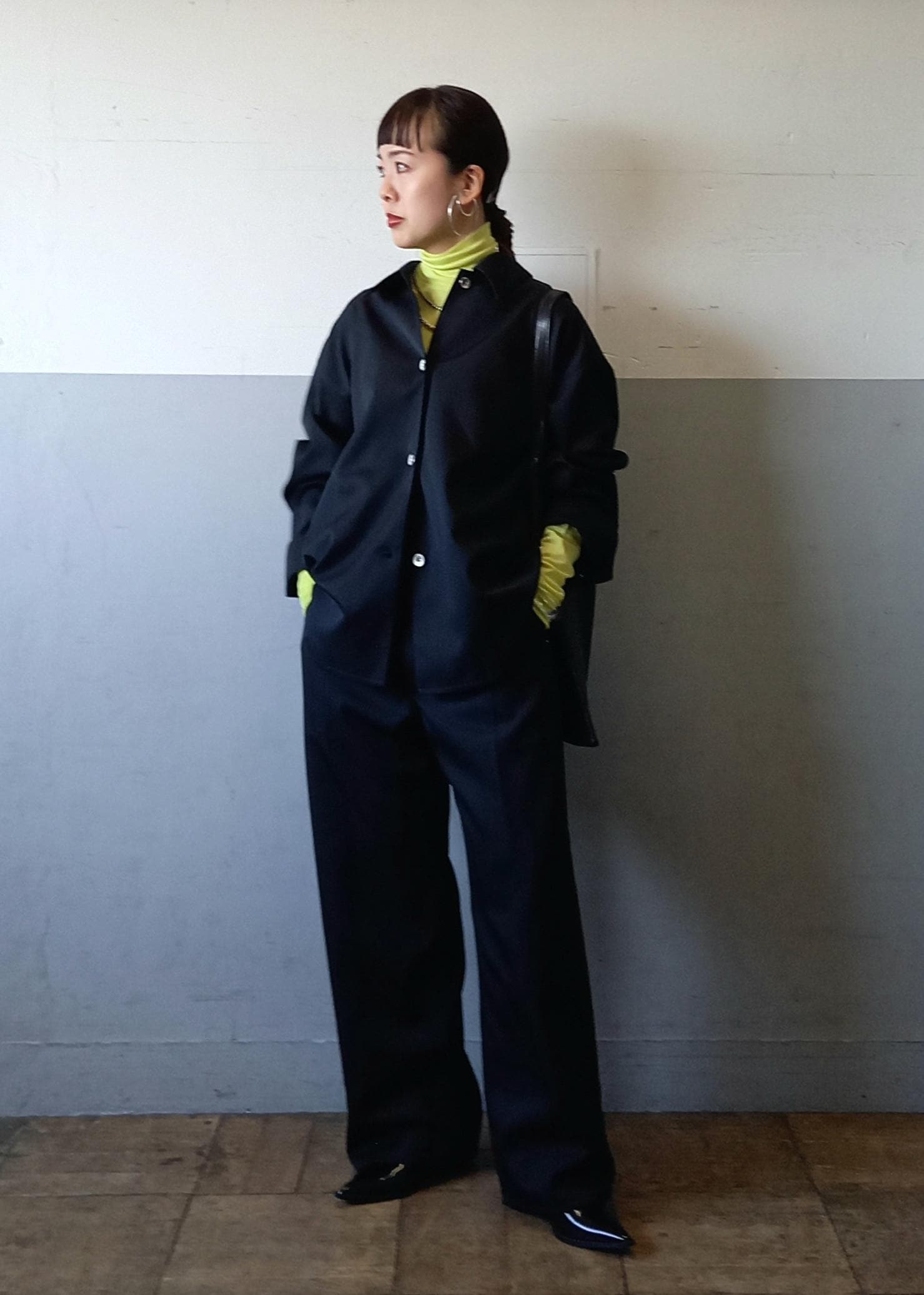 ポリエステルウールの重厚感もありながら、柔らかな抜け感のあるシルエットが最高です。